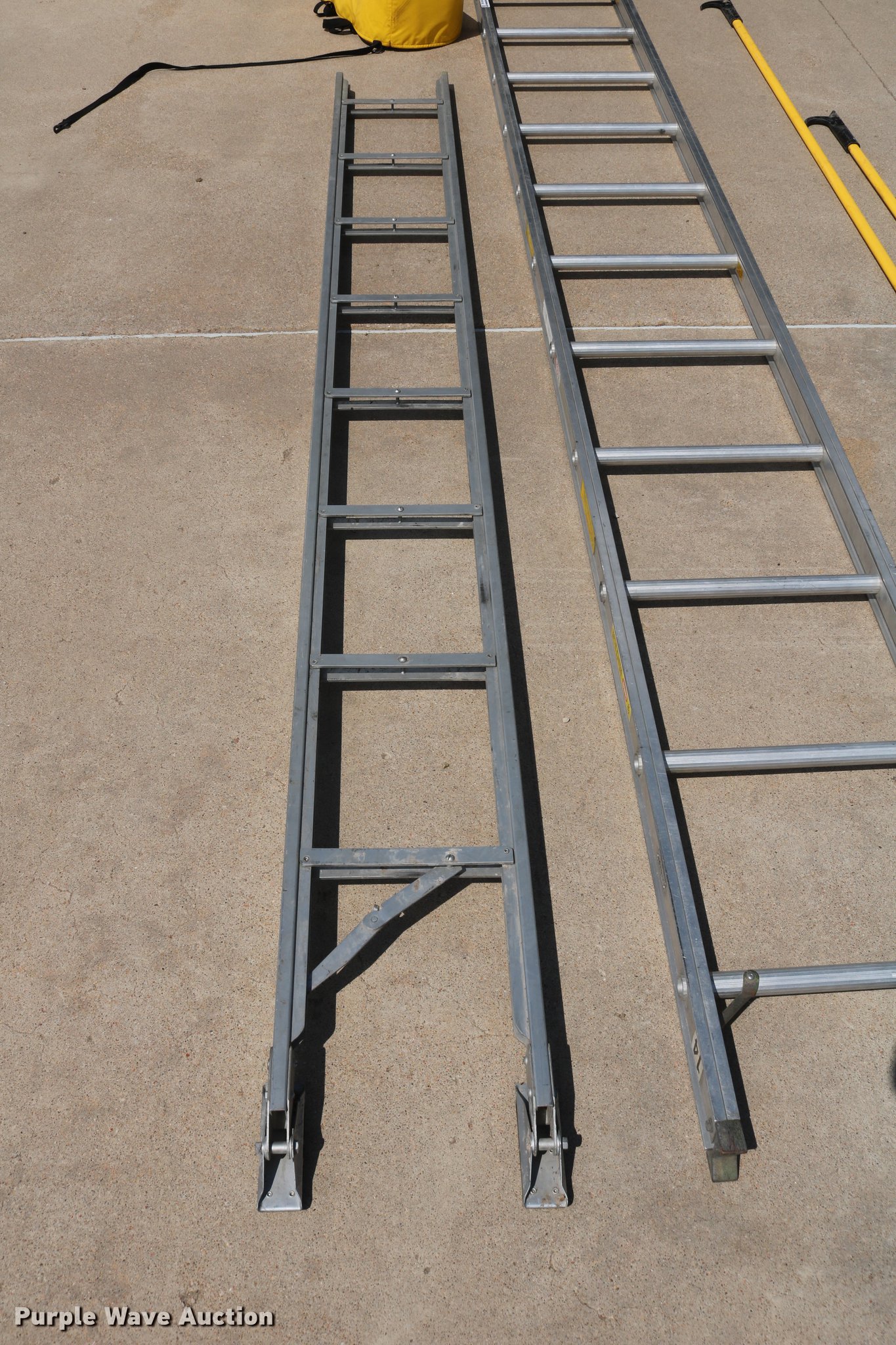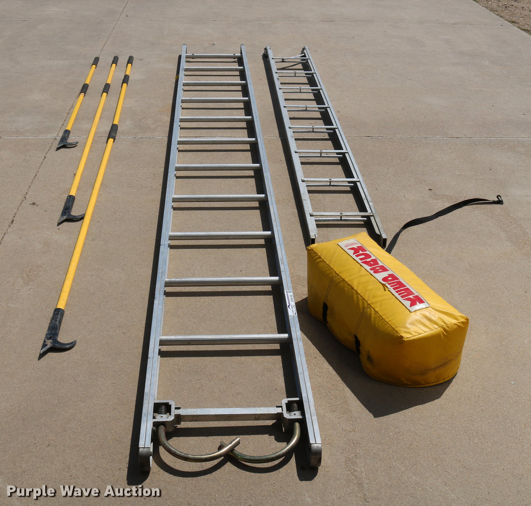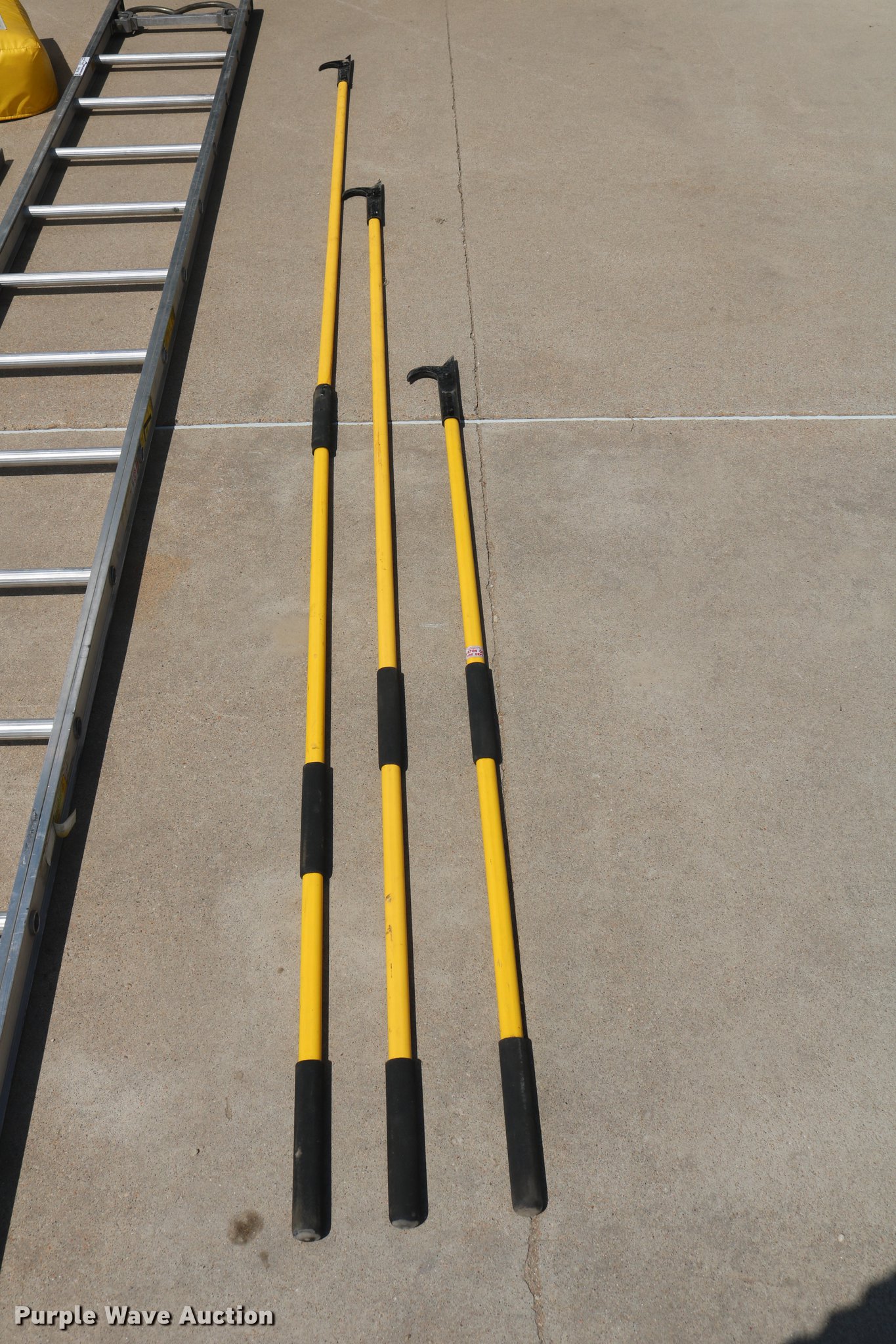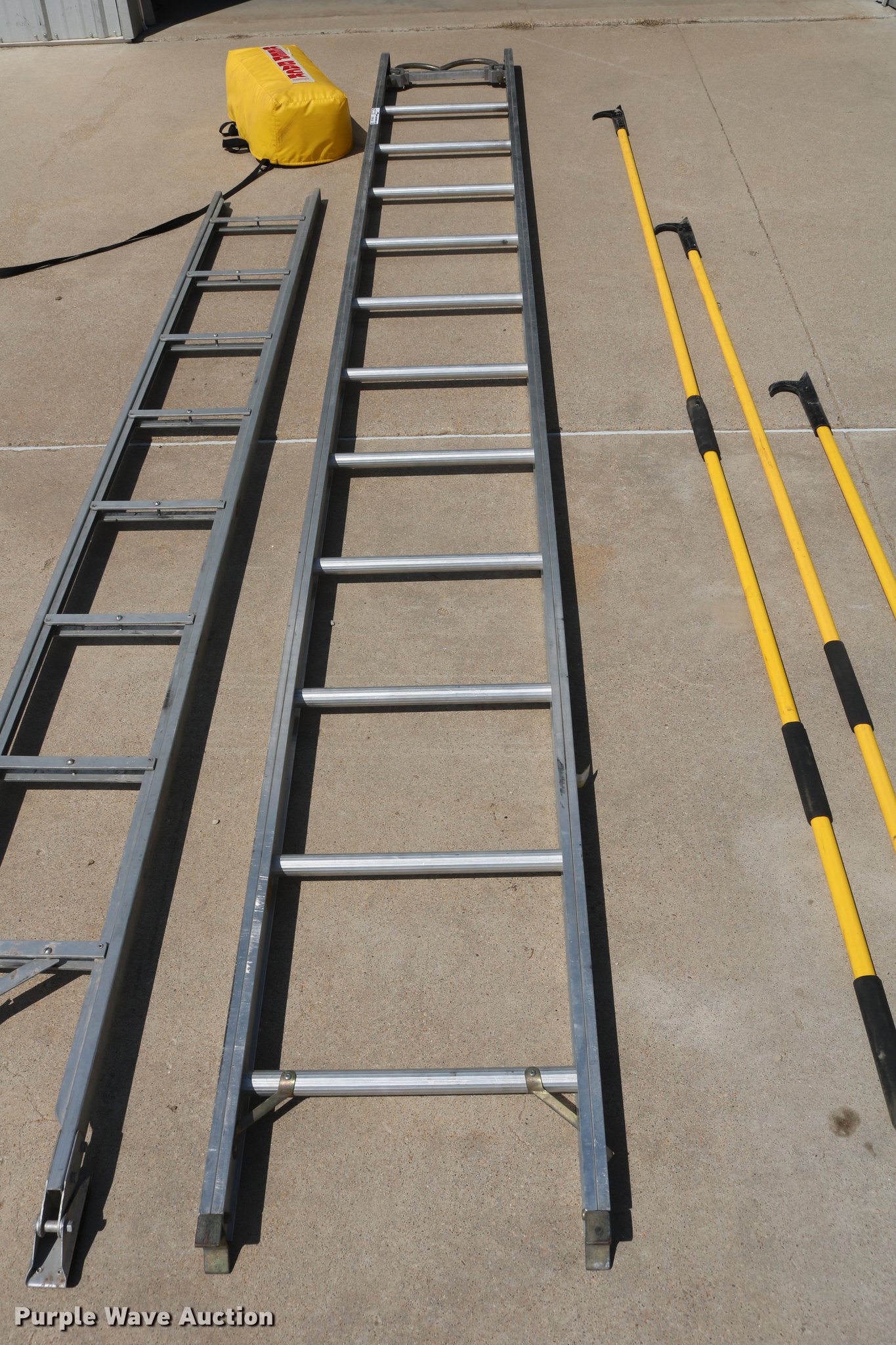 Purple Wave is selling a used Tools in Kansas. This item is a Tools with the following: 14' aluminum roof ladder, 10' aluminum attic ladder, 6' pike pole, 9' pike pole, 12' pike pole, Ladder end pad