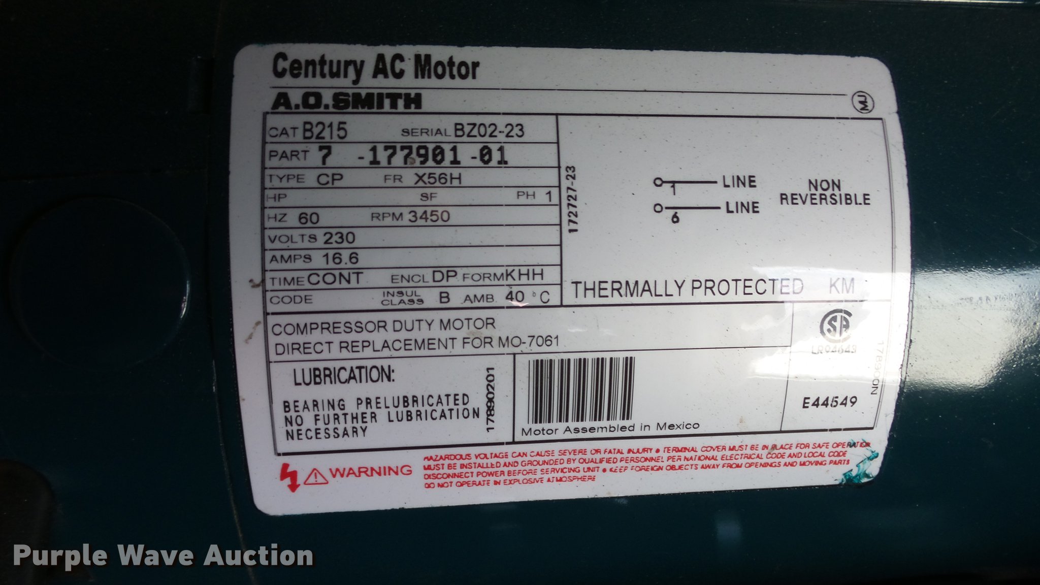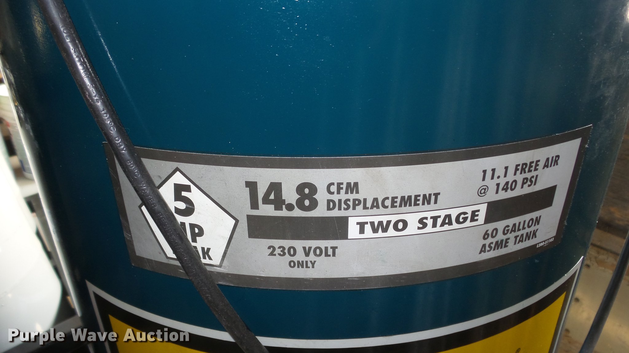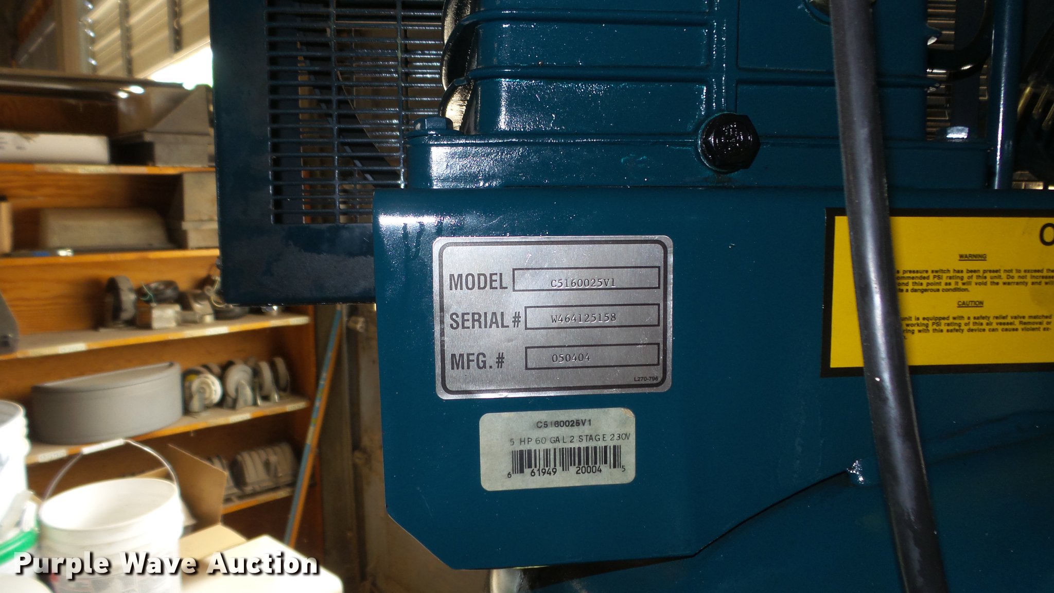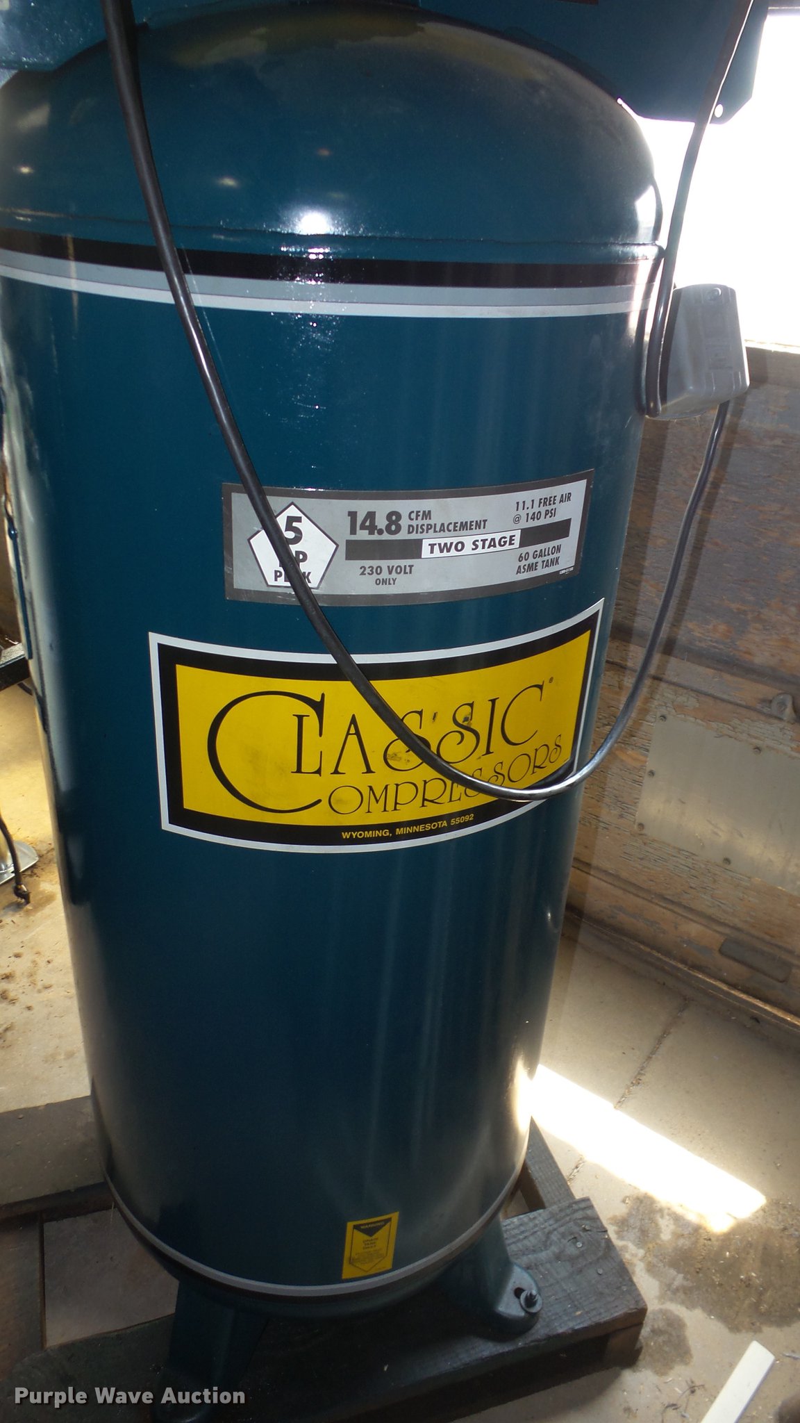 Purple Wave is selling a used Air Compressor in Kansas. This item is a Classic air compressor with the following: 5 HP, 230V, Single phase, 140 psi, 60 gallon tank