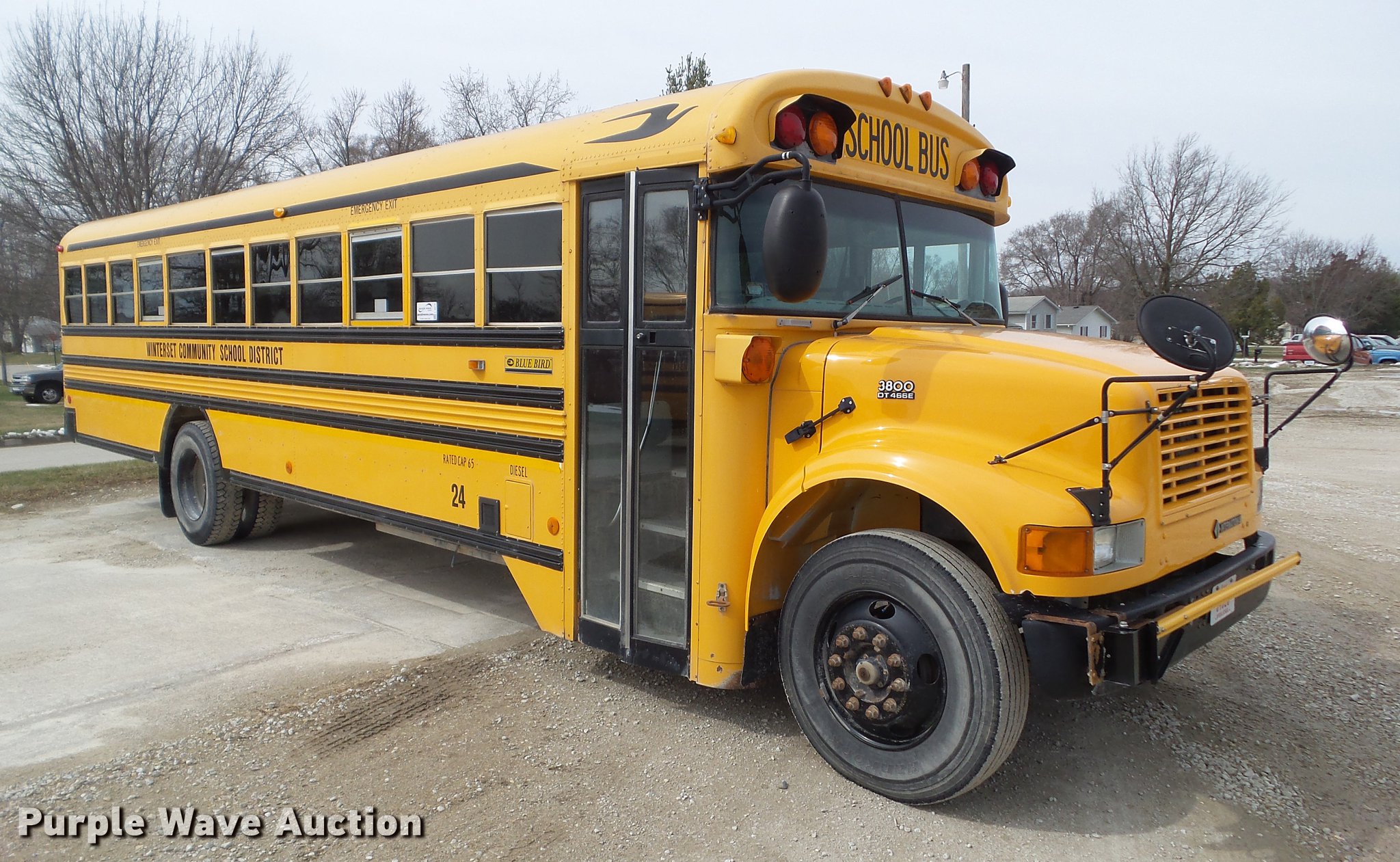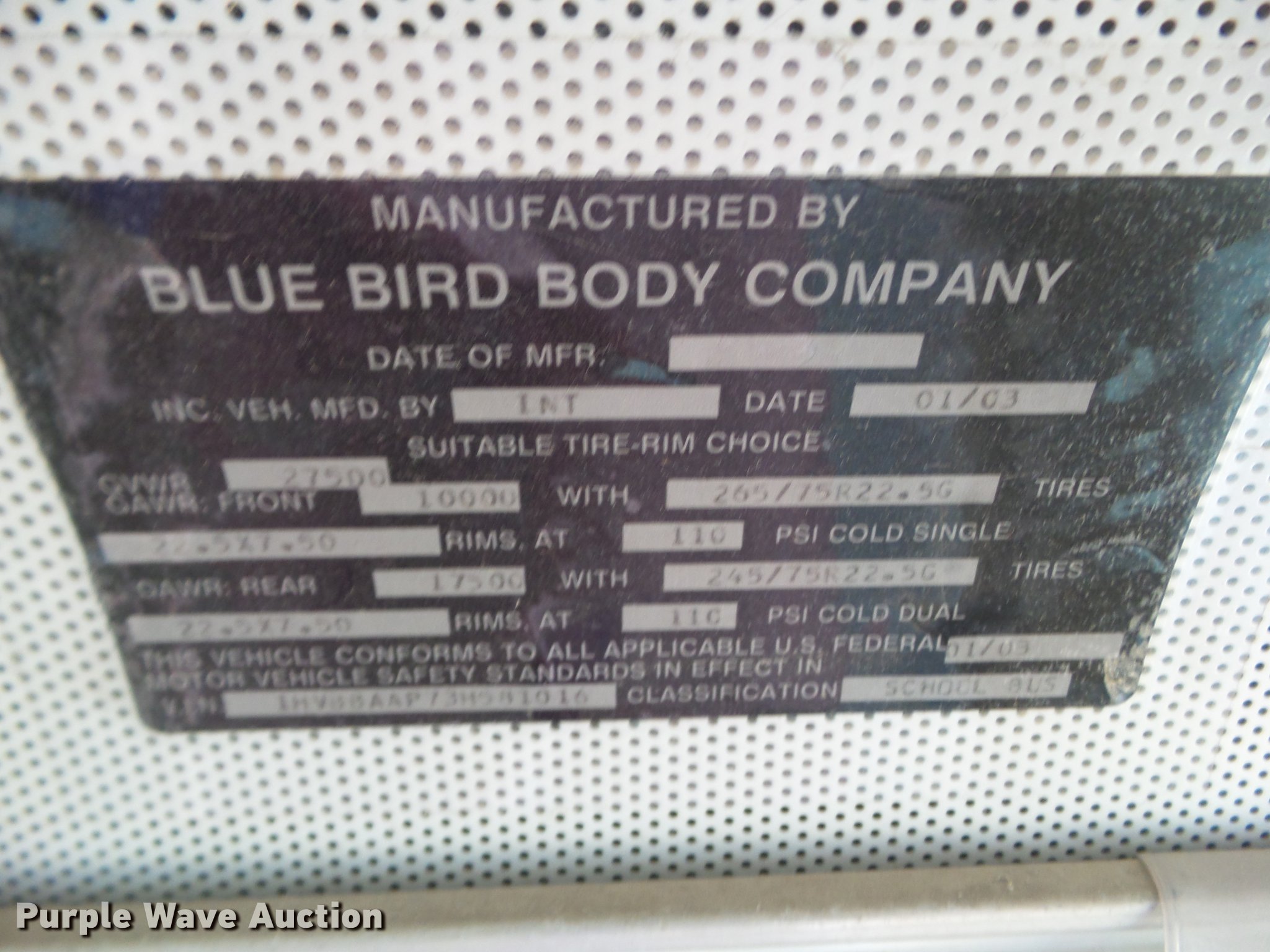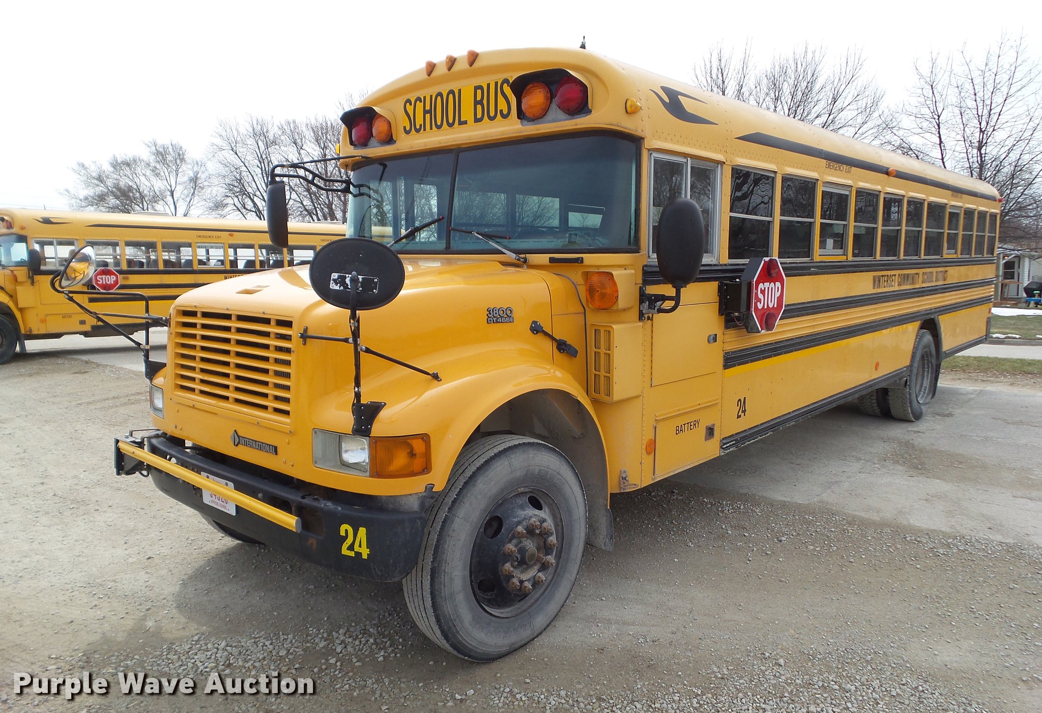 Purple Wave is selling a used Bus in Iowa. This item is a 2003 International 3800 Blue Bird CV600S school bus with the following: 162,925 miles on odometer, 7,268 hours on meter, Miles and hours may vary, still in use, International CL215 7.4L six cylinder turbo diesel engine, 215 HP, Automatic transmission, Single axle, Heat, AM/FM/cassette, Heated mirrors, Suspension seat, 65 passenger capacity, Ceiling, rear, and side emergency exits, Block heater, Backup alarm, Front and rear tow hooks, Spring suspension, Hydraulic brakes, 10R22.5 tires, GVWR 27,500 lbs, Cameras and two-way radio not included, Fire extinguisher and first aid kits not included, Engine issues, possible head gasket issues, Water in oil