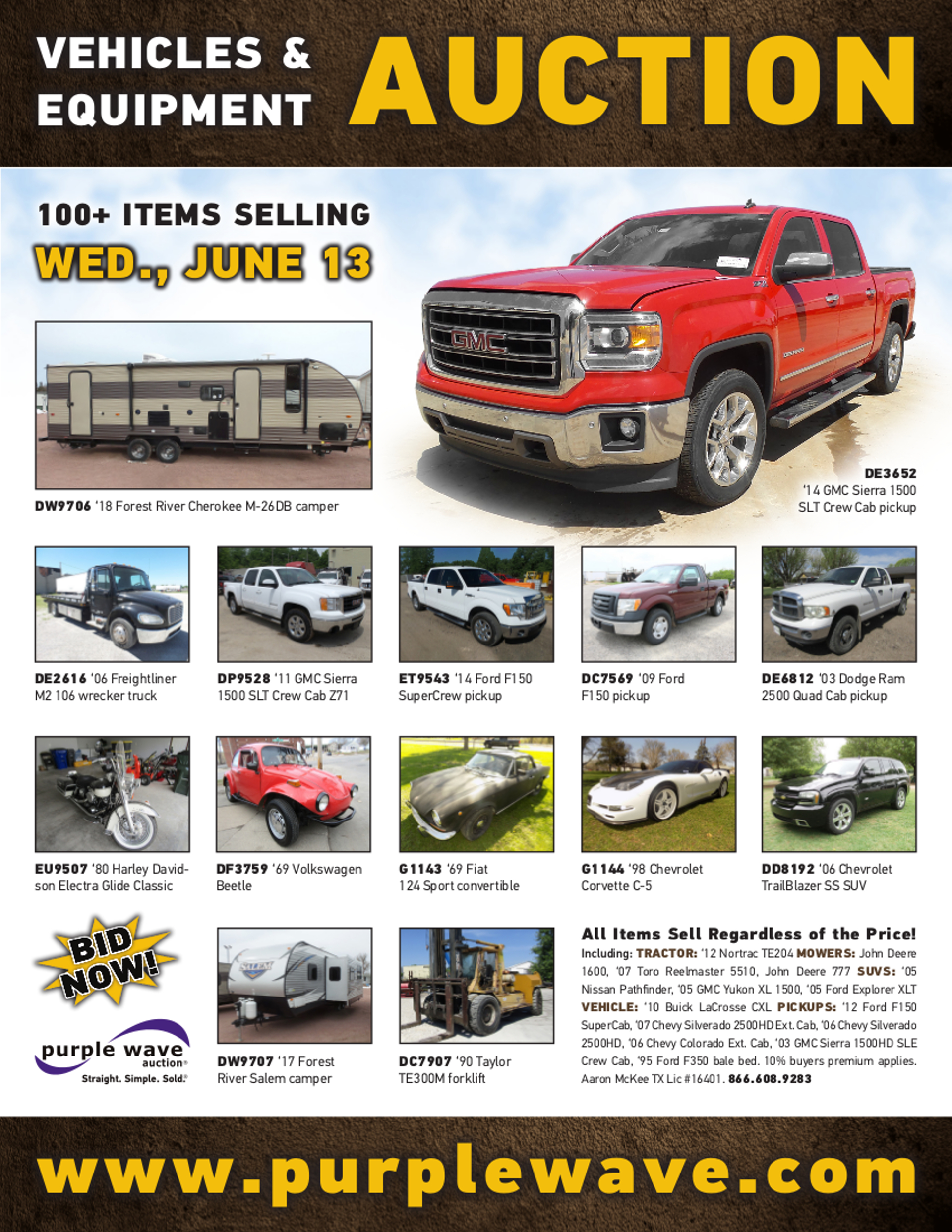 This auction is conducted by Purple Wave, Inc., whose home office is 825 Levee Drive, Manhattan, Kansas. Aaron McKee, Texas auctioneer license # 16401, operates Purple Wave, Inc. Complaints against us may be directed to the Texas Department of Licensing and Regulation, P.O. Box 12157, Austin, Texas 78711, (512) 463-6599. For additional required information, see the attached document.