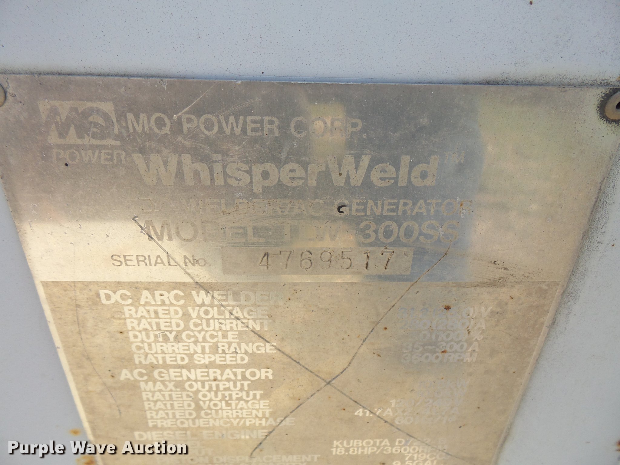 Purple Wave is selling a used Welder (Manual) in Kansas. This item is a MQ Whisperweld welder/generator with the following: 36 hours on meter, Kubota three cylinder diesel engine, 300 amp welder, 10 kW generator, 2" ball hitch, 205/65R15 tires, Serial 4769517