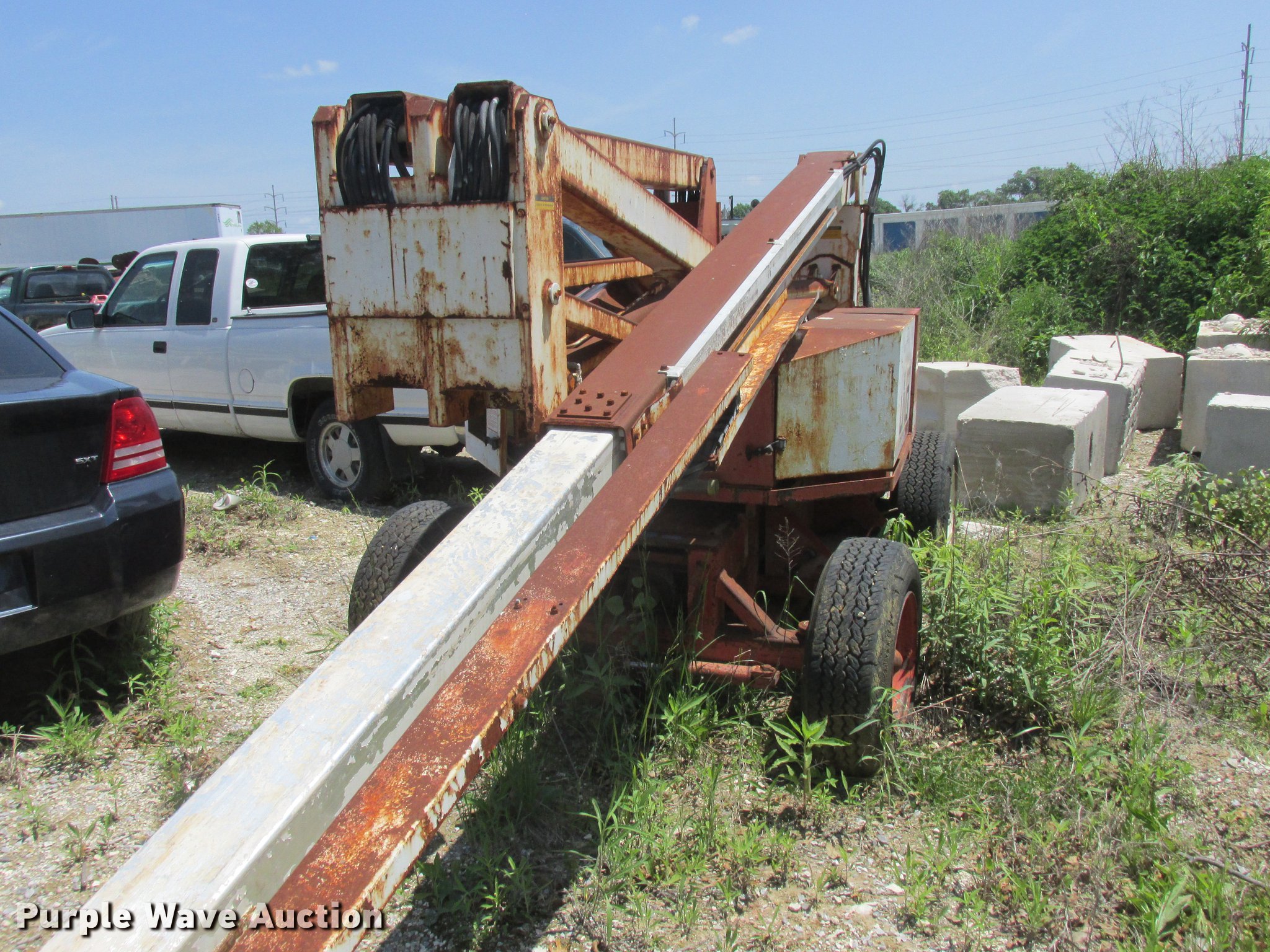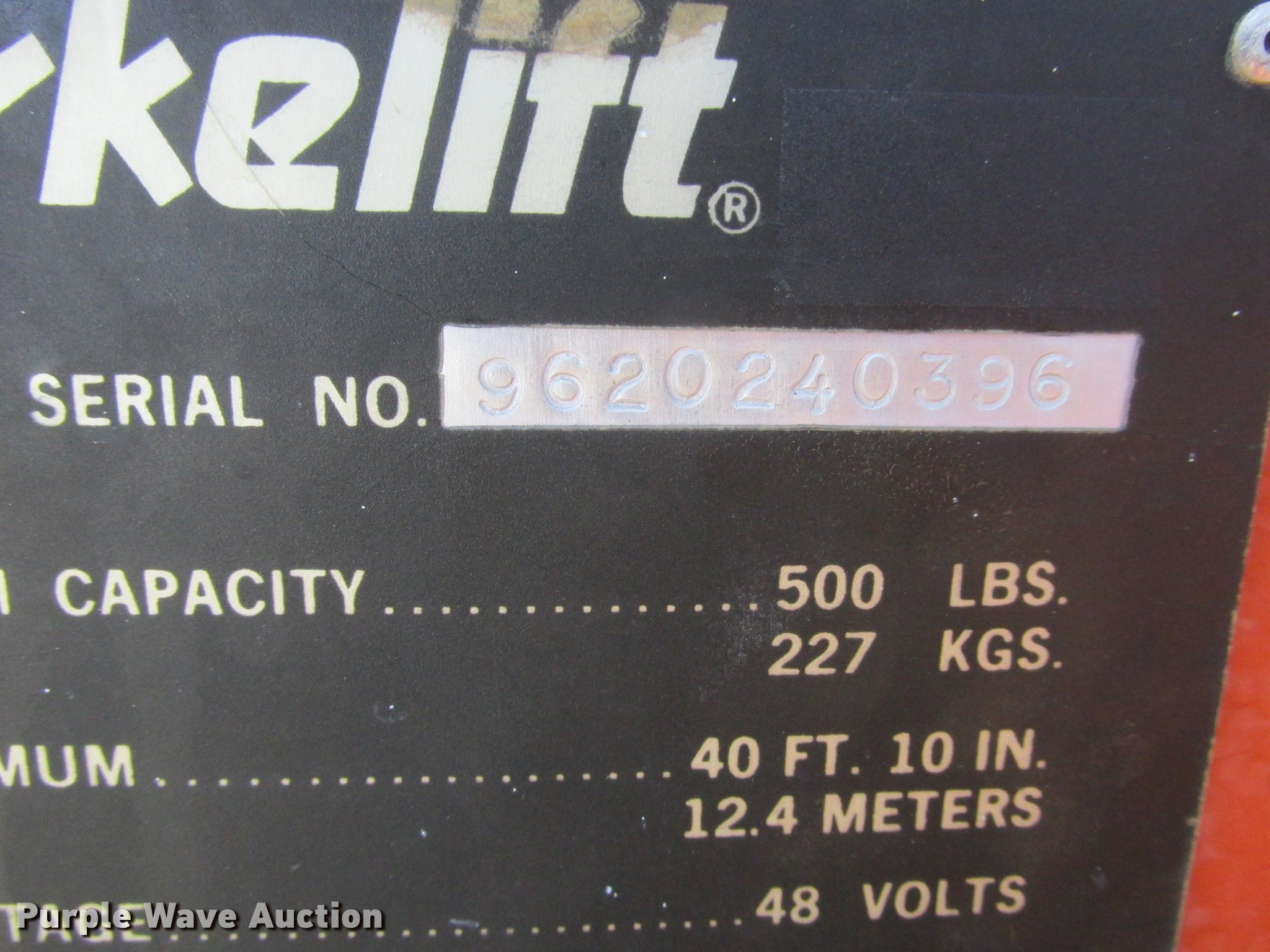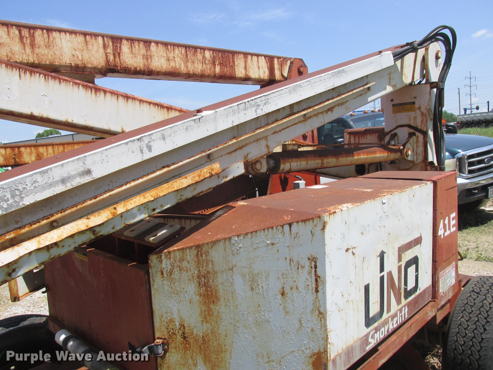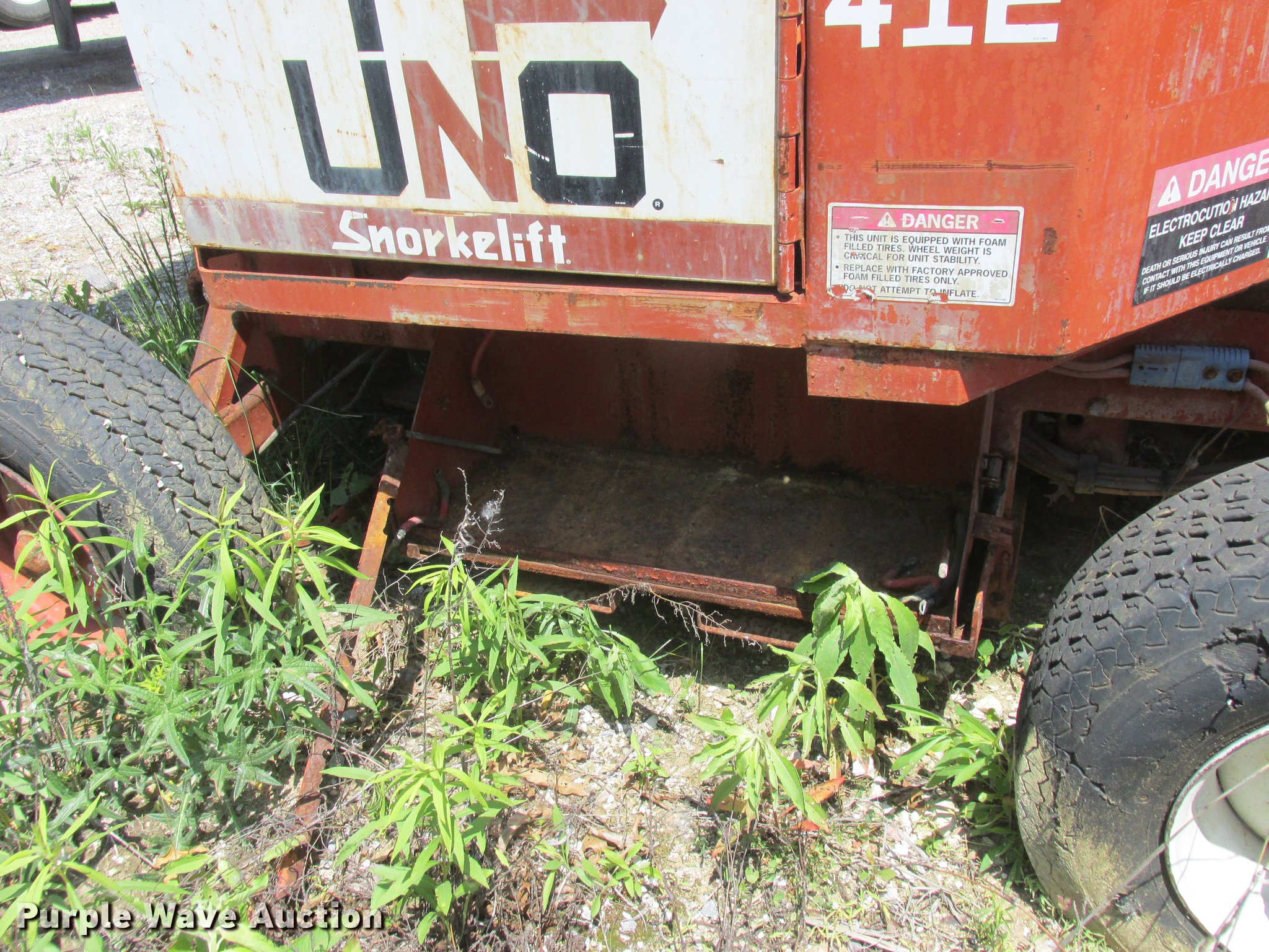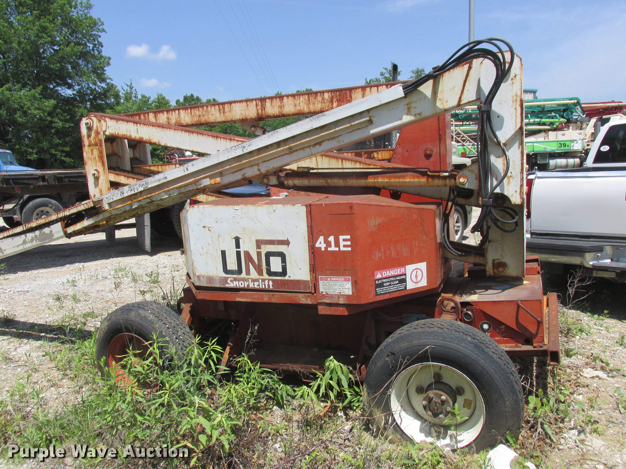 Purple Wave is selling a used Boom Lift in Missouri. This item is a Snorkelift UNO41E boom lift with the following: 540 hours on meter, Electric operation, 500 lbs max lift capacity, 41' max lift height, Platform and ground controls, AC power outlet, 9.50-16.5LT pneumatic tires, No batteries, Non-operational unit, Serial 9620240396