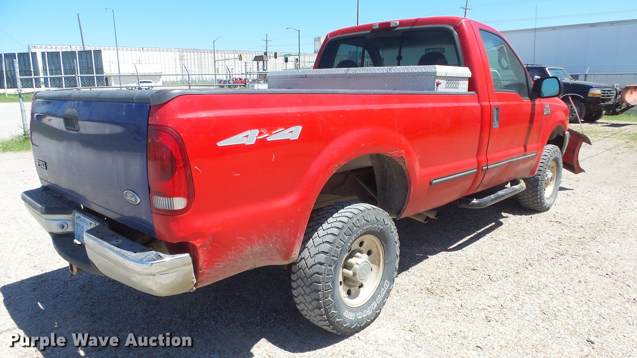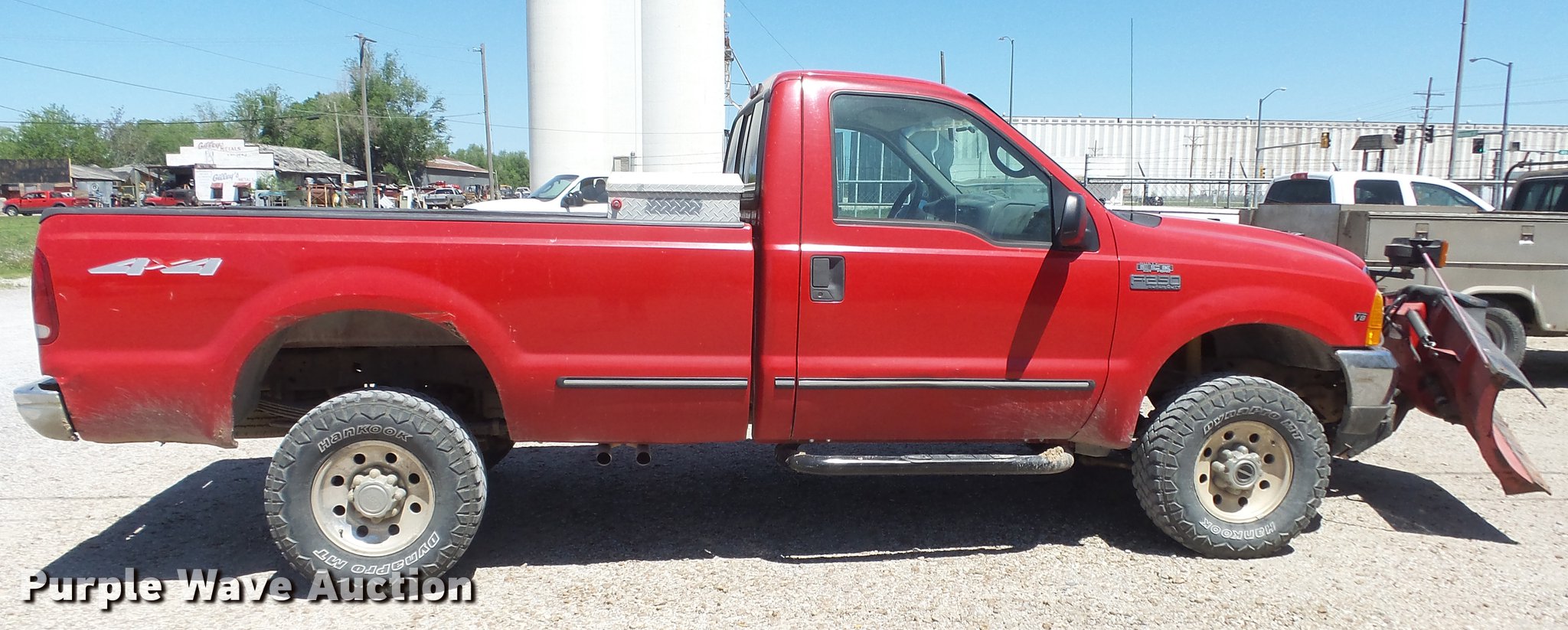 Purple Wave is selling a used 3/4 or 1 Ton Pickup or Van in Kansas. This item is a 1999 Ford F250 Super Duty pickup truck with the following: 283,197 miles on odometer, 5.4L V8 SOHC 16V gas engine, Automatic transmission, Four wheel drive, AC and heat, Tilt, Cruise, AM/FM/cassette, Power windows, locks, and mirrors, Cloth interior, Running boards, Toolbox, 7.5'W snow plow, Receiver hitch, Trailer wiring, 265/75R16 tires, Cracked windshield