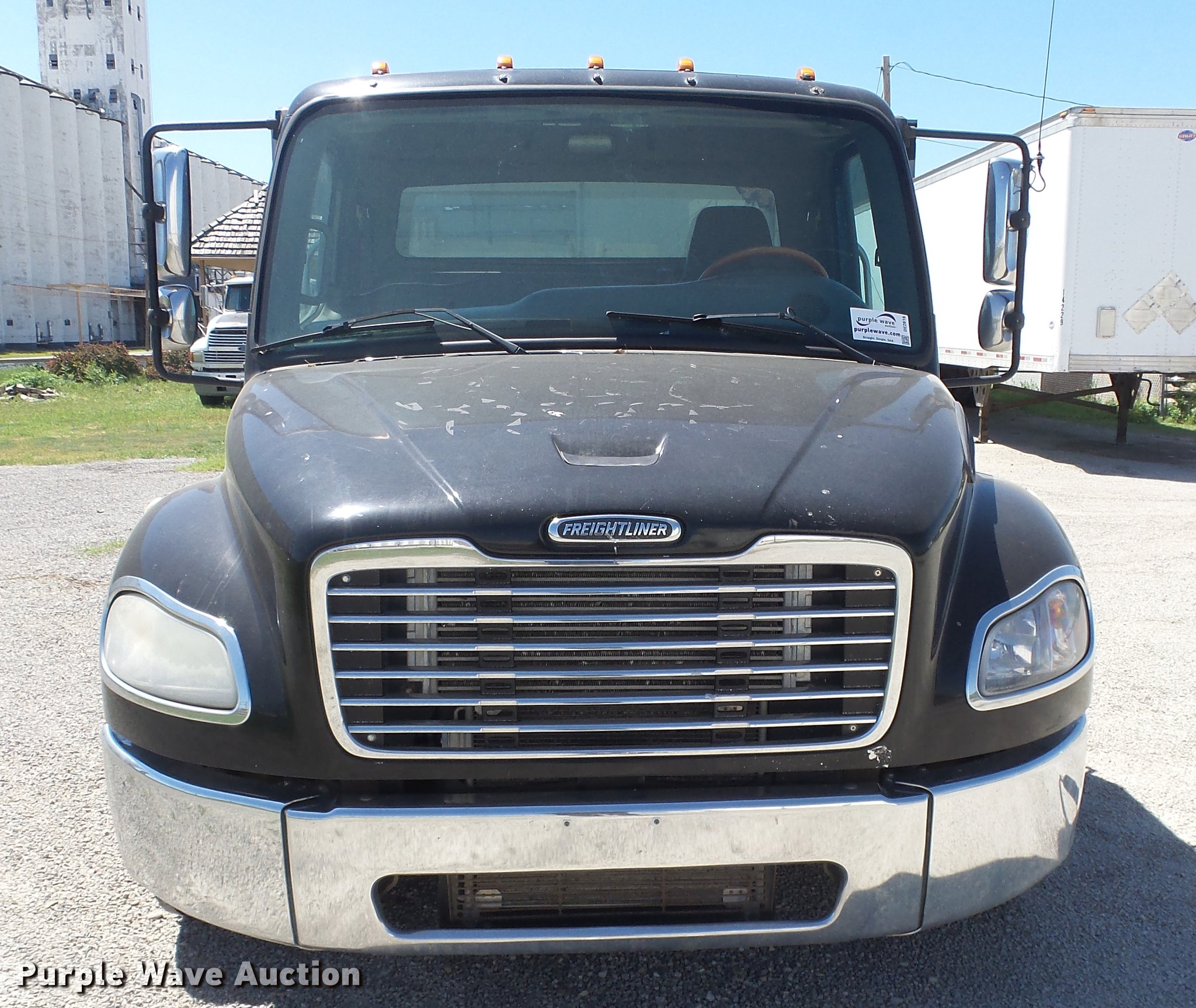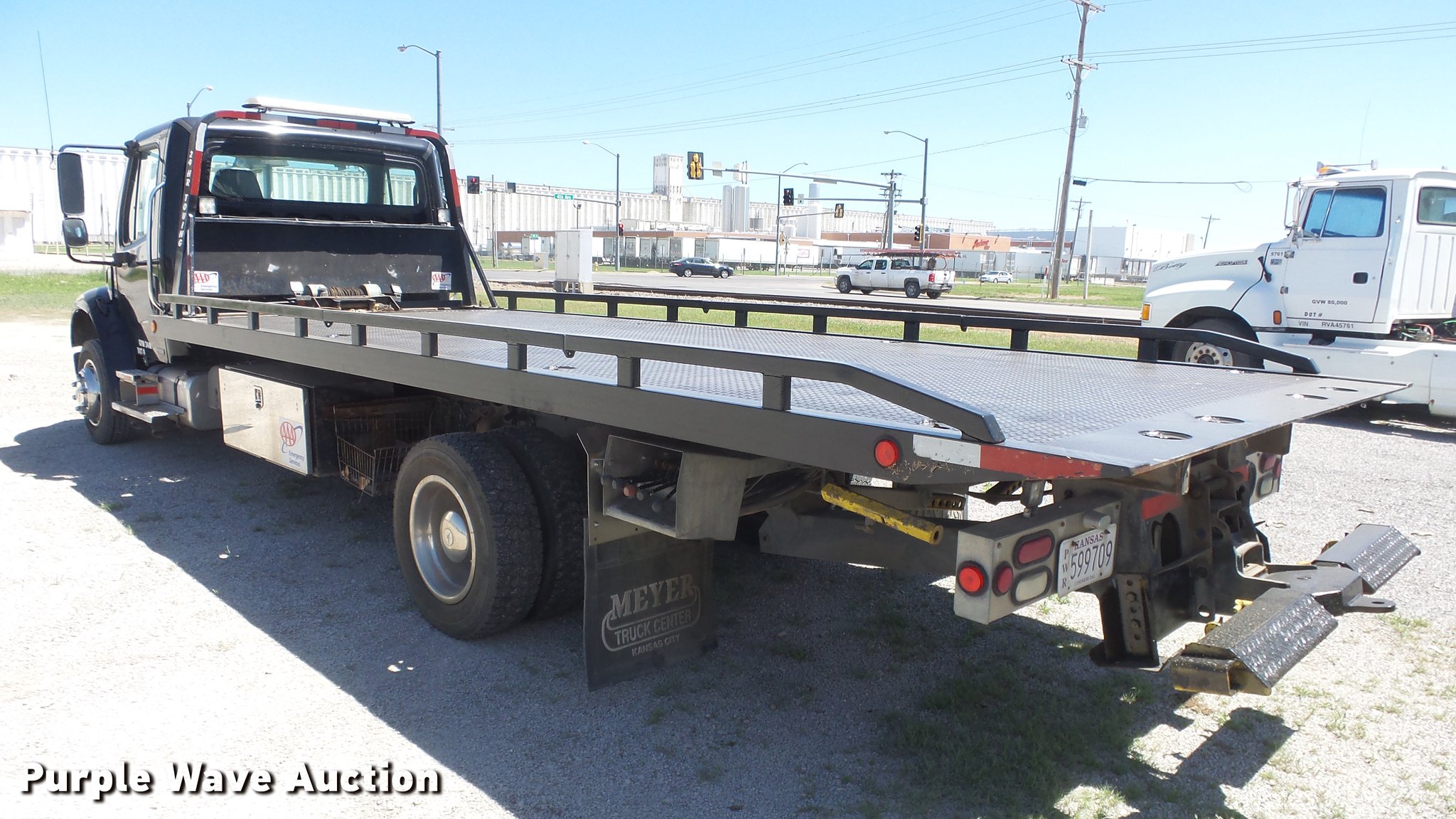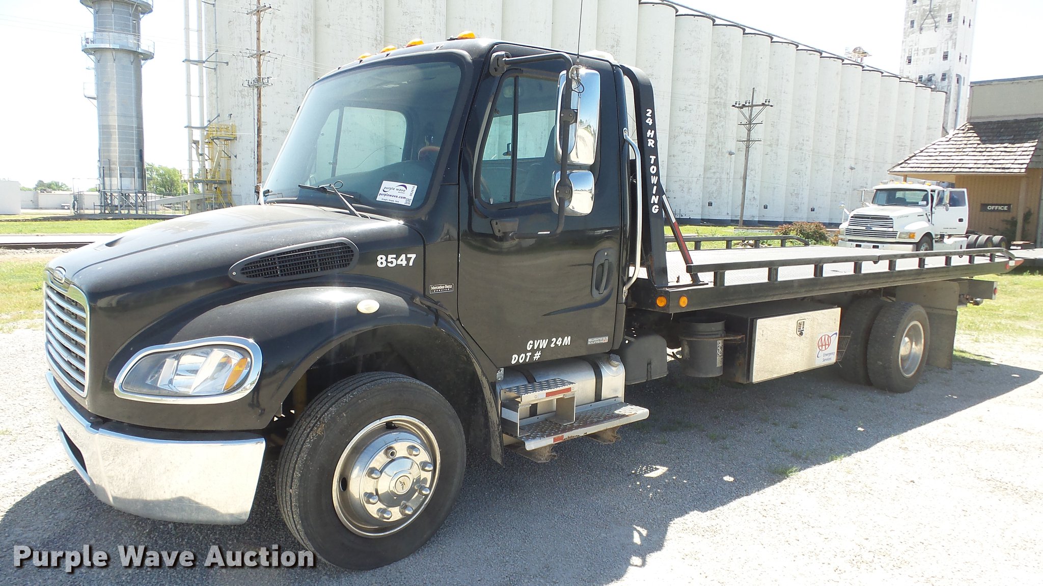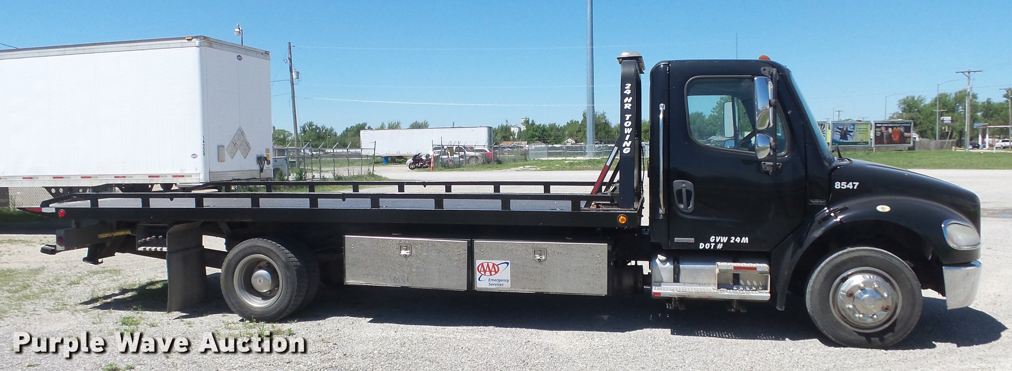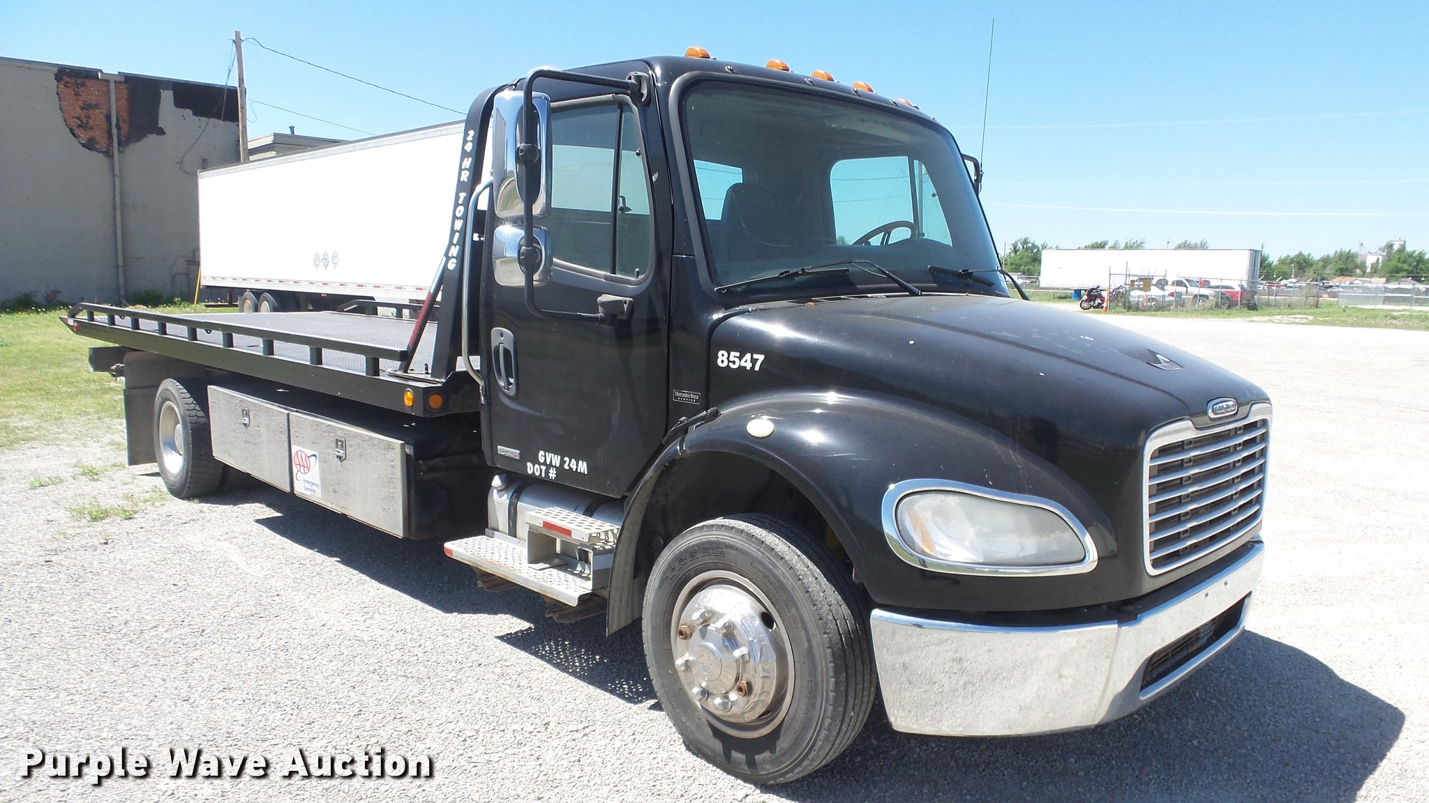 Purple Wave is selling a used Rollback or Tow Truck in Kansas. This item is a 2006 Freightliner M2 106 wrecker truck with the following: 449,317 miles on odometer, Mercedes-Benz MBE900 6.4L L6 diesel engine, Automatic transmission, Single axle, AC and heat, Cruise, Heated mirrors, Cloth/vinyl interior, 21'L x 8'W steel wrecker bed, Left and right controls, Underlift, Winch, Toolboxes/storage, Trailer wiring, Dual fuel tanks, Spring suspension, Hydraulic brakes, Engine brake, 245/70R19.5 tires, GVWR 25,500 lbs, Cracked windshield