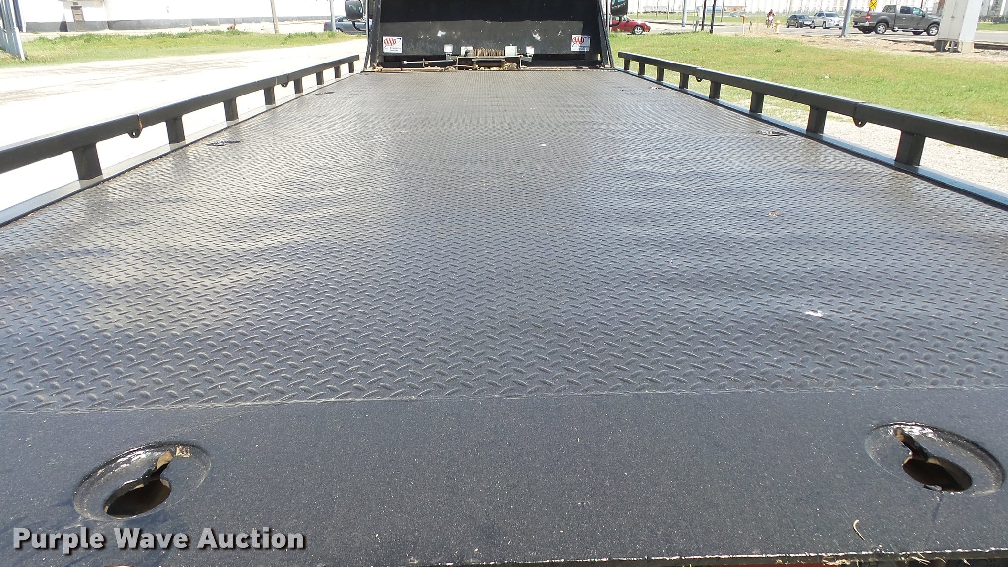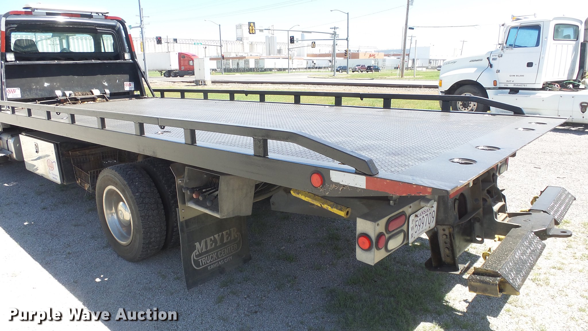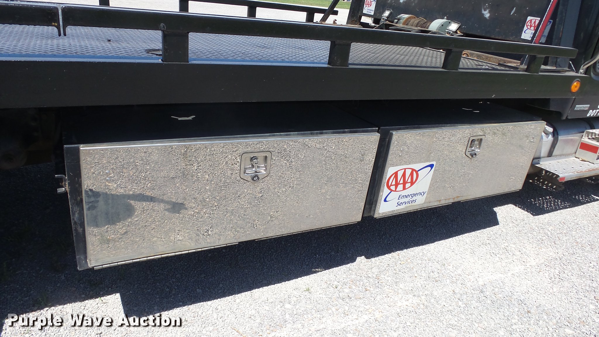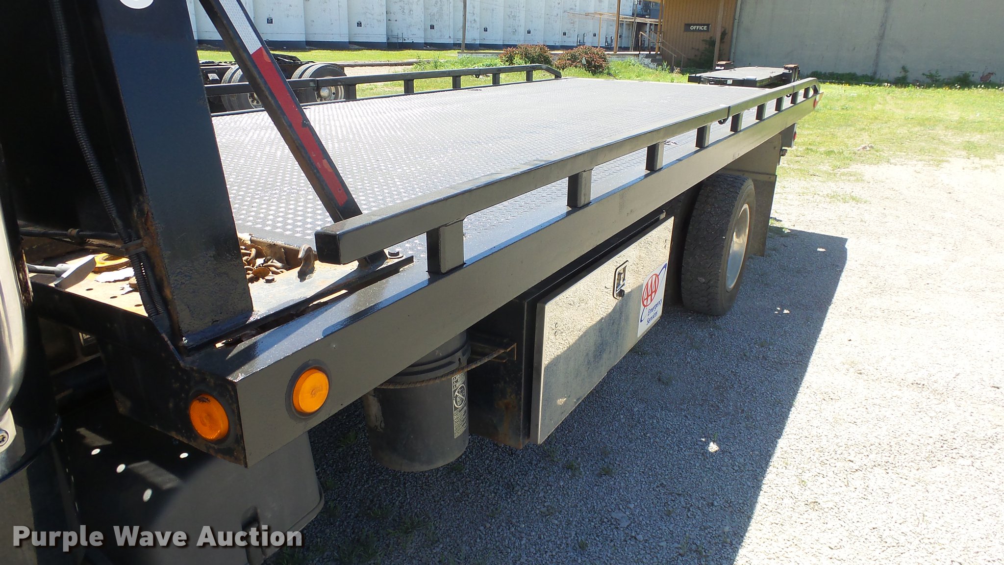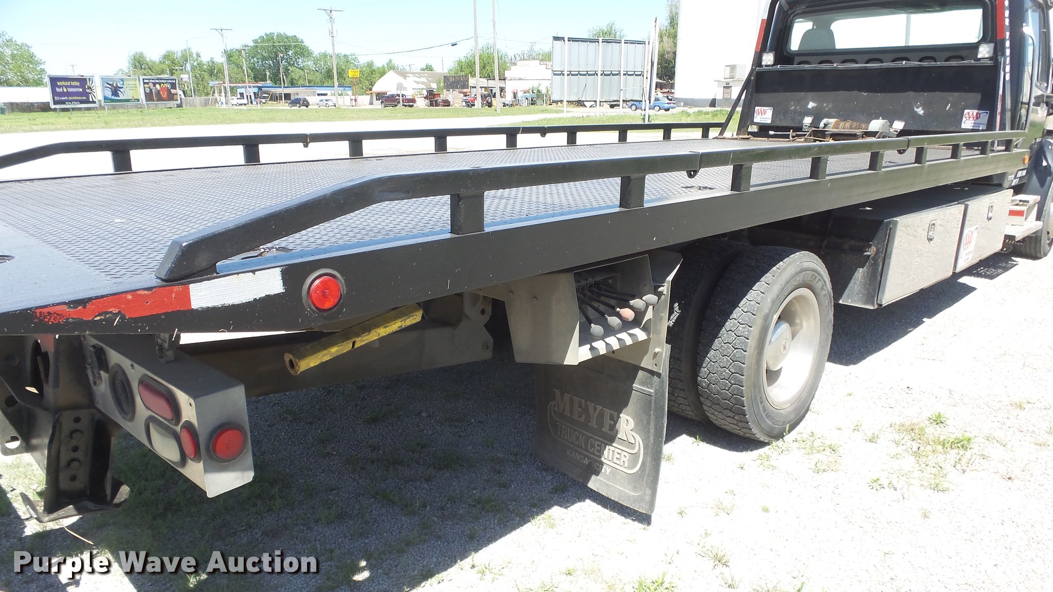Purple Wave is selling a used Rollback or Tow Truck in Kansas. This item is a 2006 Freightliner M2 106 wrecker truck with the following: 449,317 miles on odometer, Mercedes-Benz MBE900 6.4L L6 diesel engine, Automatic transmission, Single axle, AC and heat, Cruise, Heated mirrors, Cloth/vinyl interior, 21'L x 8'W steel wrecker bed, Left and right controls, Underlift, Winch, Toolboxes/storage, Trailer wiring, Dual fuel tanks, Spring suspension, Hydraulic brakes, Engine brake, 245/70R19.5 tires, GVWR 25,500 lbs, Cracked windshield