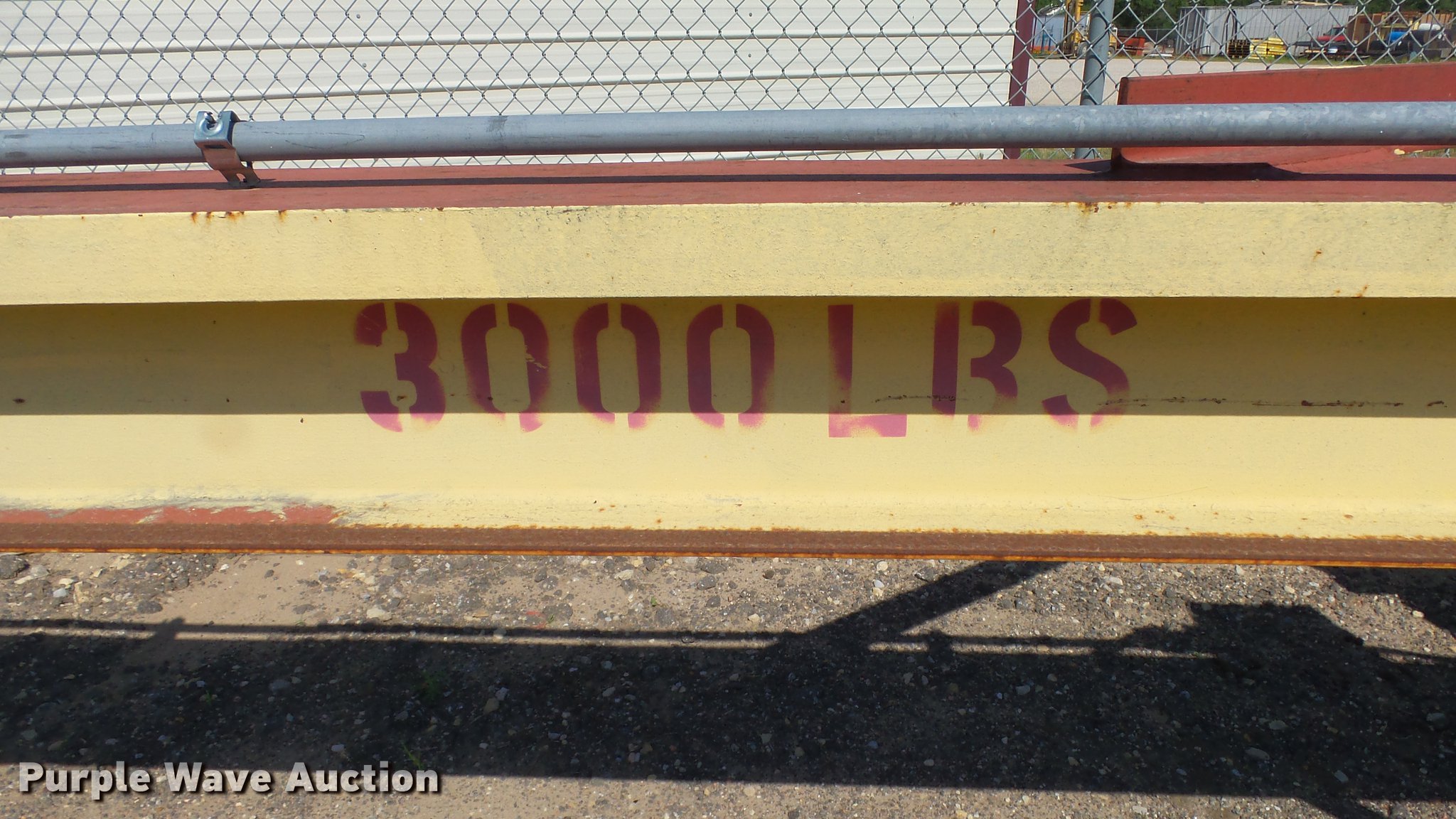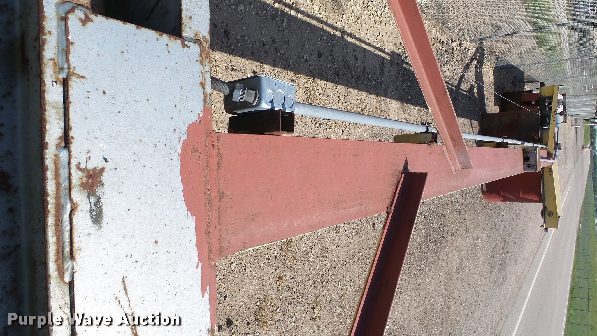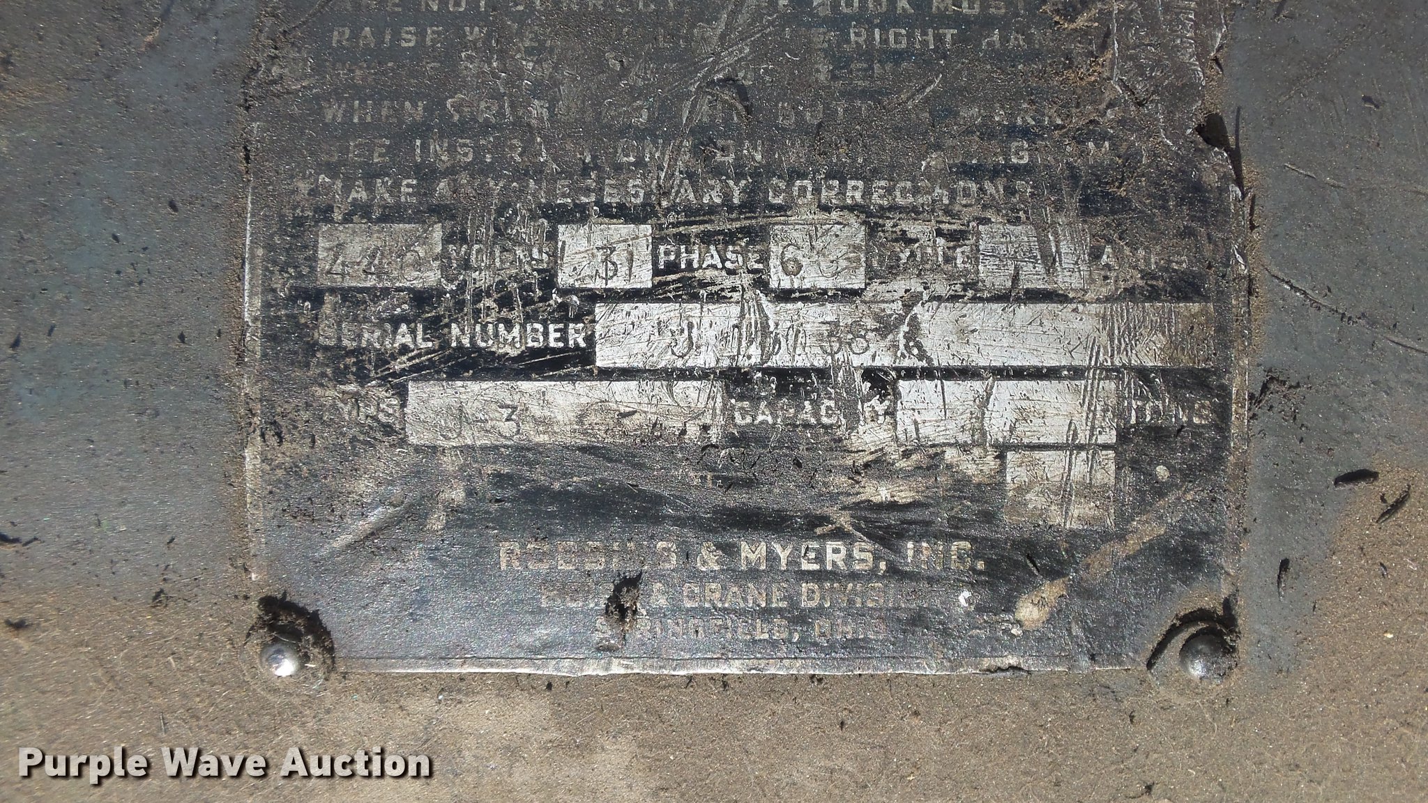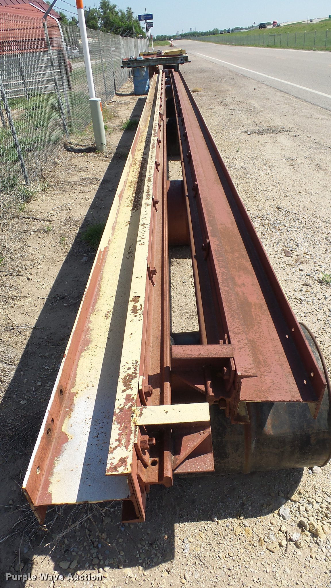 Purple Wave is selling a used Overhead or Straddle Crane in Kansas. This item is a Gantry crane system with the following: 25' x 90"H beam, Dual electric motor, 3,000 lbs capacity, 48' twin I-beams, (6) 13.5' support beams, Robbins & Meyers J-3 crane, 440V, Three phase, Serial J16038, Gleason reel, 35 amps, 600V, 50 fpm, Robbins hook, Four button pendant control
