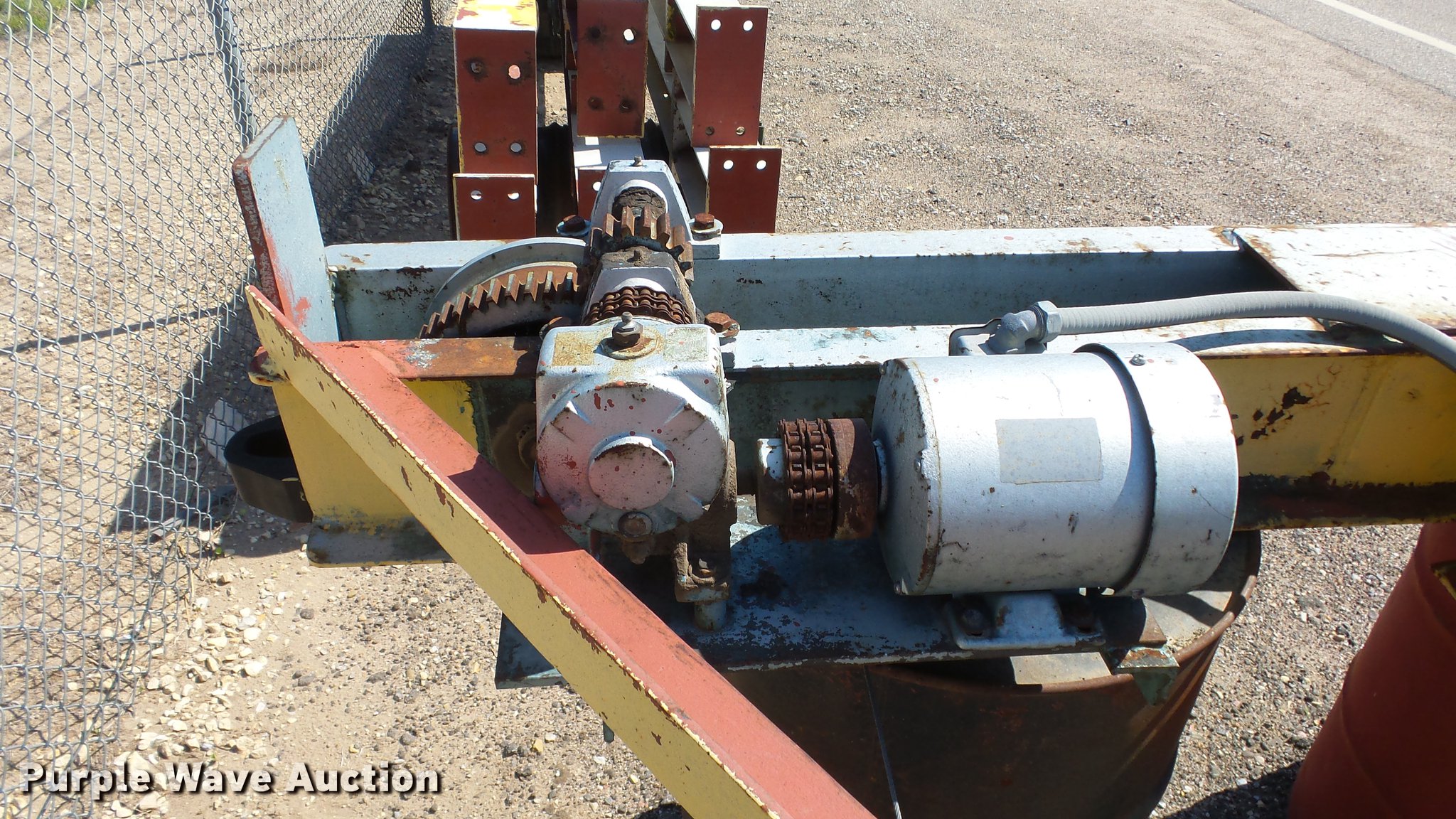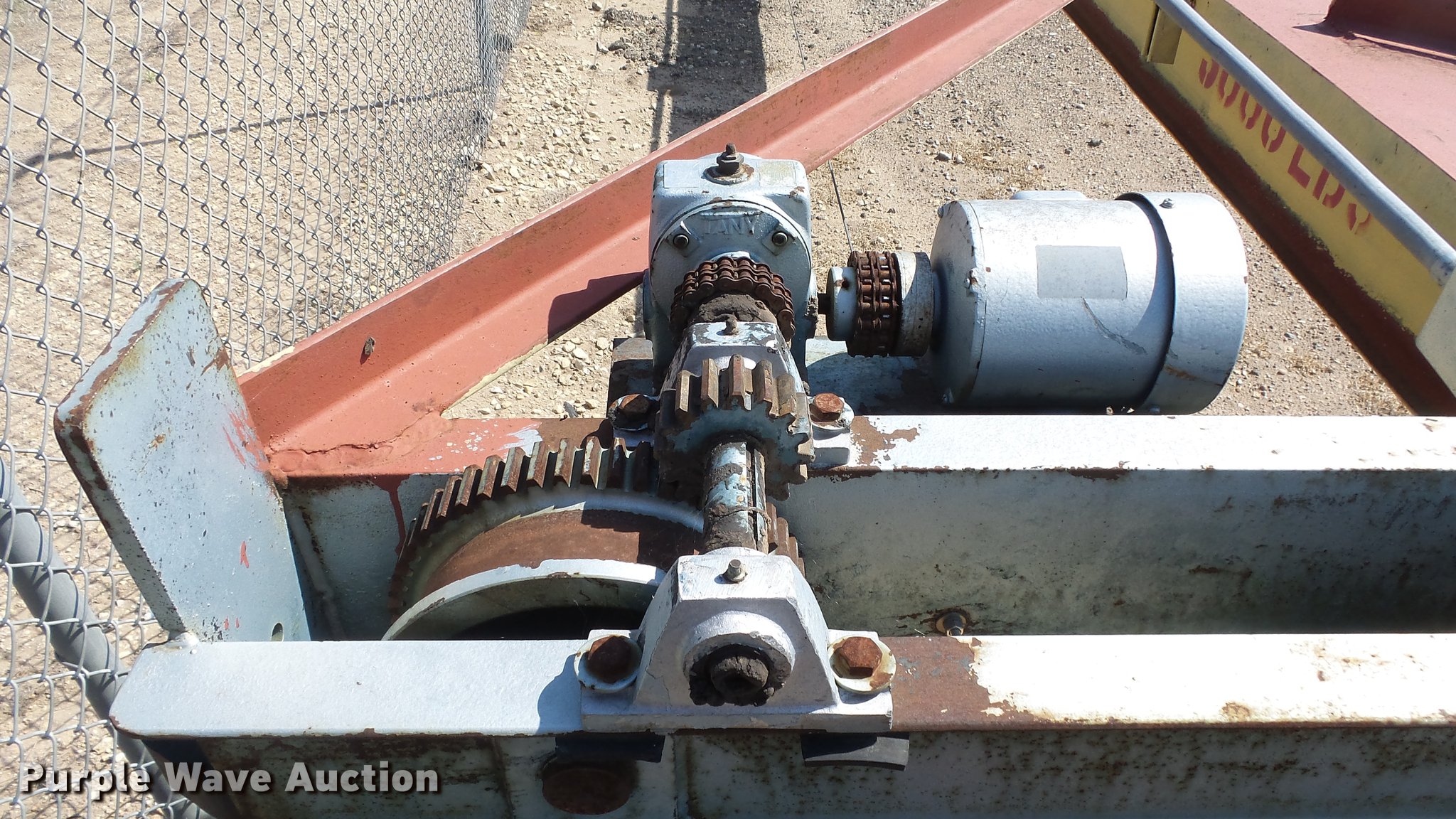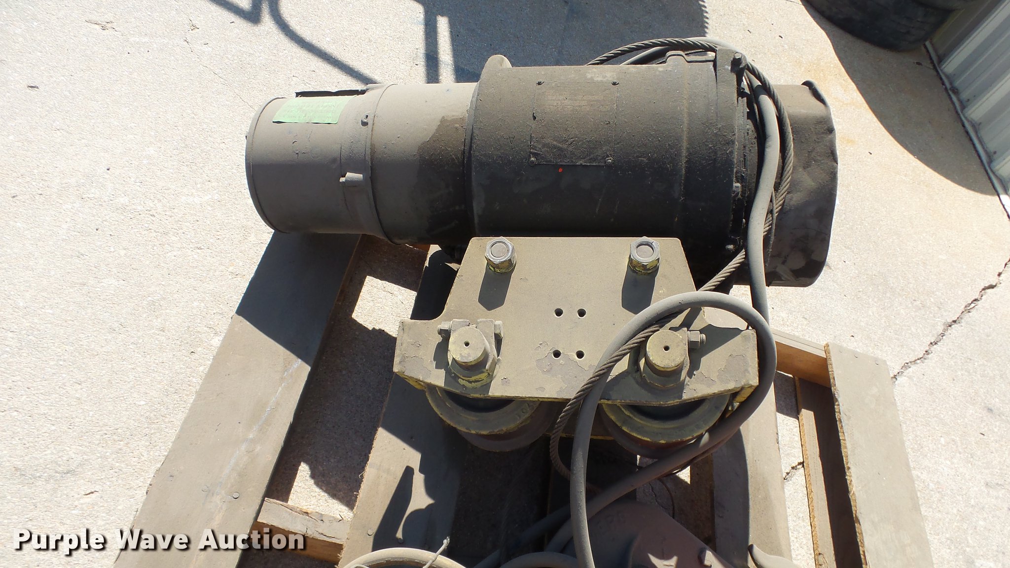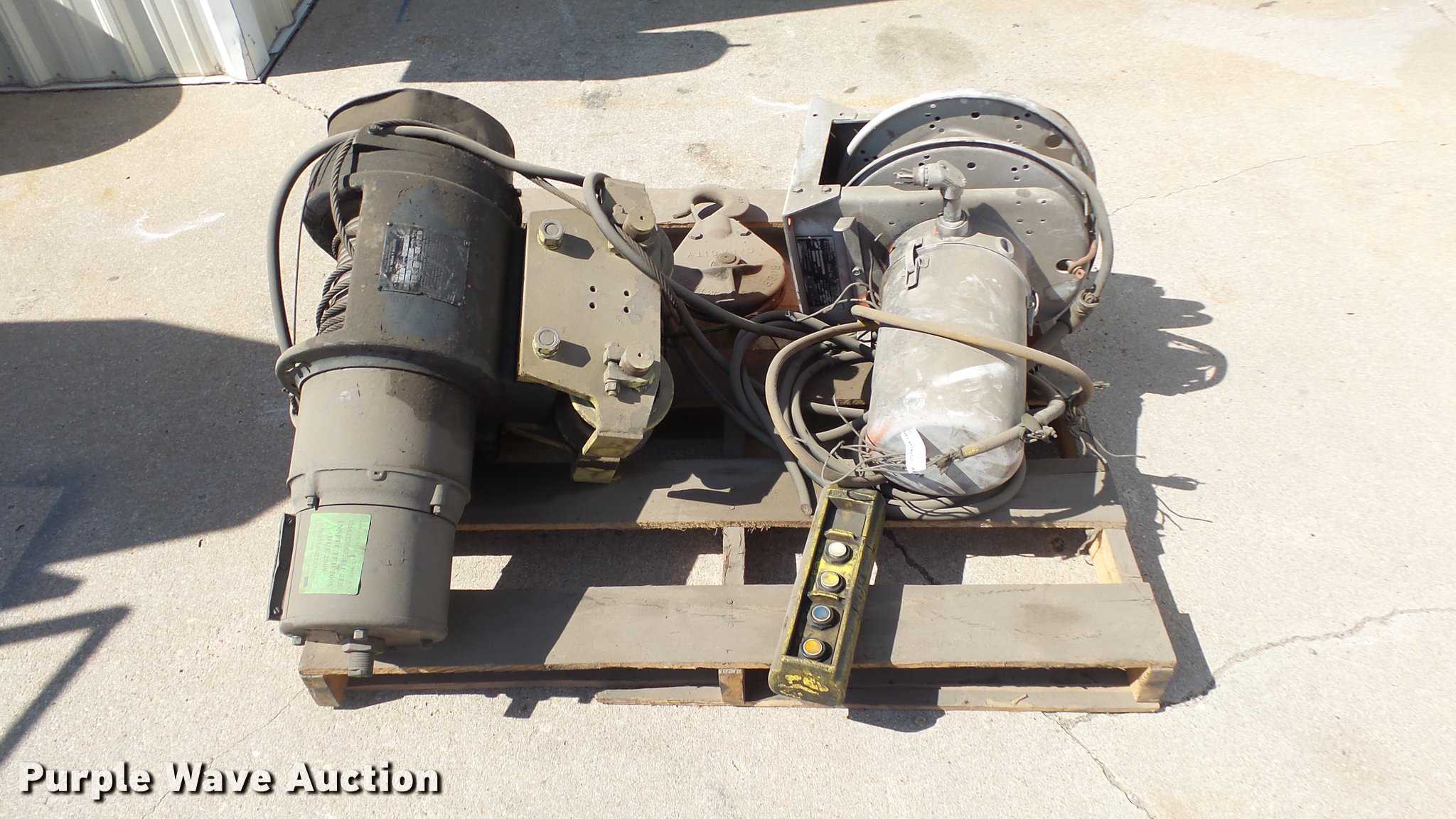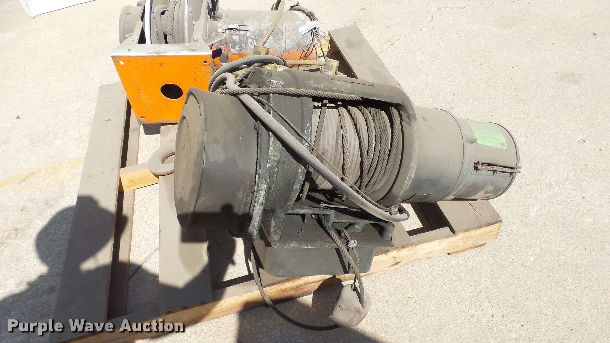Purple Wave is selling a used Overhead or Straddle Crane in Kansas. This item is a Gantry crane system with the following: 25' x 90"H beam, Dual electric motor, 3,000 lbs capacity, 48' twin I-beams, (6) 13.5' support beams, Robbins & Meyers J-3 crane, 440V, Three phase, Serial J16038, Gleason reel, 35 amps, 600V, 50 fpm, Robbins hook, Four button pendant control