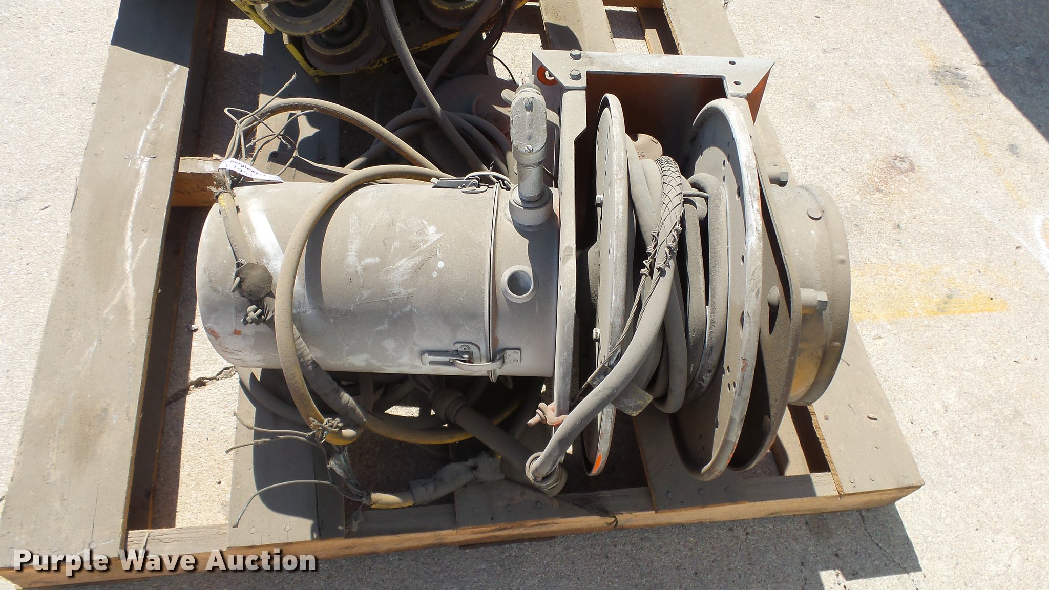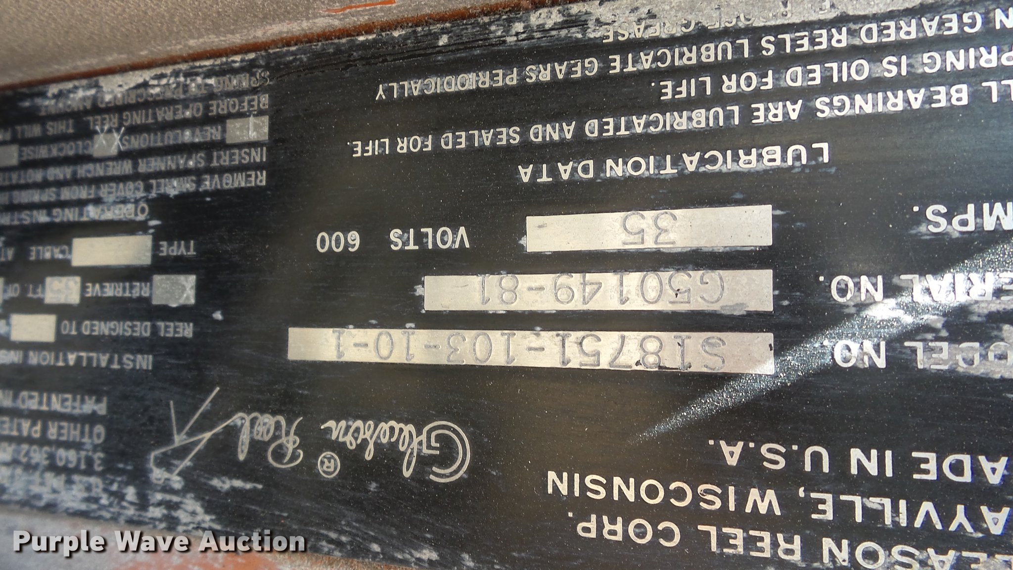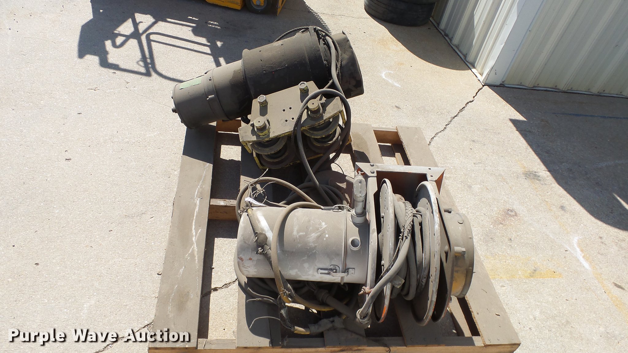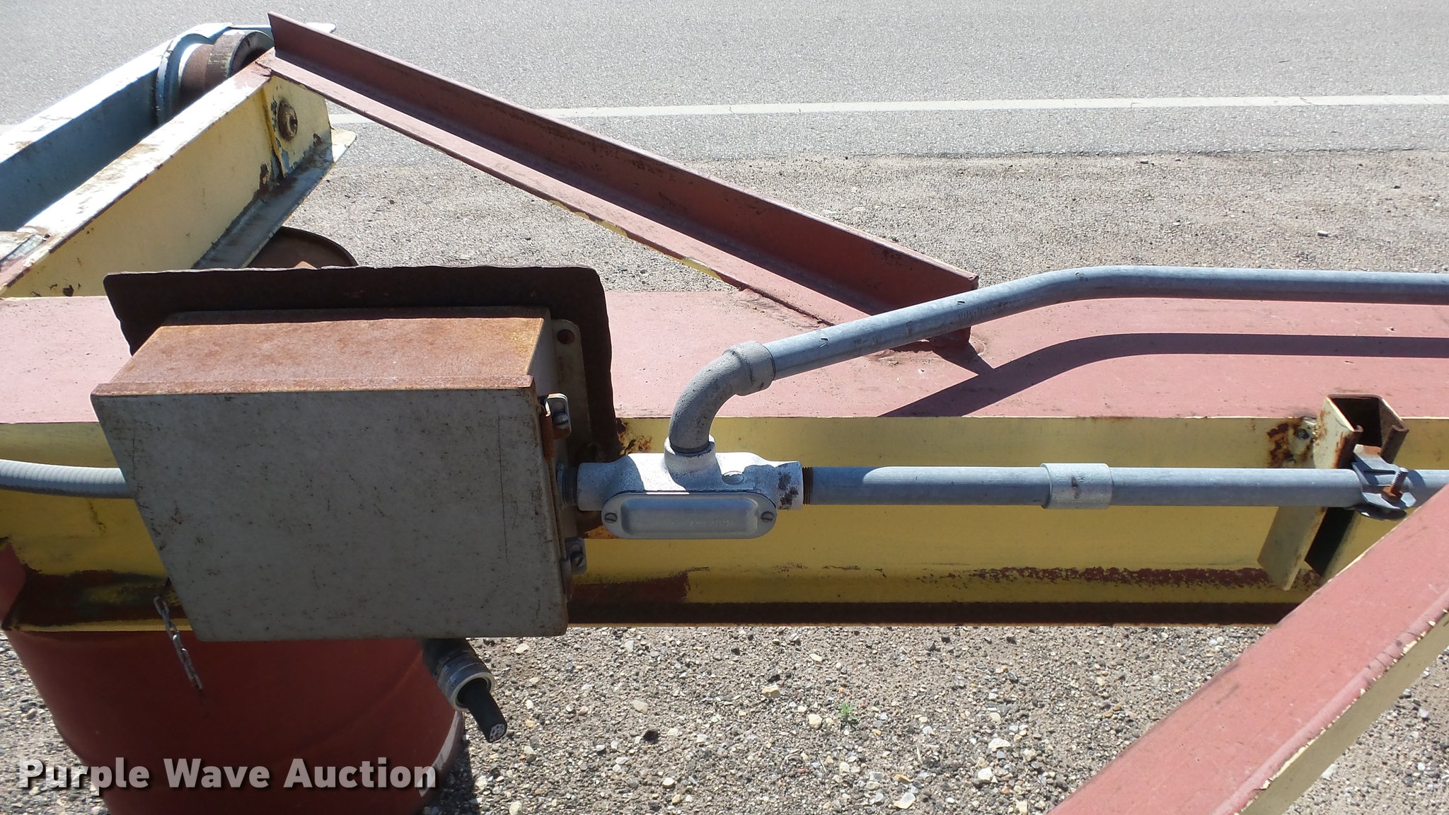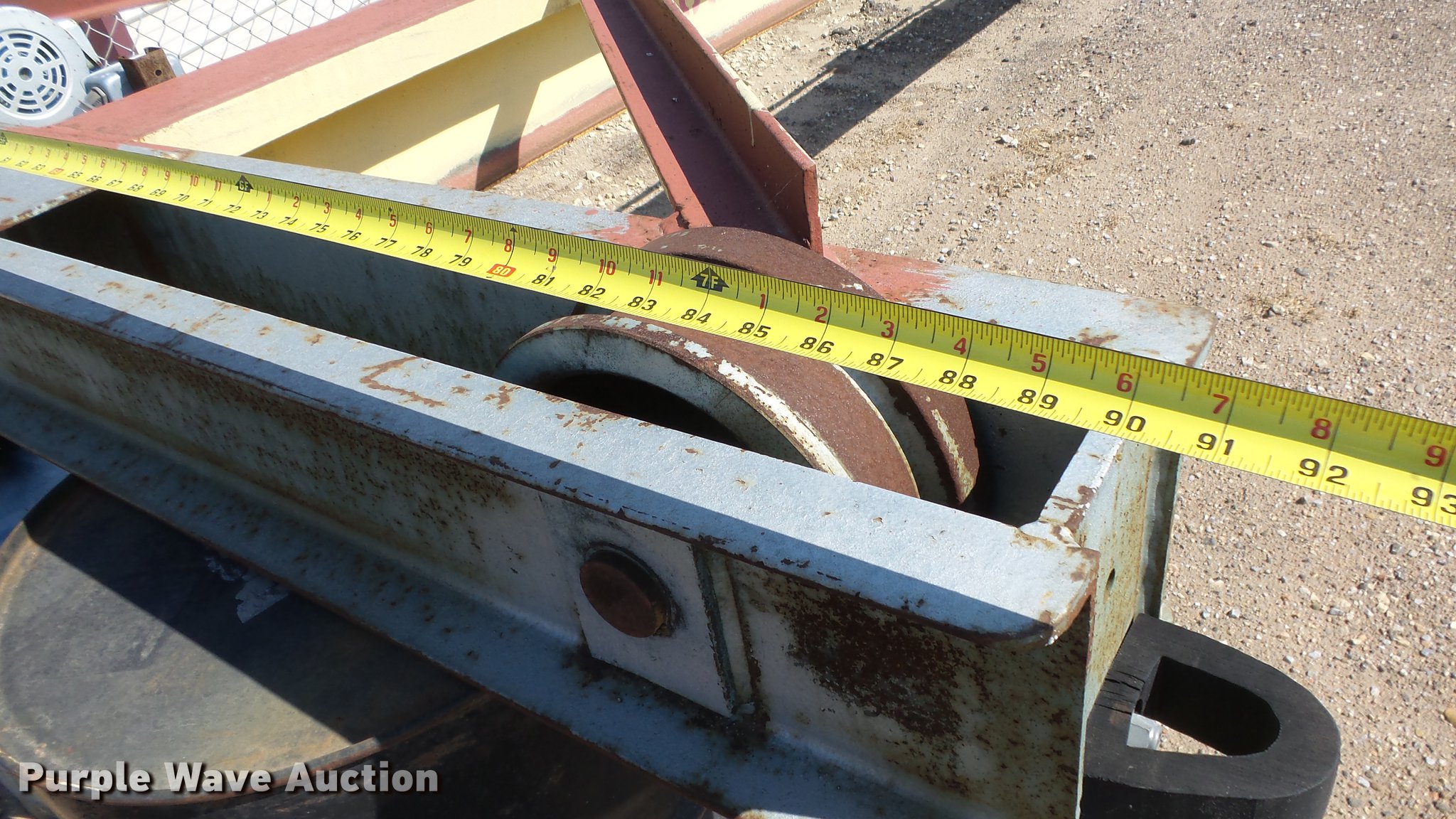 Gantry crane system. 25' x 90"H beam Dual electric motor, 3,000 lbs capacity, 48' twin I-beams, (6) 13.5' support beams, Robbins & Meyers J-3 crane 440V, Three phase, Serial J16038, Gleason reel 35 amps, 600V, 50 fpm, Robbins hook, Four button pendant control. B & B Auto Electric. 2500 Line Rd. Hutchinson, KS 67501