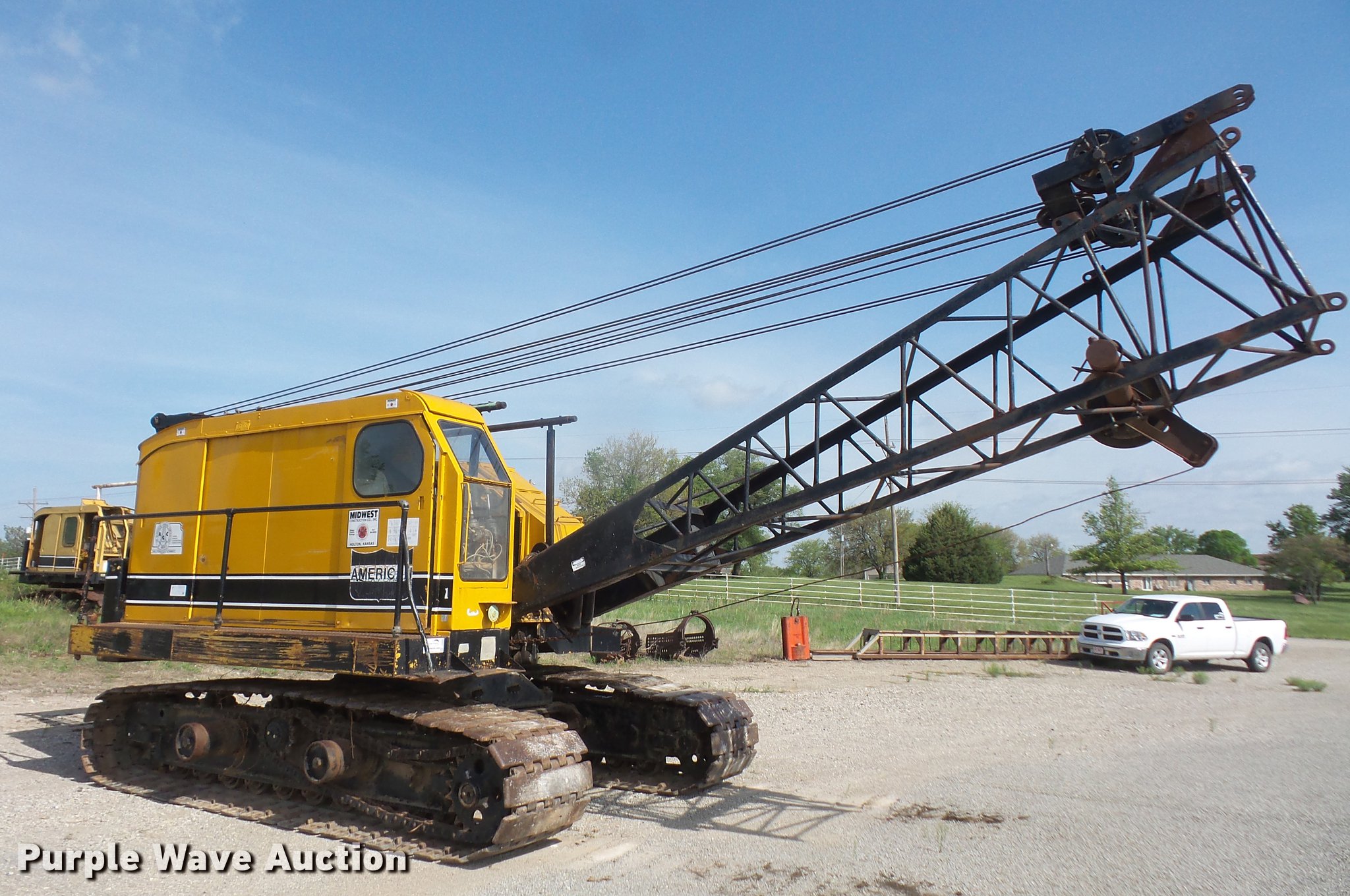 American 599-C crane. 8,505 hours on meter, Detroit Diesel 461 four cylinder diesel engine, Mechanical propulsion, Air actuated control, Stick crane controls, 95' lattice boom, Four boom sections, 80,000 lbs maximum lift capacity, Individual swing and travel, (2) winches, Crane ball and hook, 35"W extendable tracks, Serial GS5064, Unit# 1. Midwest Construction Co.. 19830 Q Rd. Holton, KS 66436