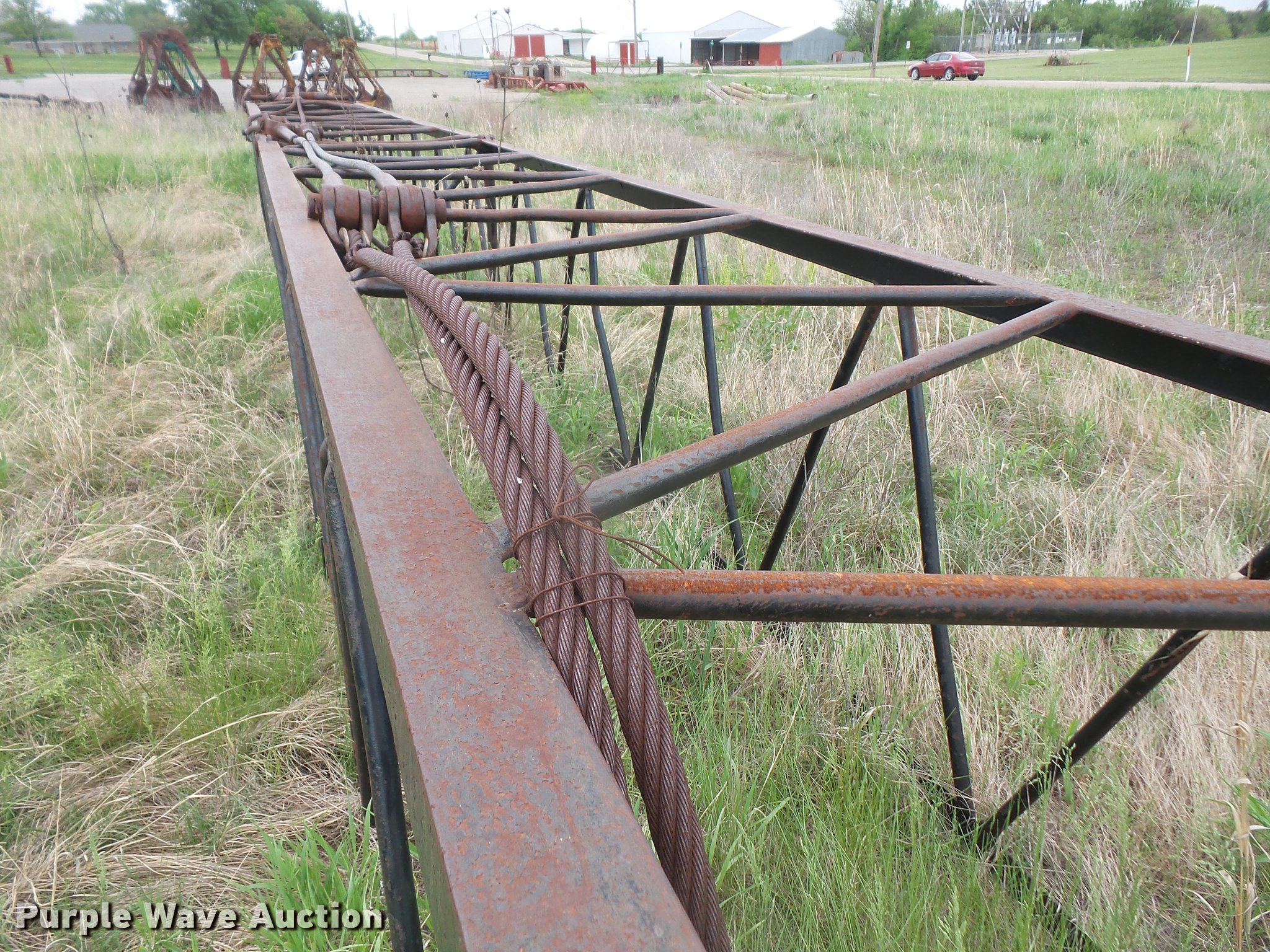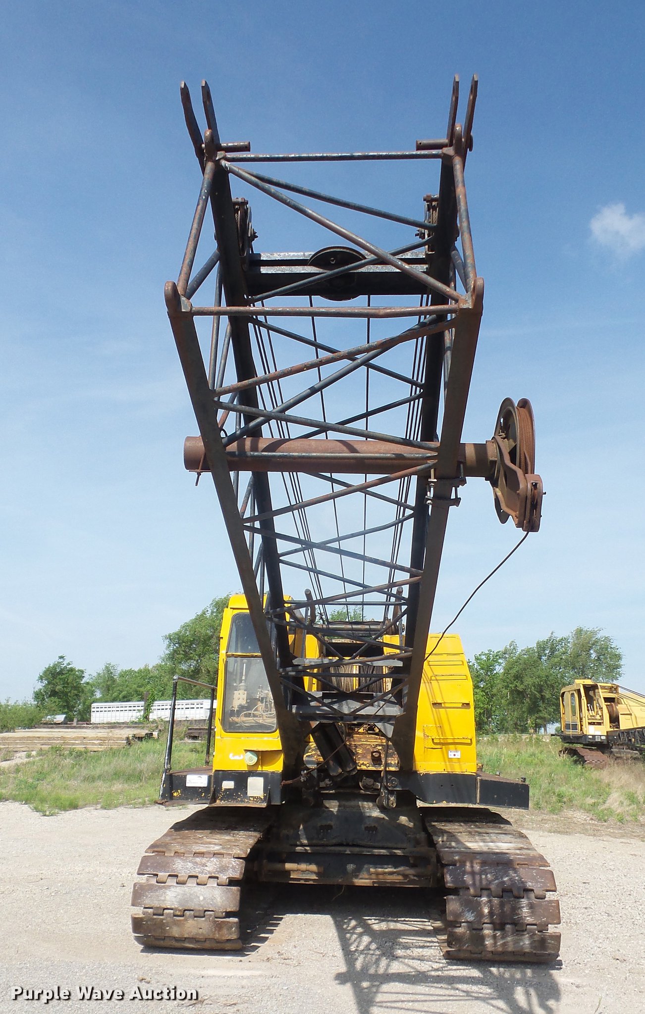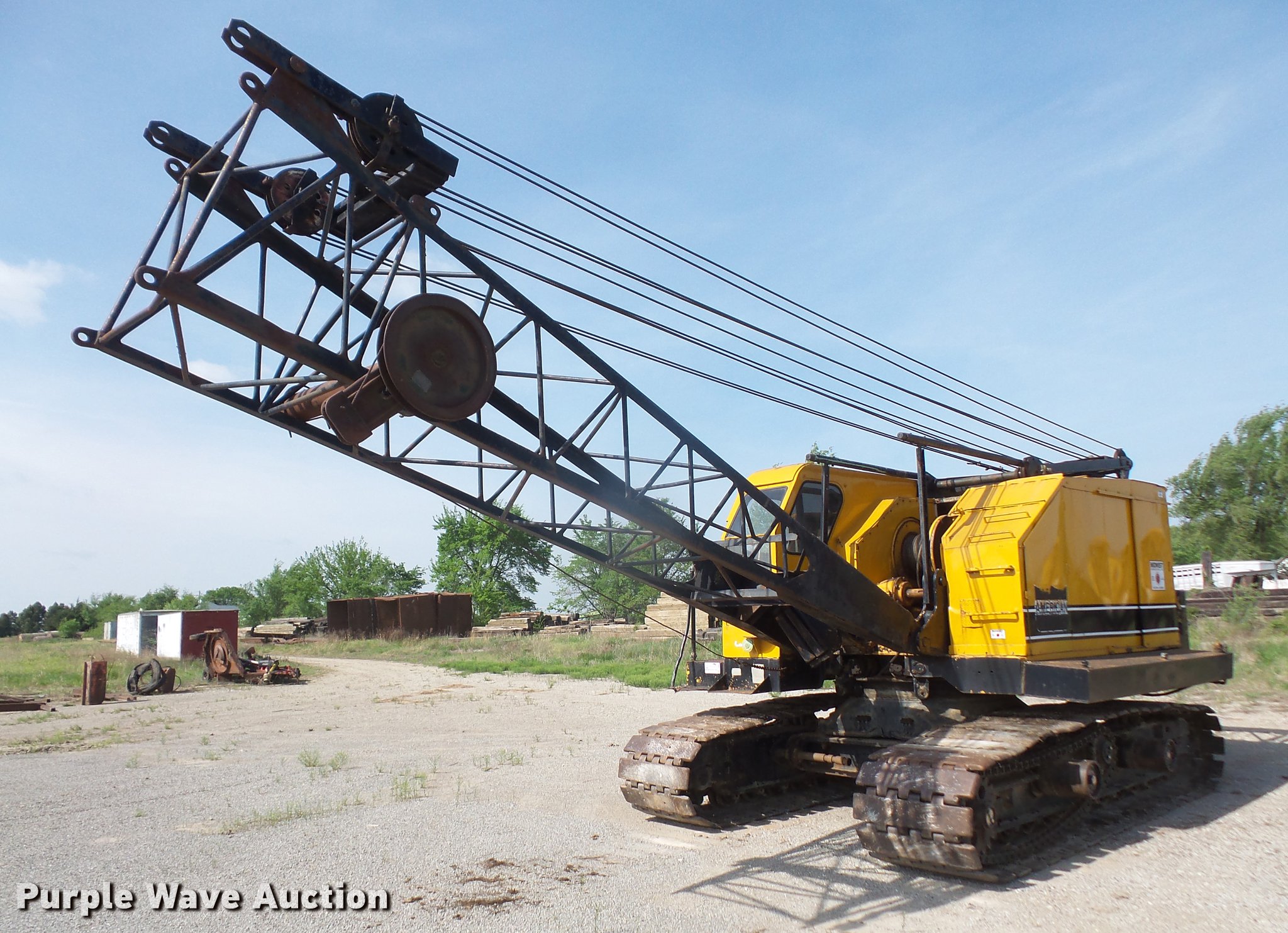 Purple Wave is selling a used Crawler Crane in Kansas. This item is a American 599-C crane with the following: 8,505 hours on meter, Detroit Diesel 461 four cylinder diesel engine, Mechanical propulsion, Air actuated control, Stick crane controls, 95' lattice boom, Four boom sections, 80,000 lbs maximum lift capacity, Individual swing and travel, (2) winches, Crane ball and hook, 35"W extendable tracks, Serial GS5064, Unit# 1