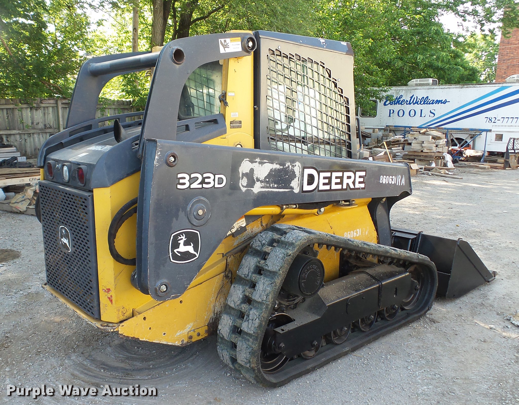 Purple Wave is selling a used Tracked Skid Steer Loader in Kansas. This item is a 2011 John Deere 323D skid steer with the following: 1,212 hours on meter, John Deere four cylinder diesel engine, Hydrostatic transmission, Enclosed cab, AC and heat, Hand and foot controls, Spring suspension seat, Front work lights, Block heater, John Deere T72 72"W bucket, 17.8 cu.yd. capacity, Weld-on cutting edge, Weld-on teeth, Manual quick coupler, Auxiliary hydraulics, 12"W tracks, Unit requires starting fluid to start, Possible fuel bleed down issue, Door missing, Serial 1T0323DACB0198085