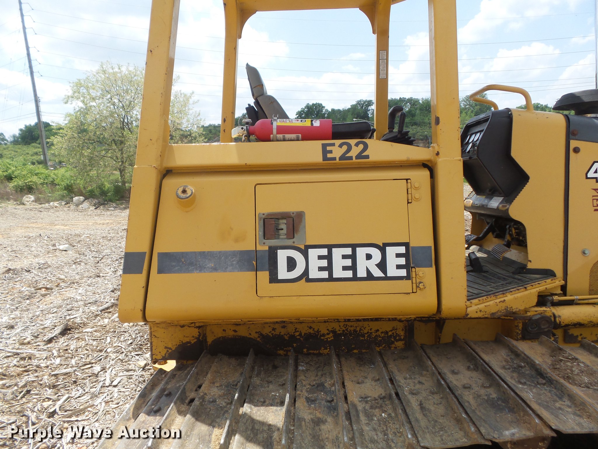 1999 John Deere 450H LGP dozer. 12,189 hours on meter, John Deere 4045T four cylinder turbo diesel engine 74 HP, Hydrostatic transmission, Canopy, Suspension seat, Backup alarm, Joystick control steering, Front work lights, 124"W six-way dozer blade, Rear draw bar, Six bottom rollers, 24"W single grouser track pads, Serial T0450HX880104, Unit# E22. Kuesel Excavating Co.. 854 Lone Star Dr. O'Fallon, MO 63366
