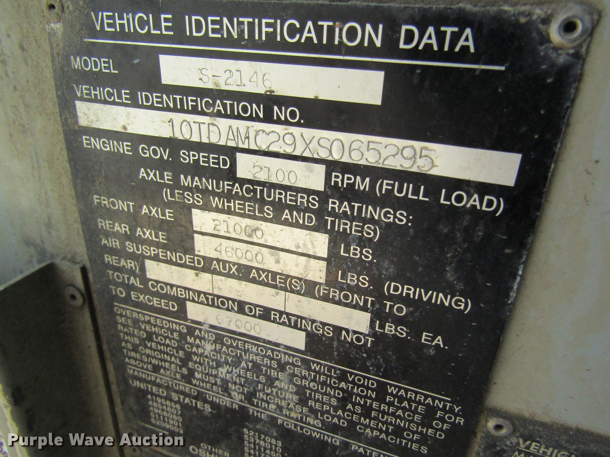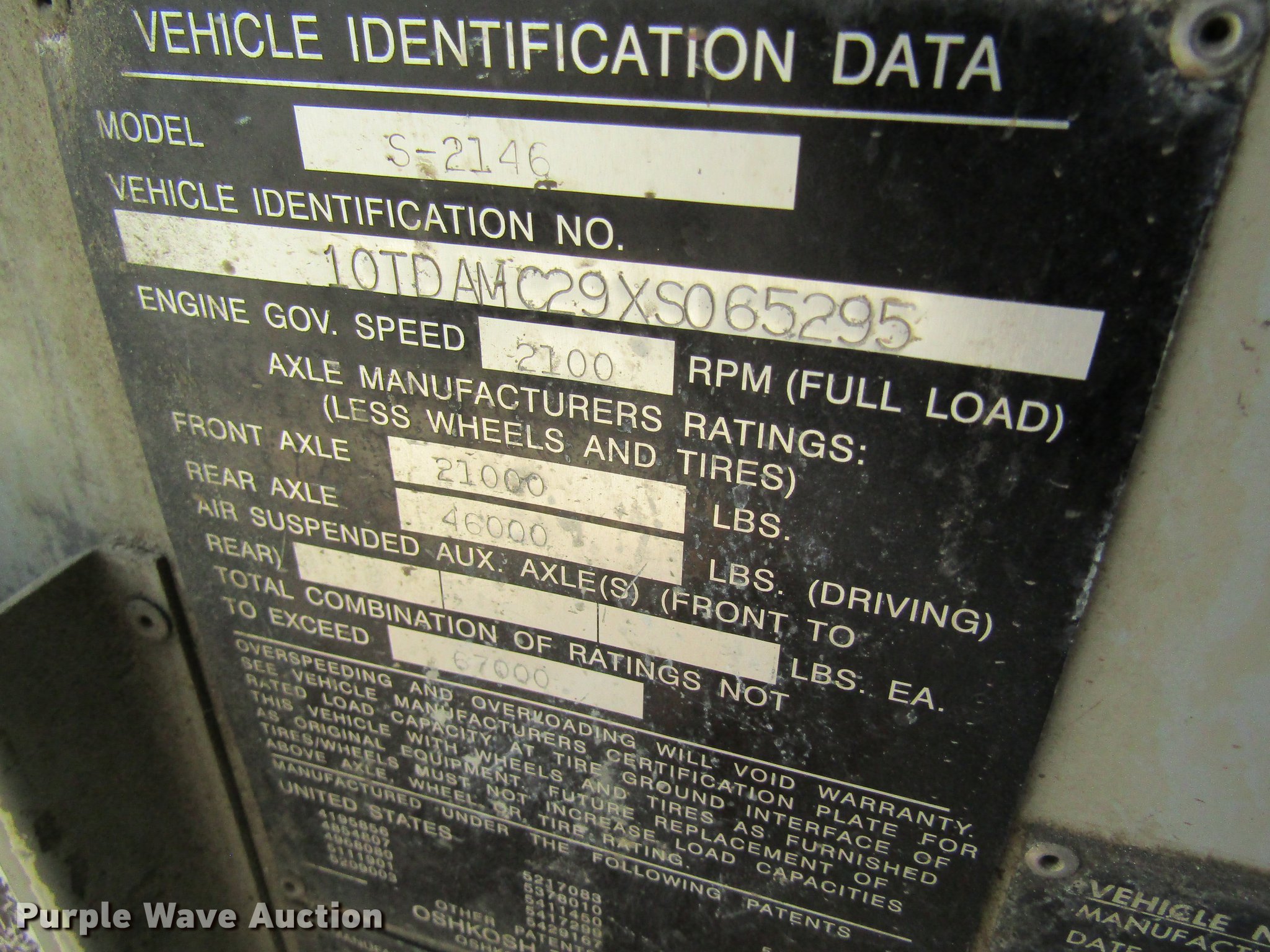 Purple Wave is selling a used Ready Mix or Pump Truck in Missouri. This item is a 1999 Oshkosh S2146 ready mix truck with the following: 178,837 miles on odometer, 8,551 hours on meter, Cummins M11 10.8L L6 turbo diesel engine, Automatic transmission, Six wheel drive, Triple axle, Heat, Cruise, AM/FM, Air suspension seat, PTO, 11 cu.yd. mixer bed, Single fuel tank, Single exhaust stack, Spring suspension, Air brakes, 445/65R22.5 front tires, 11R22.5 rear tires, GVWR 67,000 lbs