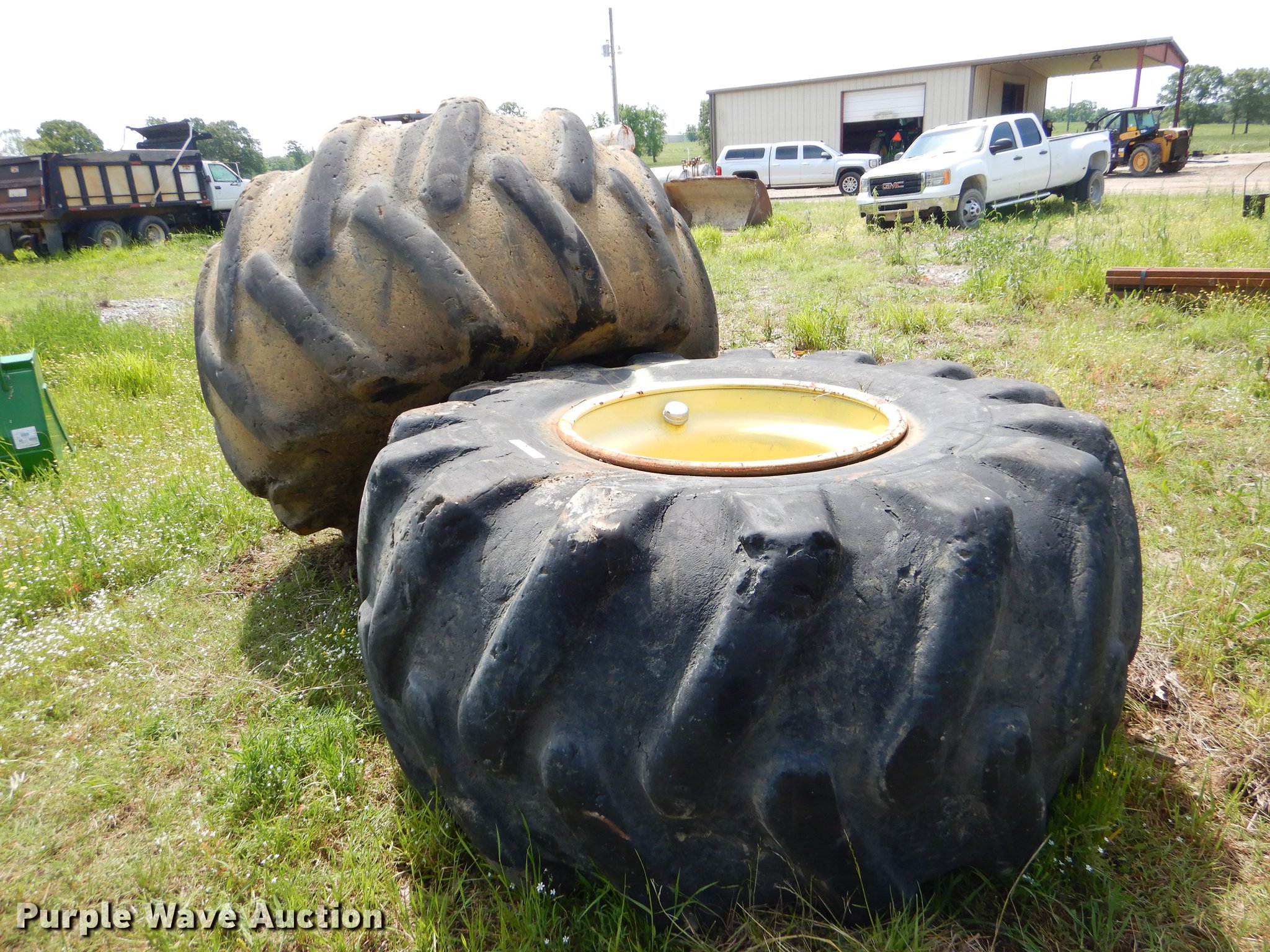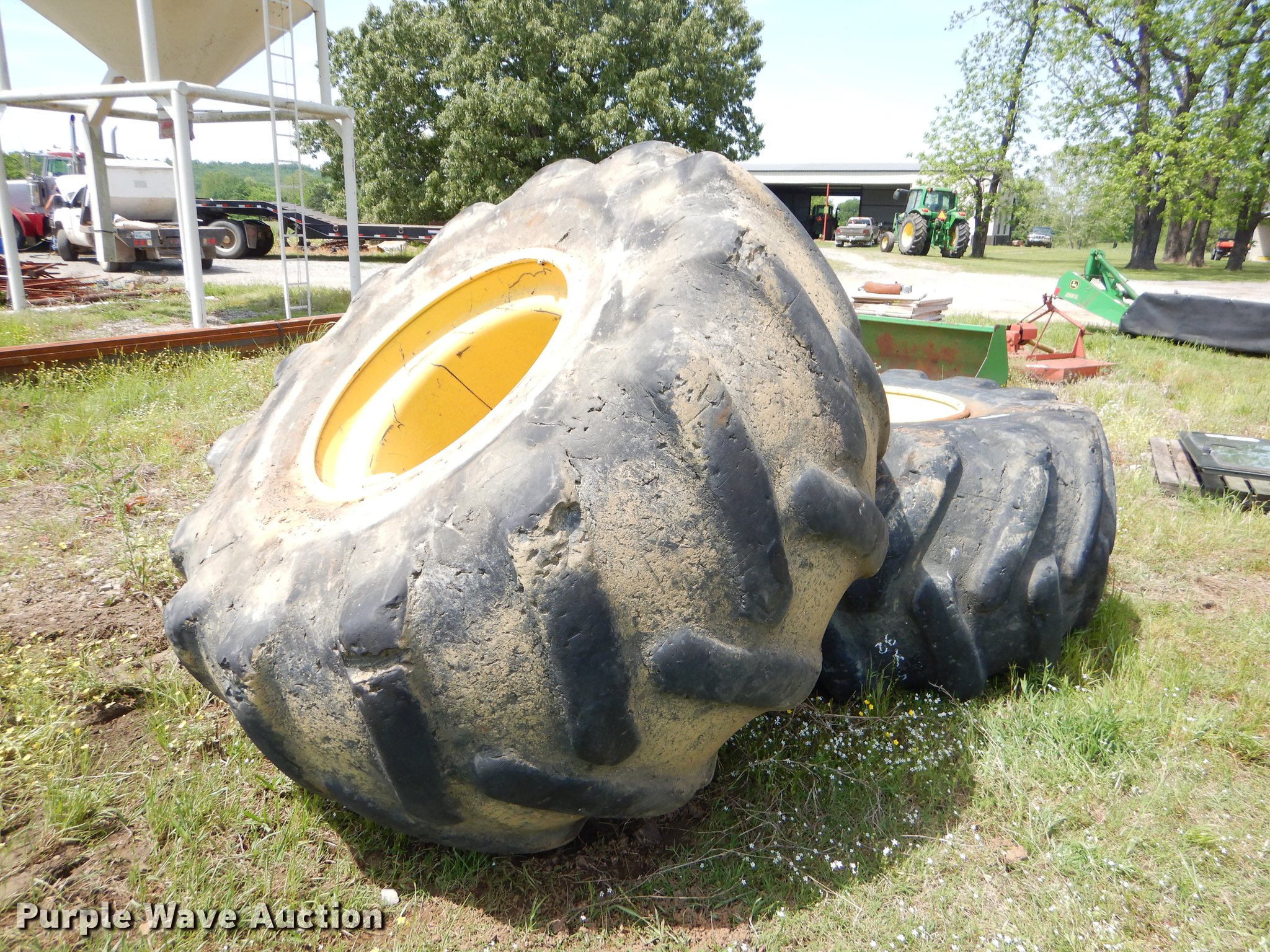 Purple Wave is selling a used Industrial Tires or Tracks in Oklahoma. This item is a 35.5 x 32 tires with the following: John Deere 14 lug wheels