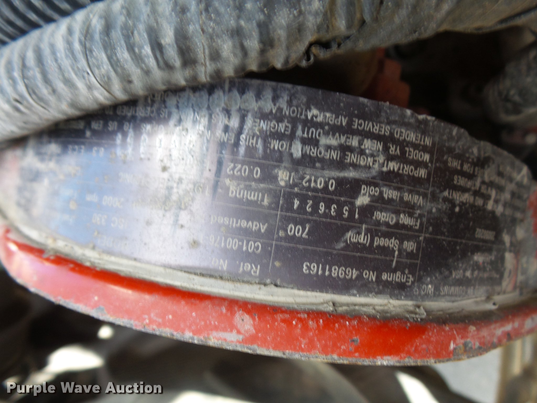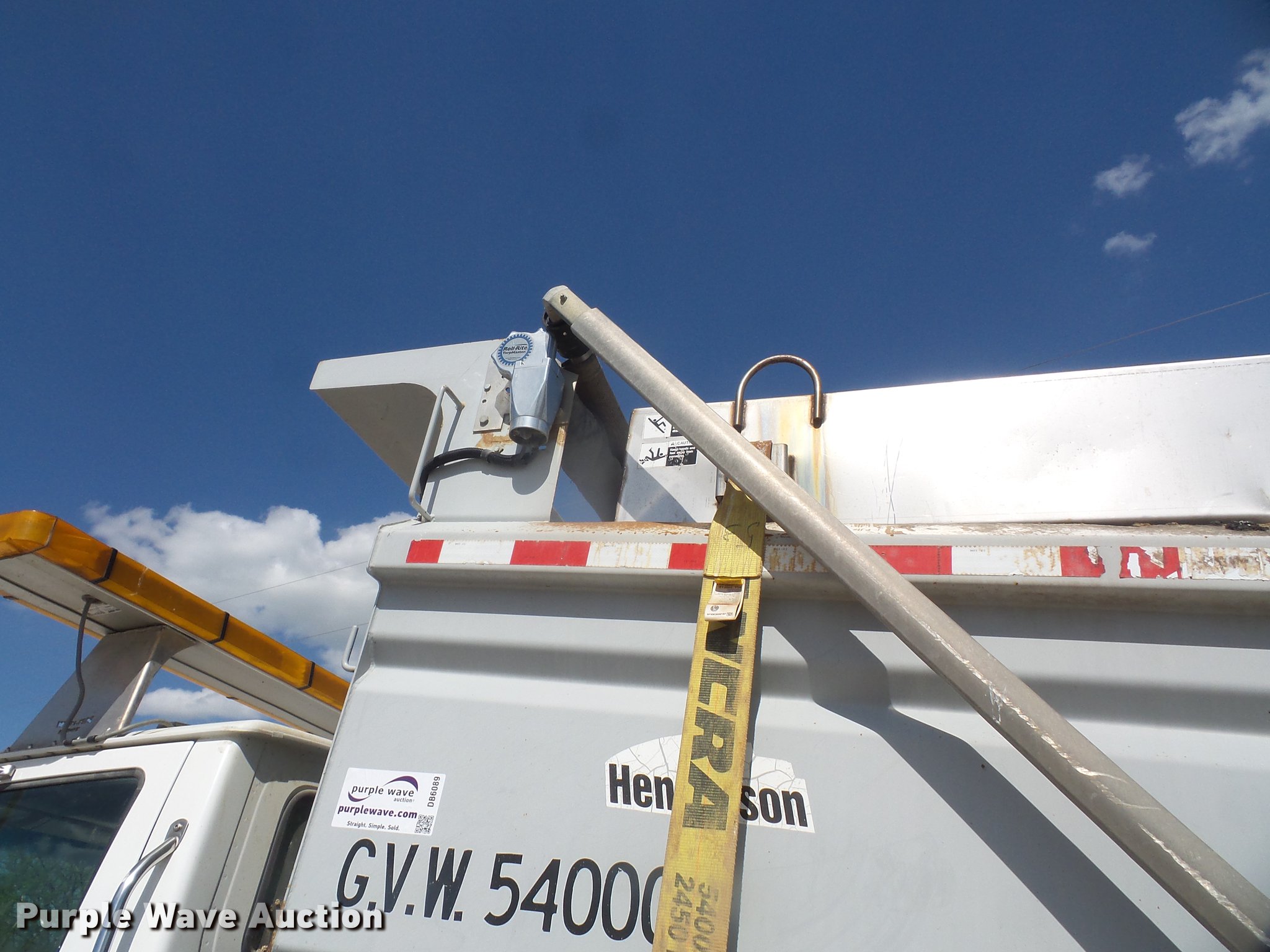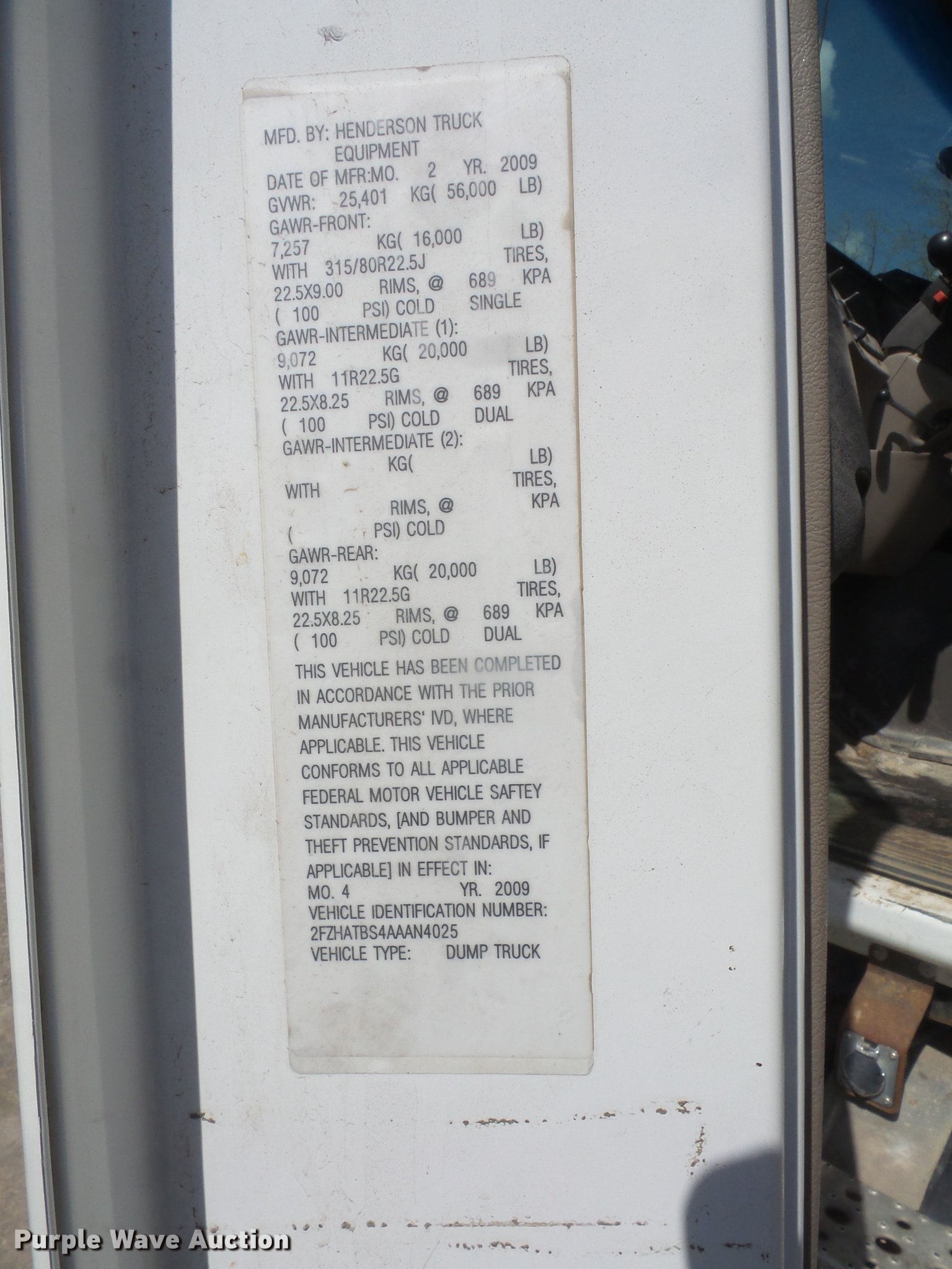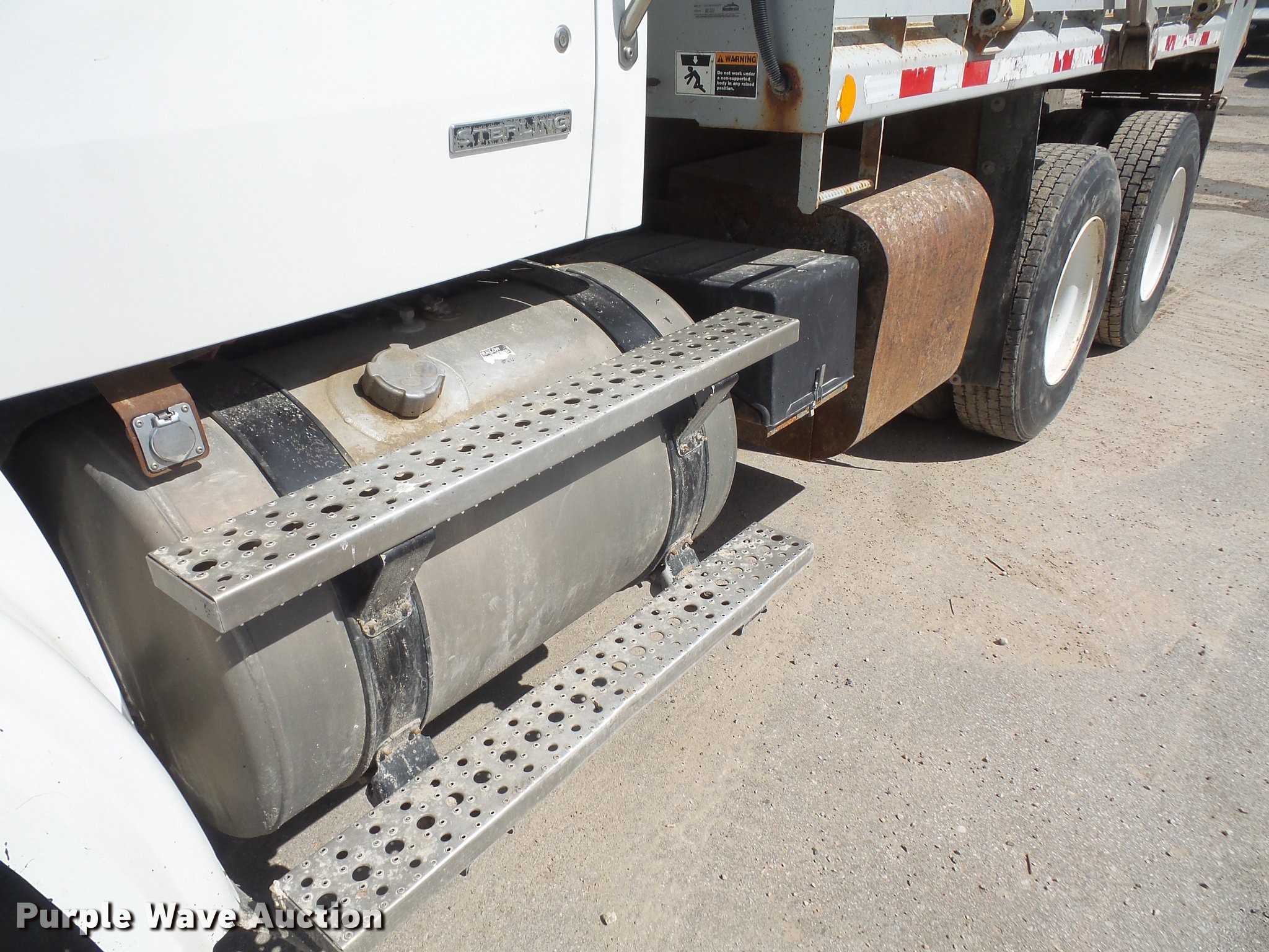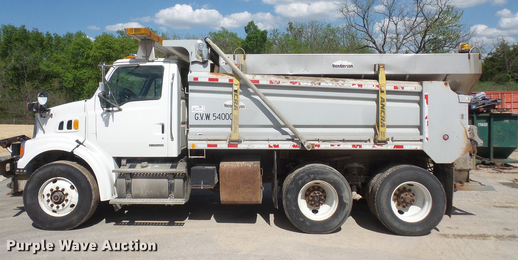 Purple Wave is selling a used Construction Dump Truck in Kansas. This item is a 2010 Sterling L7500 dump truck with the following: 258,686 miles on odometer, Cummins ISC 8.3L L6 turbo diesel engine, 330 HP, Serial 46981163, Allison automatic transmission, Inter-axle differential lock, Tandem axle, AC and heat, Cruise, AM/FM, Power windows, Air suspension seat, Front mount PTO, In-cab plow and spreader controls, Henderson steel dump bed, 15'L x 96"W, 36" side height, Single ram hoist, Air operated end gate, Roll tarp, Henderson 14' spreader, Poly tanks, Toolboxes, Snow plow mounting bracket, Single fuel tank, Spring suspension, Air brakes, 315/80R22.5 front tires, 11R22.5 rear tires, GVWR 56,000 lbs, FAWR 16,000 lbs, IAWR 20,000 lbs, RAWR 20,000 lbs