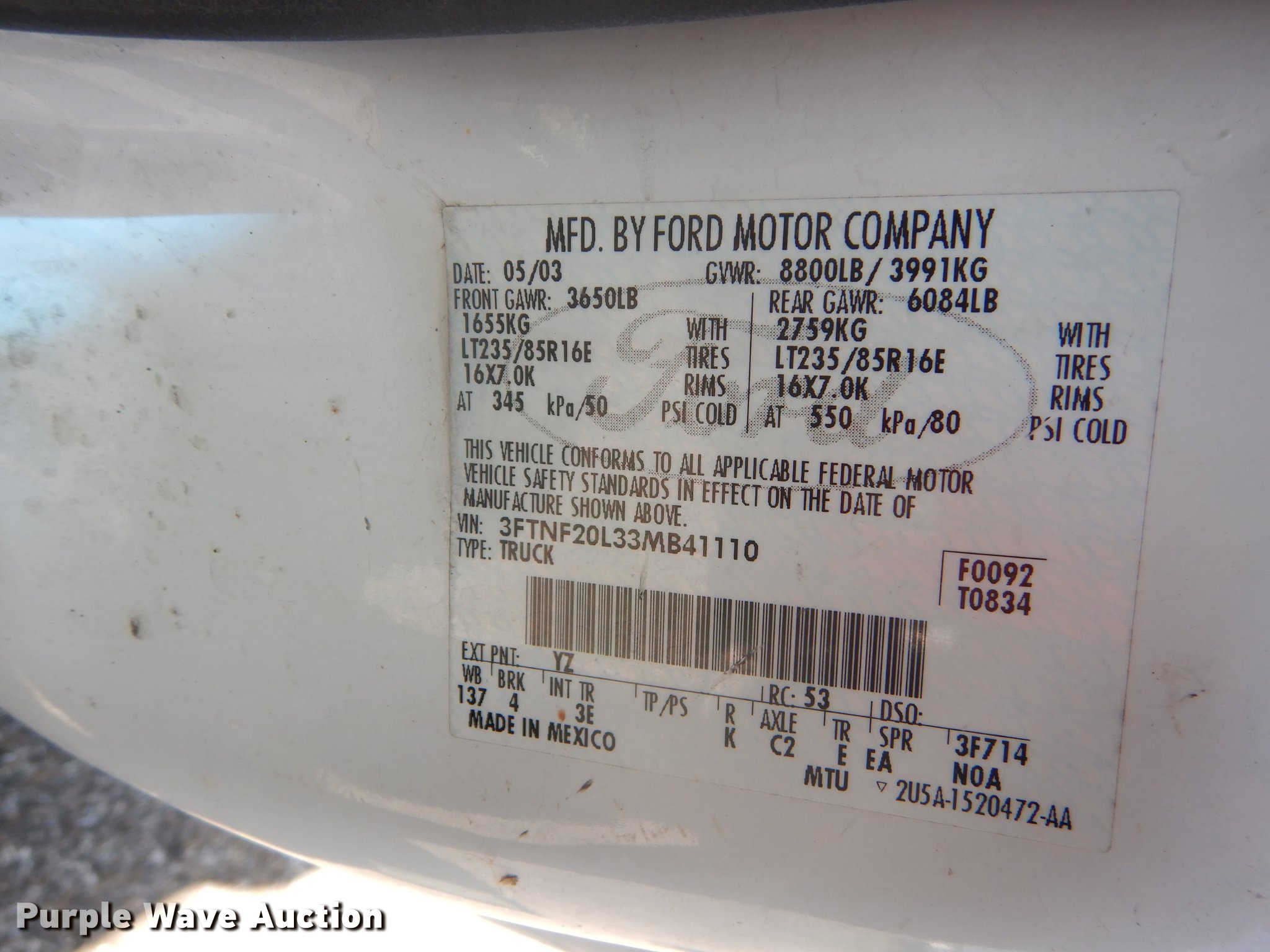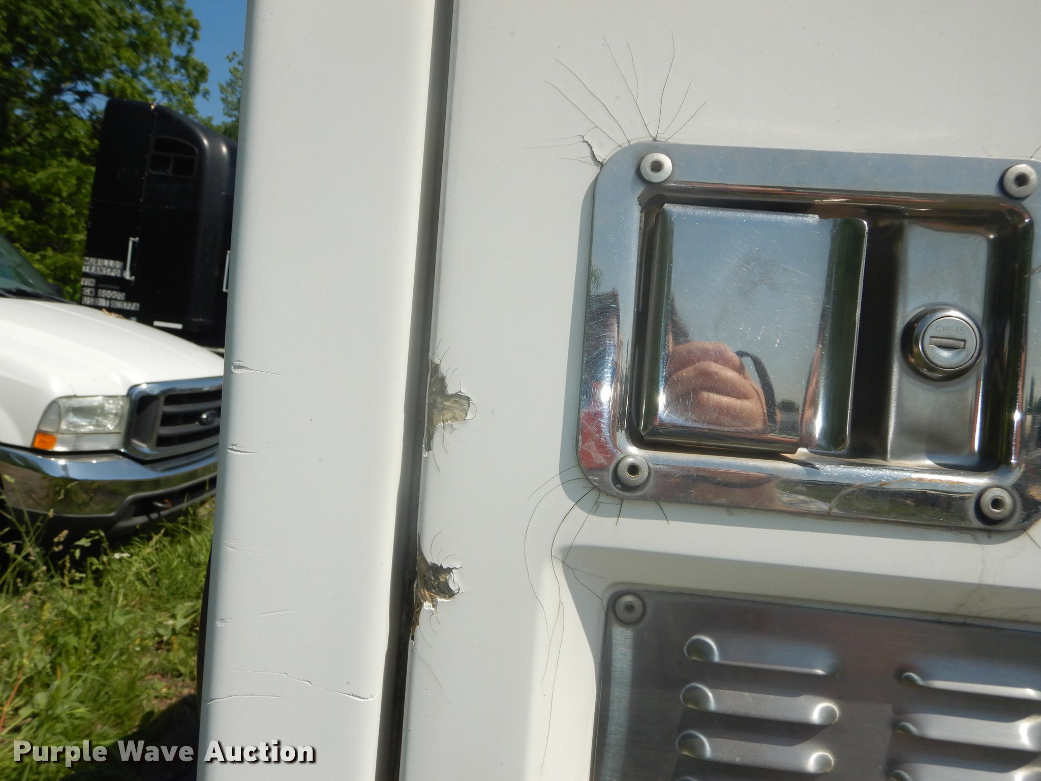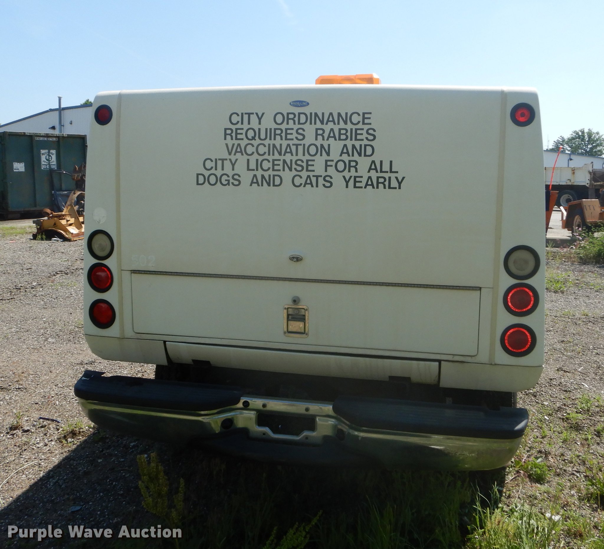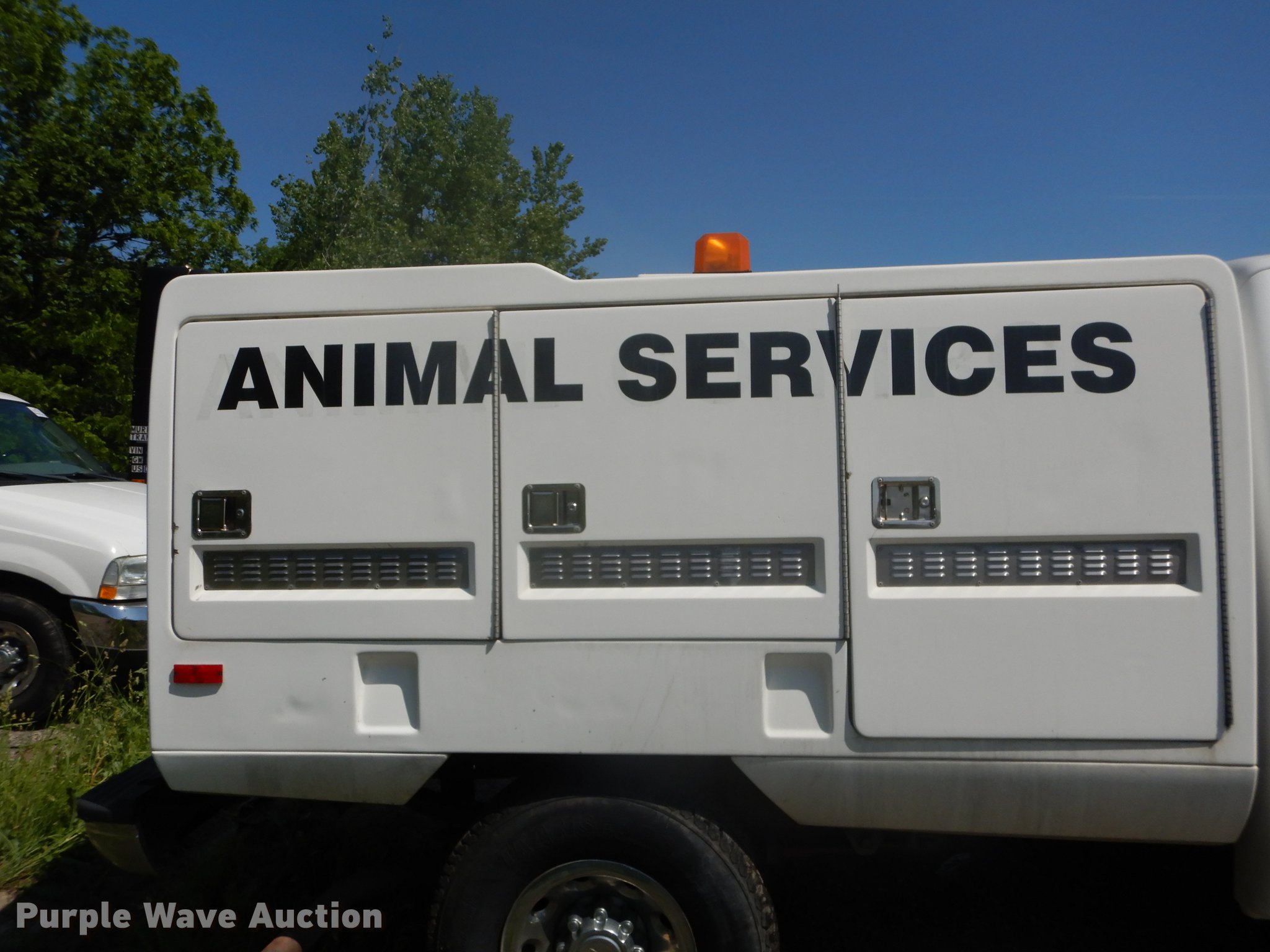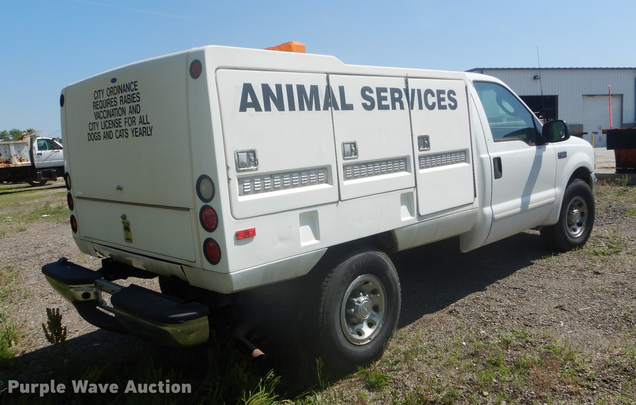 Purple Wave is selling a used 3/4 or 1 Ton Pickup or Van in Kansas. This item is a 2003 Ford F250 Super Duty XLT utility bed pickup truck with the following: 178,875 miles on odometer, 5.4L V8 SOHC 16V gas engine, Automatic transmission, AC and heat, Tilt, Cruise, AM/FM, Power windows, locks, and mirrors, Cloth interior, Front tow hooks, Fiberglass animal services bed, 8'L x 78"W, 235/85R16 tires, Engine oil leak