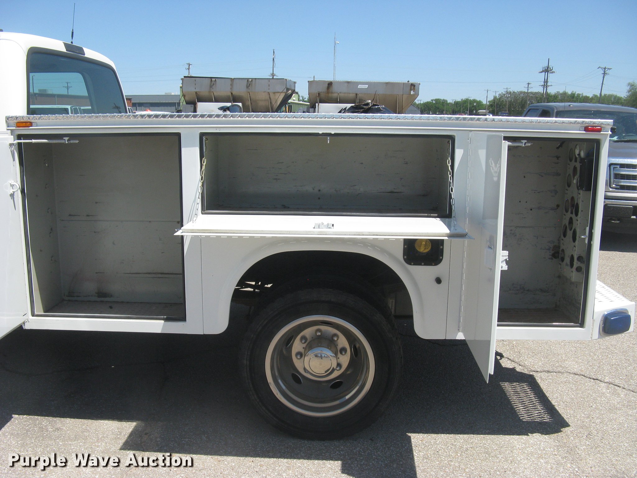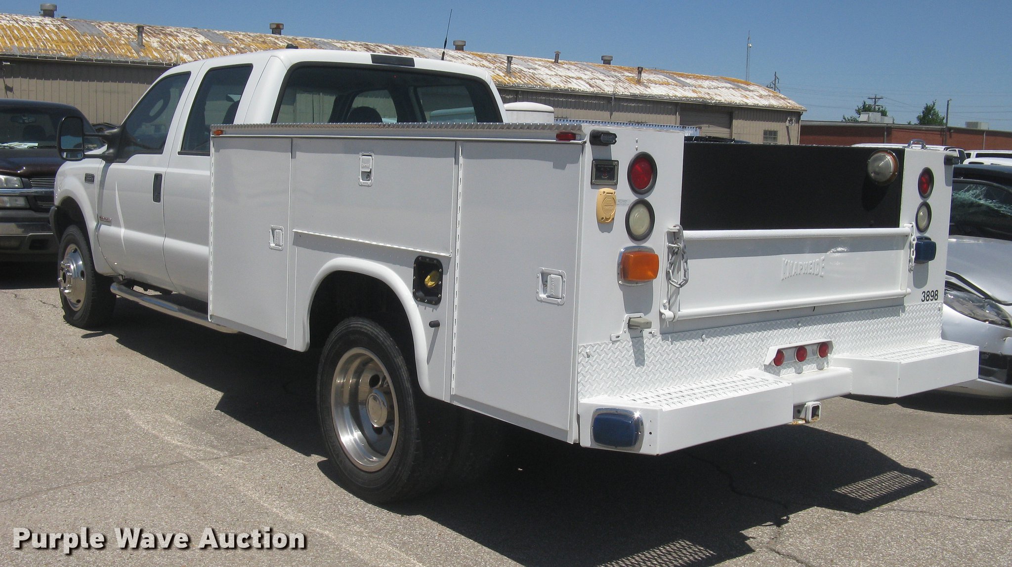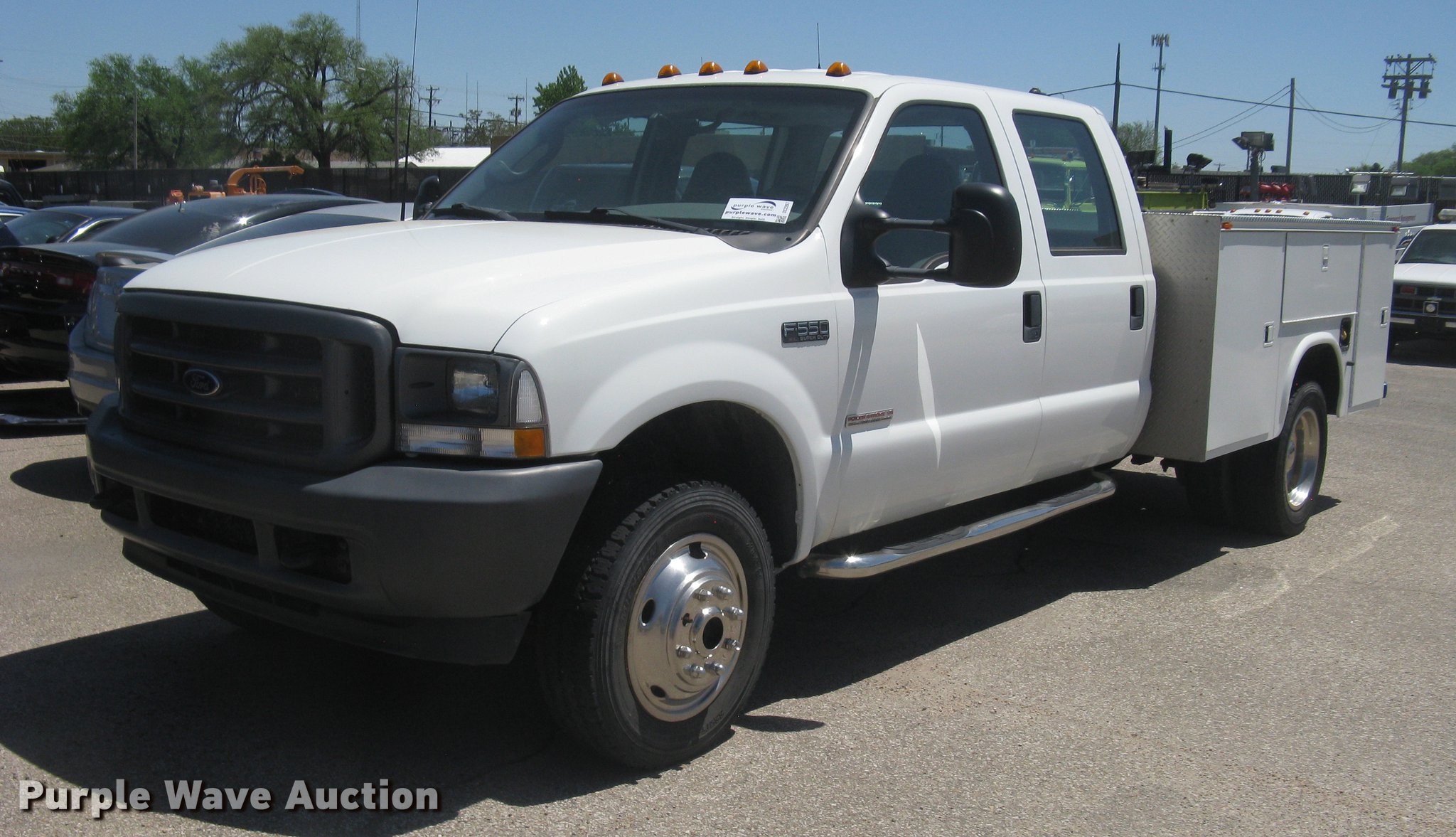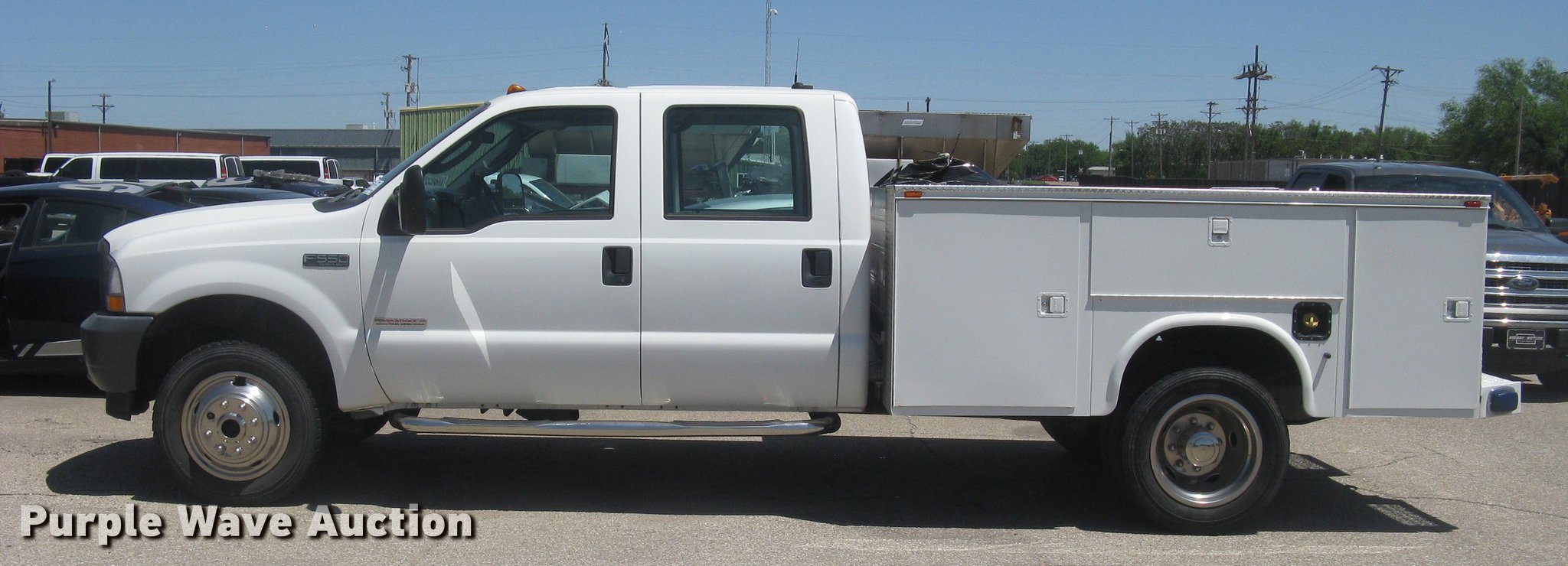 Purple Wave is selling a used Service Truck in Kansas. This item is a 2003 Ford F550 Super Duty XL Crew Cab utility truck with the following: Approx. 113,892 miles, 6.0L V8 OHV 32V turbo diesel engine, Automatic transmission, Four wheel drive, AC and heat, Tilt, Cruise, AM/FM, Power windows and locks, Vinyl interior, Front tow hooks, Running boards, Knapheide 6108D58J utility bed, 9'L x 94"W, Receiver hitch, Trailer wiring, 225/70R19.5 tires, Port holes in roof, No rear seats, Non-operational engine, Dead battery, Non-operational unit, Unit# 3898
