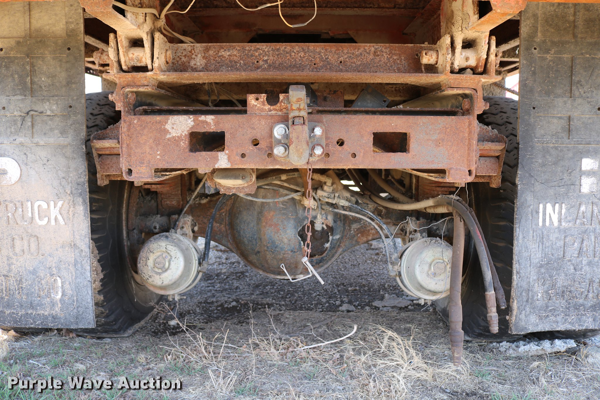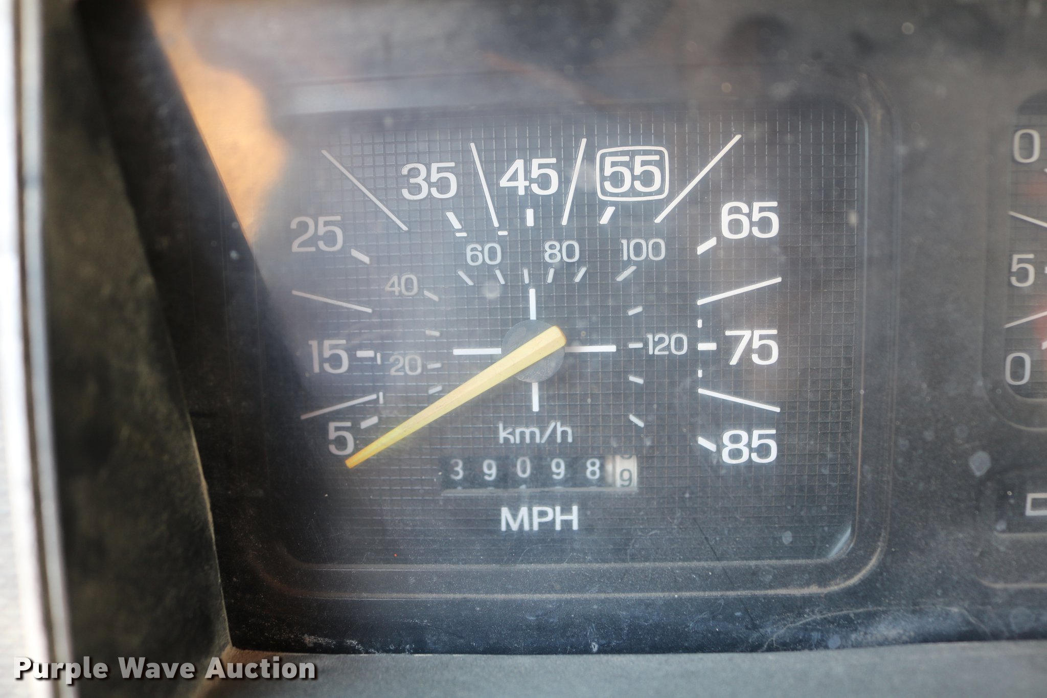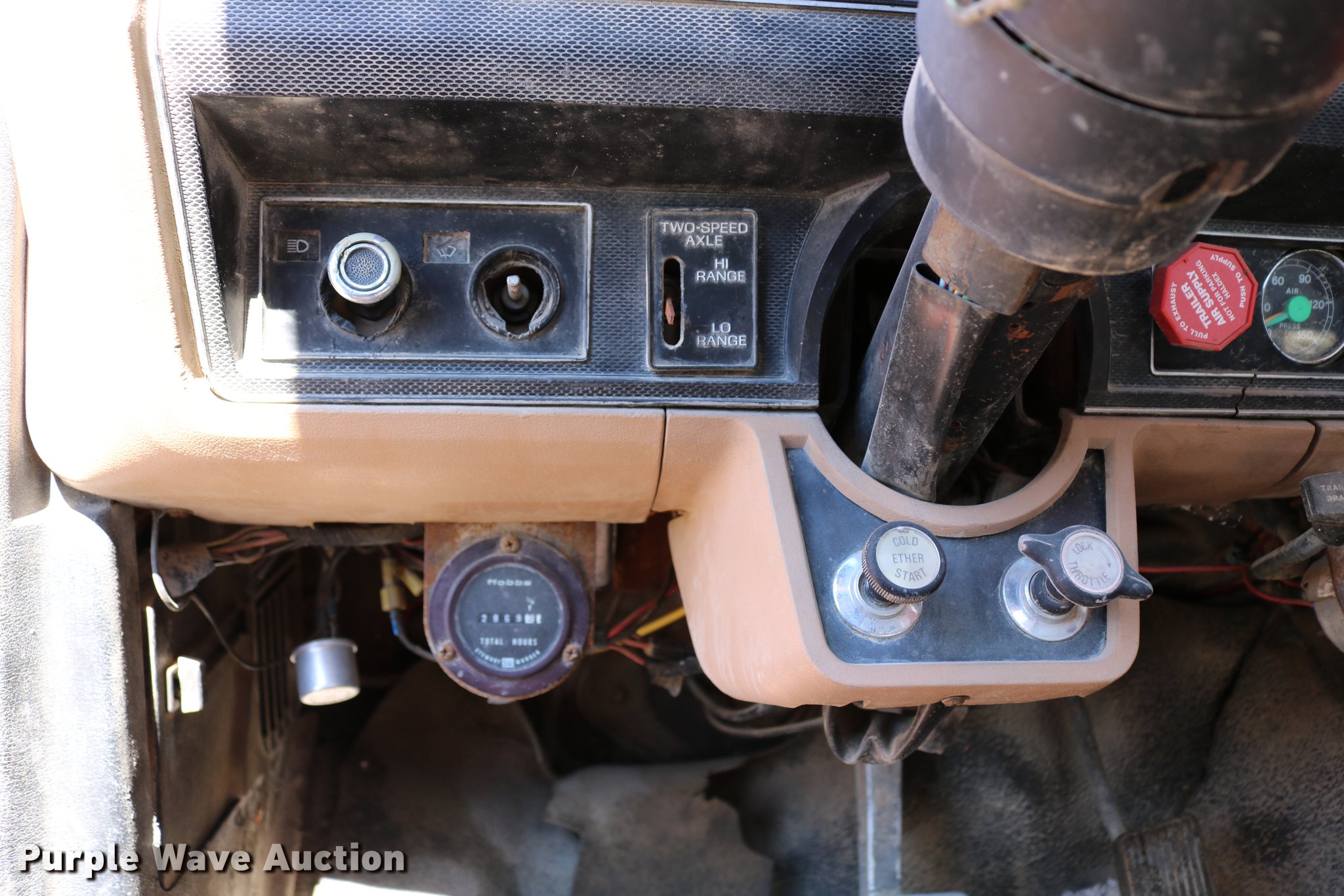 Purple Wave is selling a used Construction Dump Truck in Kansas. This item is a 1983 Ford F700 dump truck with the following: 39,099 miles on odometer, Actual mileage unknown, 2,869 hours on meter, Detroit Diesel 8.2L V8 diesel engine, Automatic transmission, Two speed rear end, Single axle, Heat, Toolboxes, PTO, Smith 9X87 steel dump bed, 9'L x 96.5"W, 25.5" side height, Manual end gate, Single ram hoist, Serial 904999, Single fuel tank, Pintle hitch, Spring suspension, Air brakes, 153" wheelbase, GVWR 27,500 lbs, Engine issues, Engine hood hinge broken, Driver side door window missing, Passenger side door will not open fully, binds with fender, Passenger side visor missing, Non-operational unit, Unit must be towed or hauled