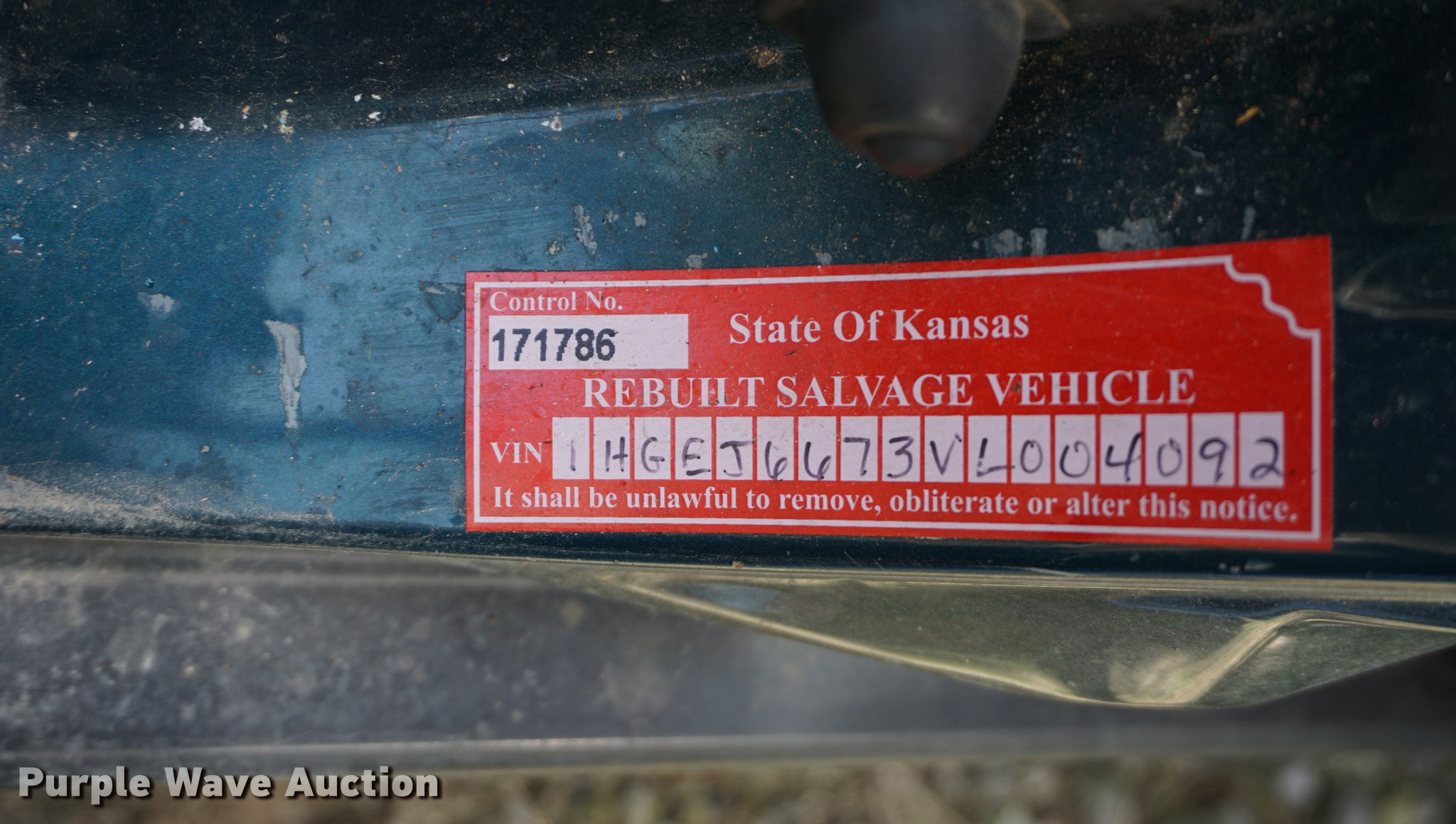 1997 Honda Civic. 167,417 miles on odometer, 1.6L L4 SOHC 16V gas engine, Automatic transmission, AC and heat, Tilt, Cruise, AM/FM, Power windows, locks, and mirrors, Cloth interior, 185/65R14 tires, Check engine light on. Kansas rebuilt salvage title. 1HGEJ6673VL004092. Jackson County Sheriff. Holton, KS 66436