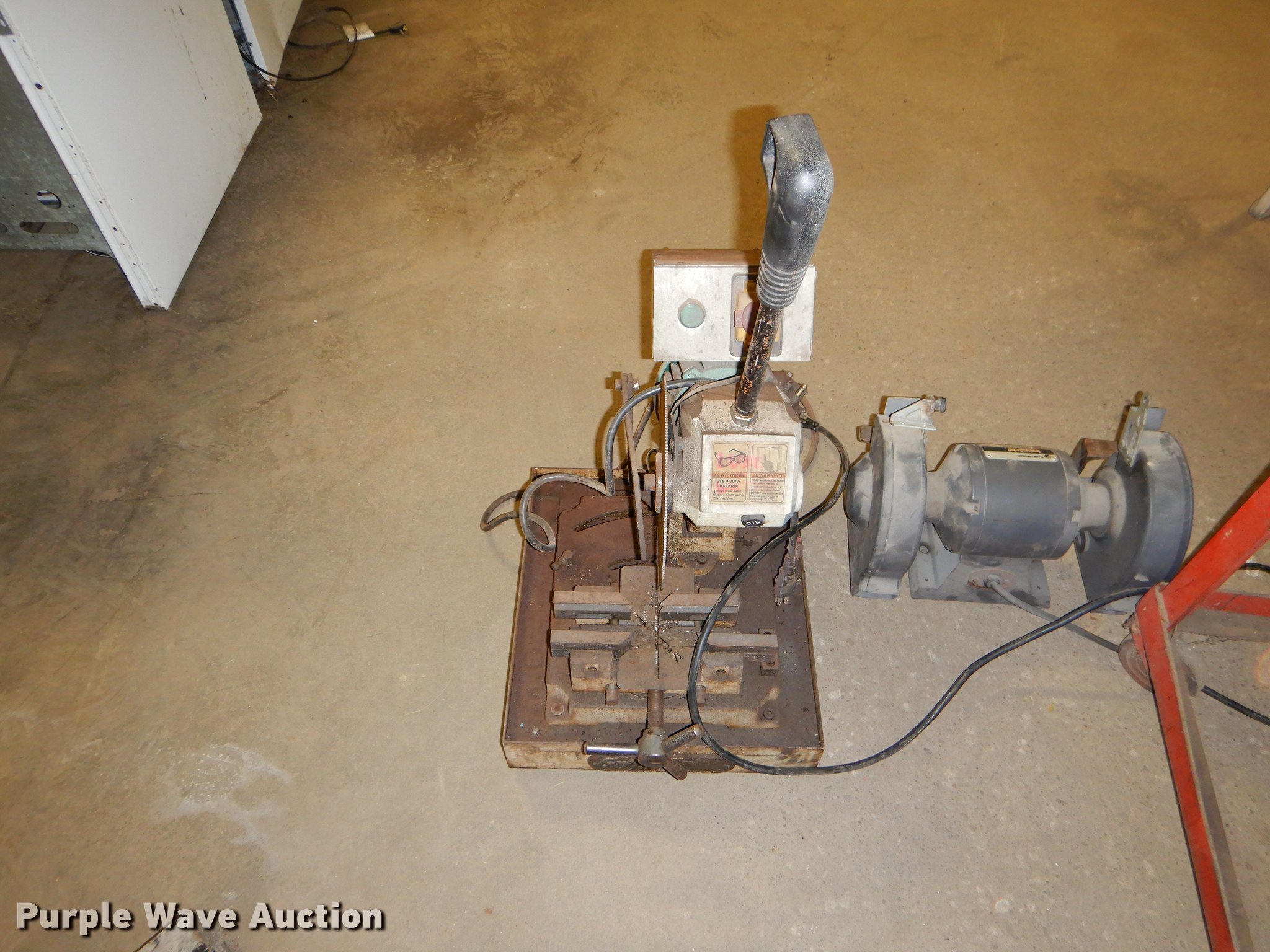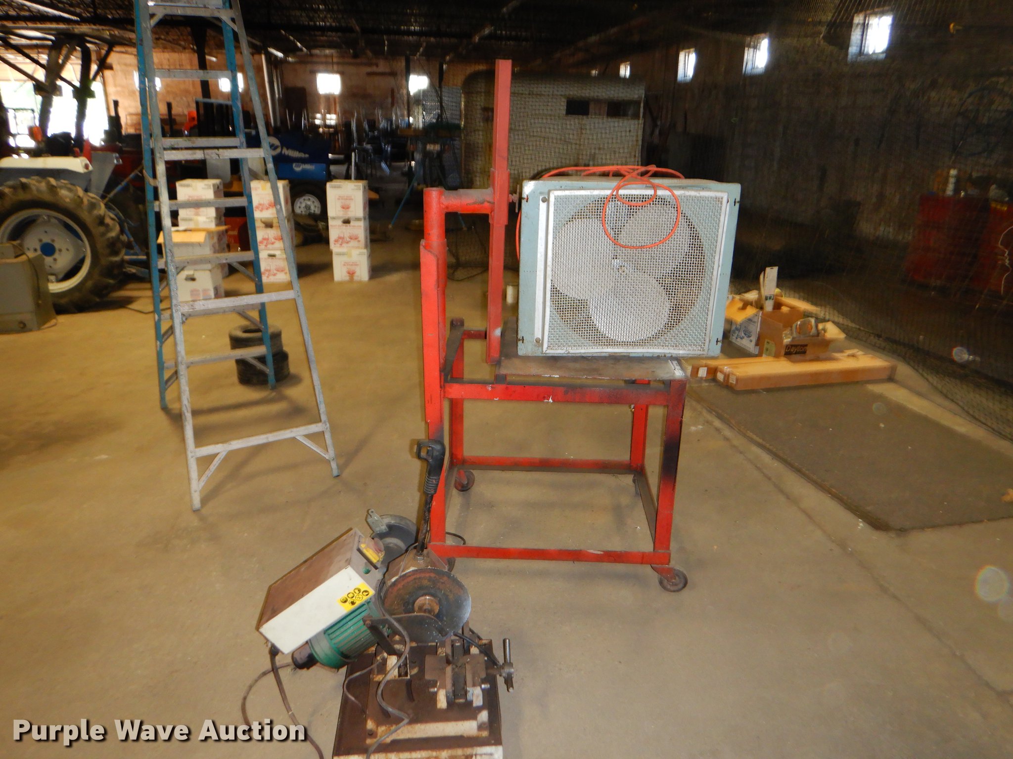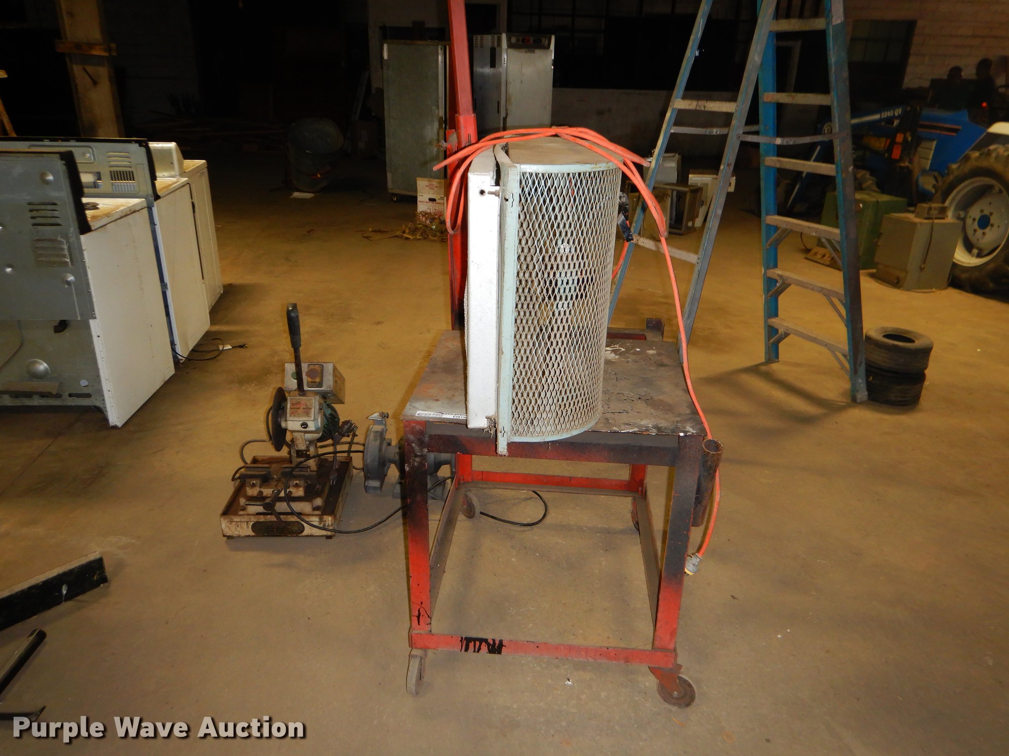 Purple Wave is selling a used Tools in Kansas. This item is a Tools with the following: 2009 Grizzly slow speed cut saw, 9", 120V, Serial 8047, Black & Decker bench grinder, 3/4 HP, 8", Serial 4112213, Steel table, 33" x 27" x 67", International fan, 120V, Unknown operating conditions