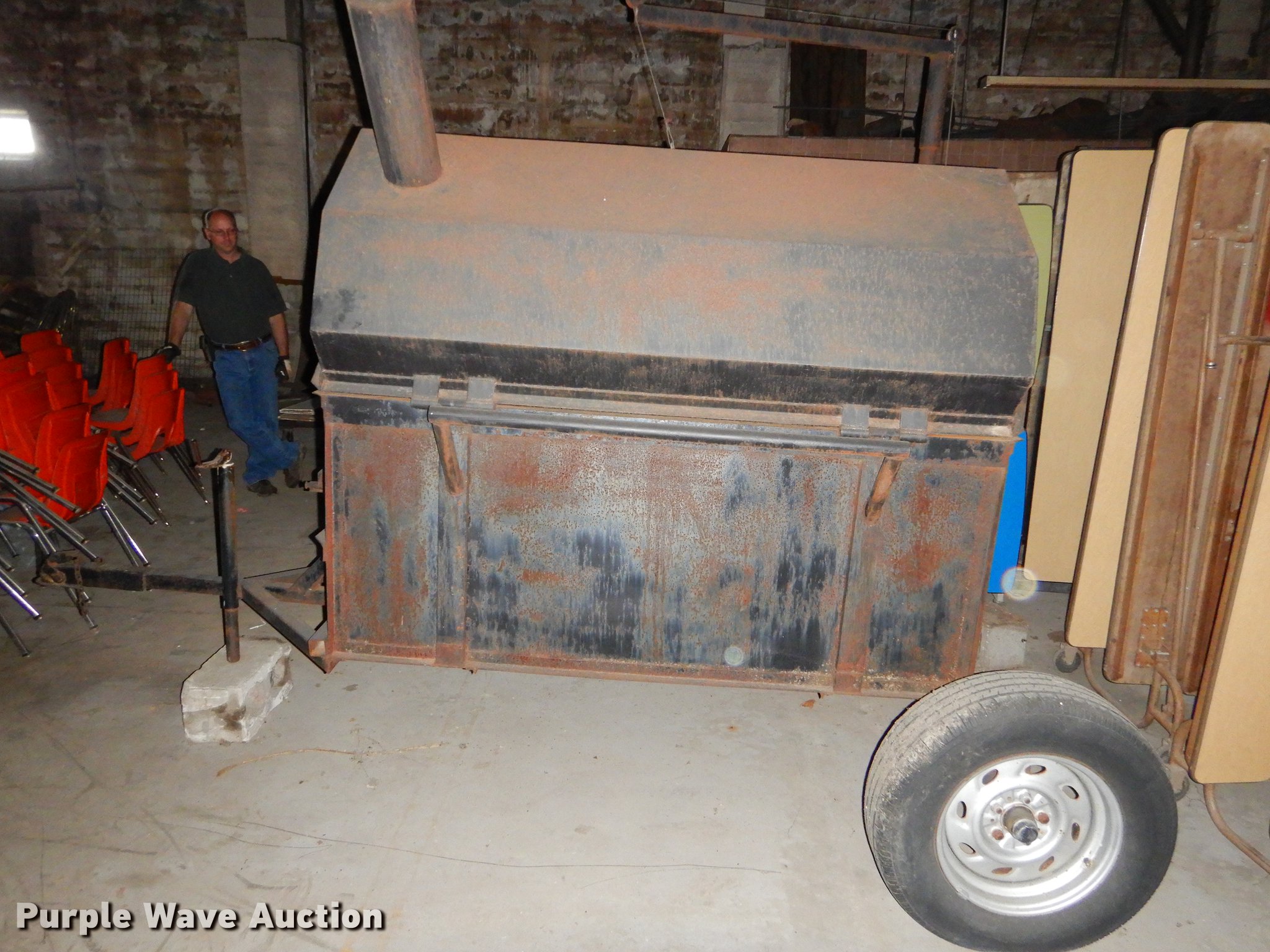 Purple Wave is selling a used Trailer Other in Kansas. This item is a Steel smoker with the following: 10' x 7'W overall, Cooker box, 6'L x 40"W x 44"H, 2" ball hitch, Single leg landing gear, Rigid suspension, Single axle, 205/75R15 tires, 215/75R15 tires