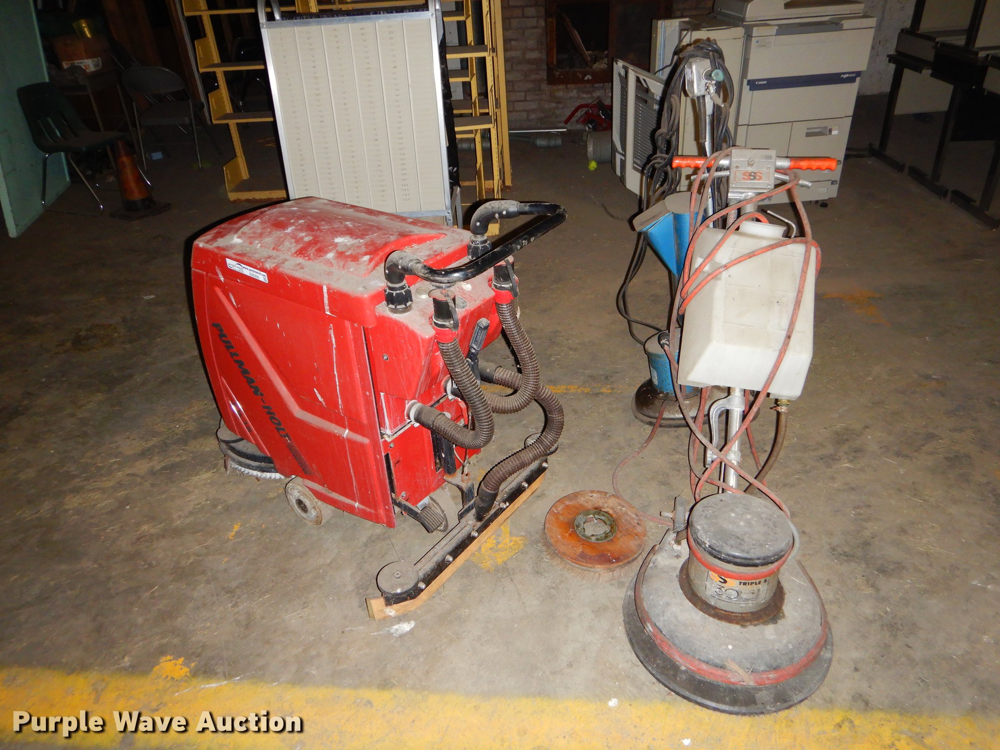 Purple Wave is selling a used All Other Household Items in Kansas. This item is a Sweepers and buffers with the following: Pullman-Holt sweeper, Hild buffer, 110V, SSS buffer, 110V, Unknown operating conditions