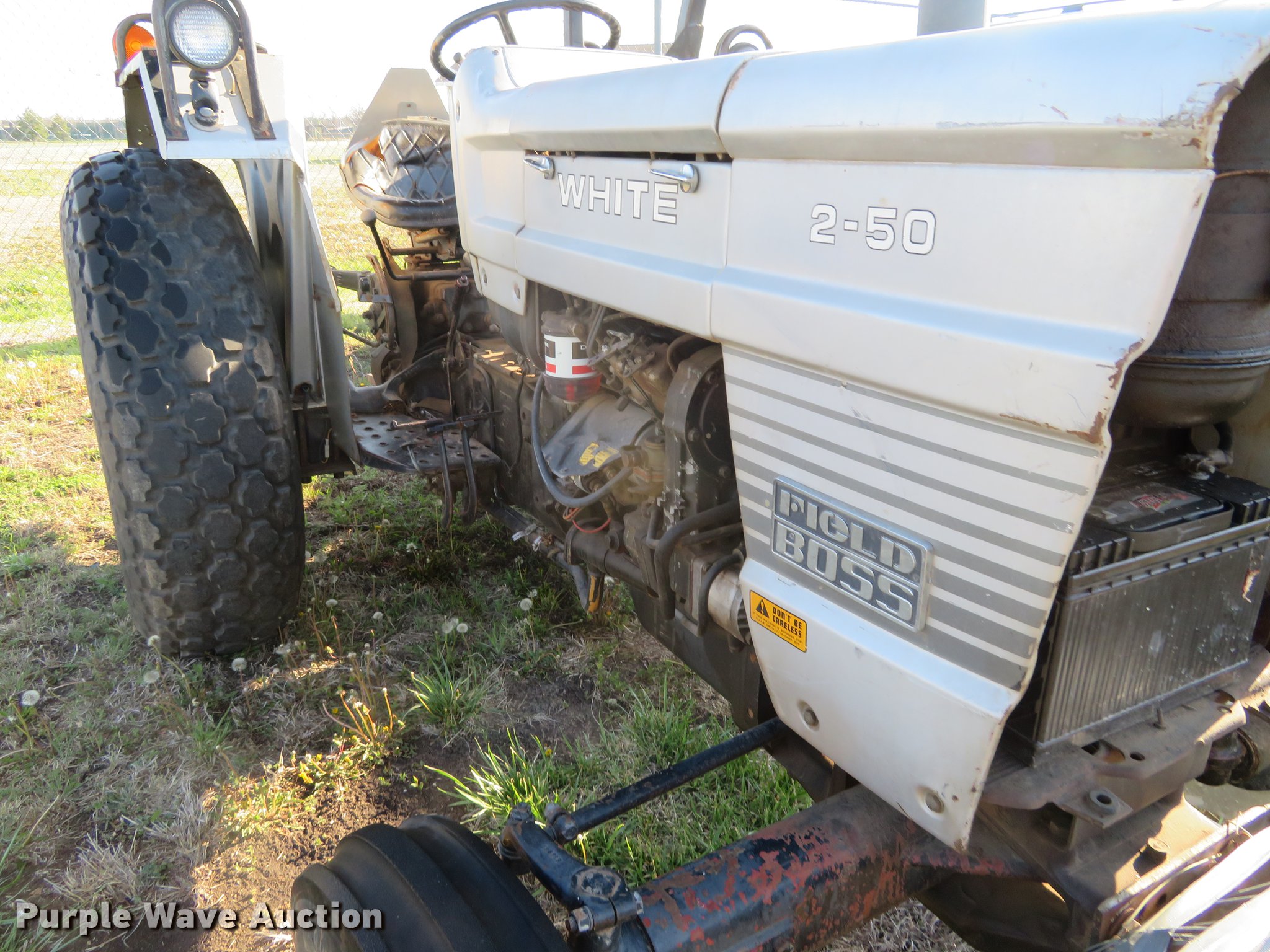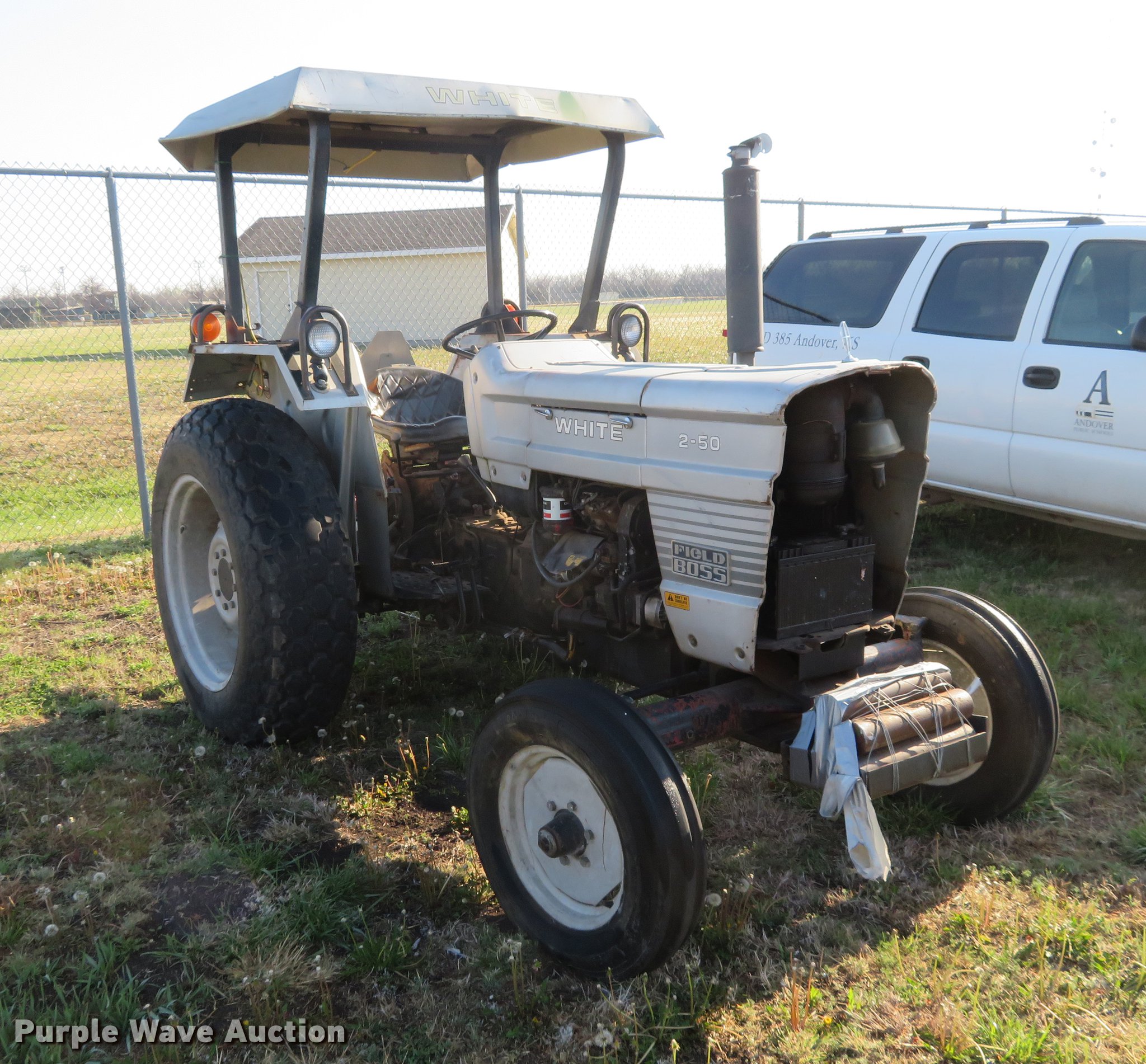 Purple Wave is selling a used Tractor in Kansas. This item is a White 2-50 Field Boss tractor with the following: 3,736 hours on meter, Three cylinder diesel engine, 8F-2R gears, Three point, 540 PTO, Draw bar, Rear hydraulic remote, 6.00-16 front tires, 13.6-28 rear tires, Serial 524895
