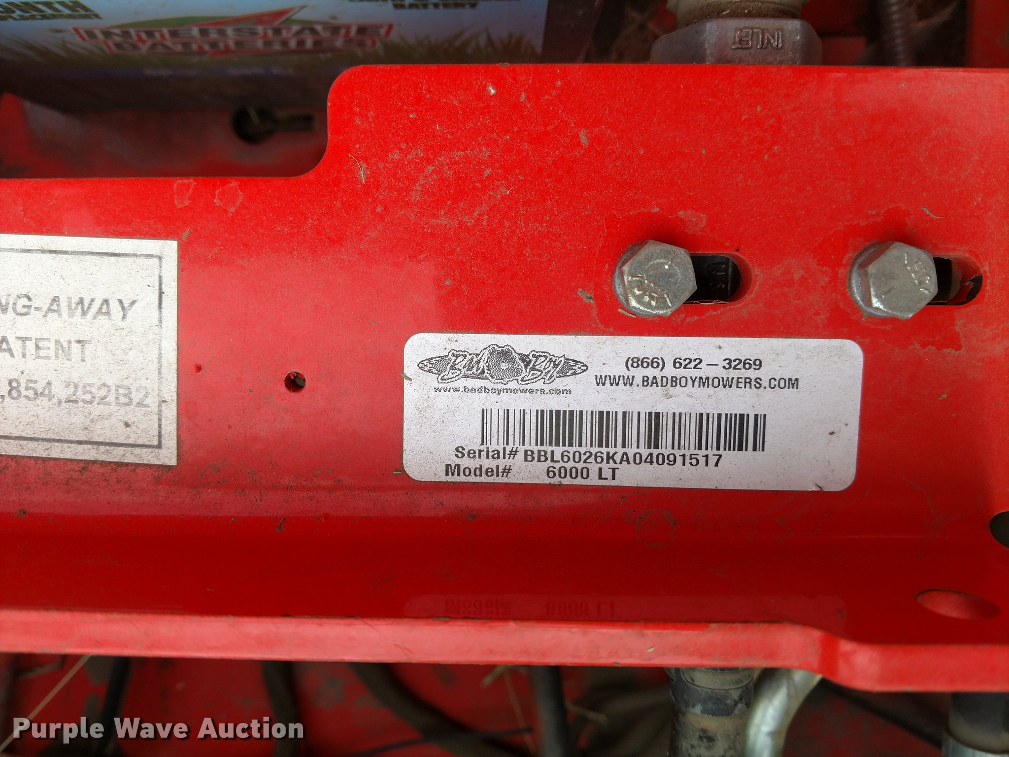 Purple Wave is selling a used Commercial Turf Mower in Kansas. This item is a Bad Boy ZTR lawn mower with the following: 1,377 hours on meter, 60" cut, 26 HP gas engine, Hydrostatic transmission, Electric height adjust, 13x6.50-6 NHS front tires, 24x12.00-12 NHS drive tires, Serial BBL6026KA04091517