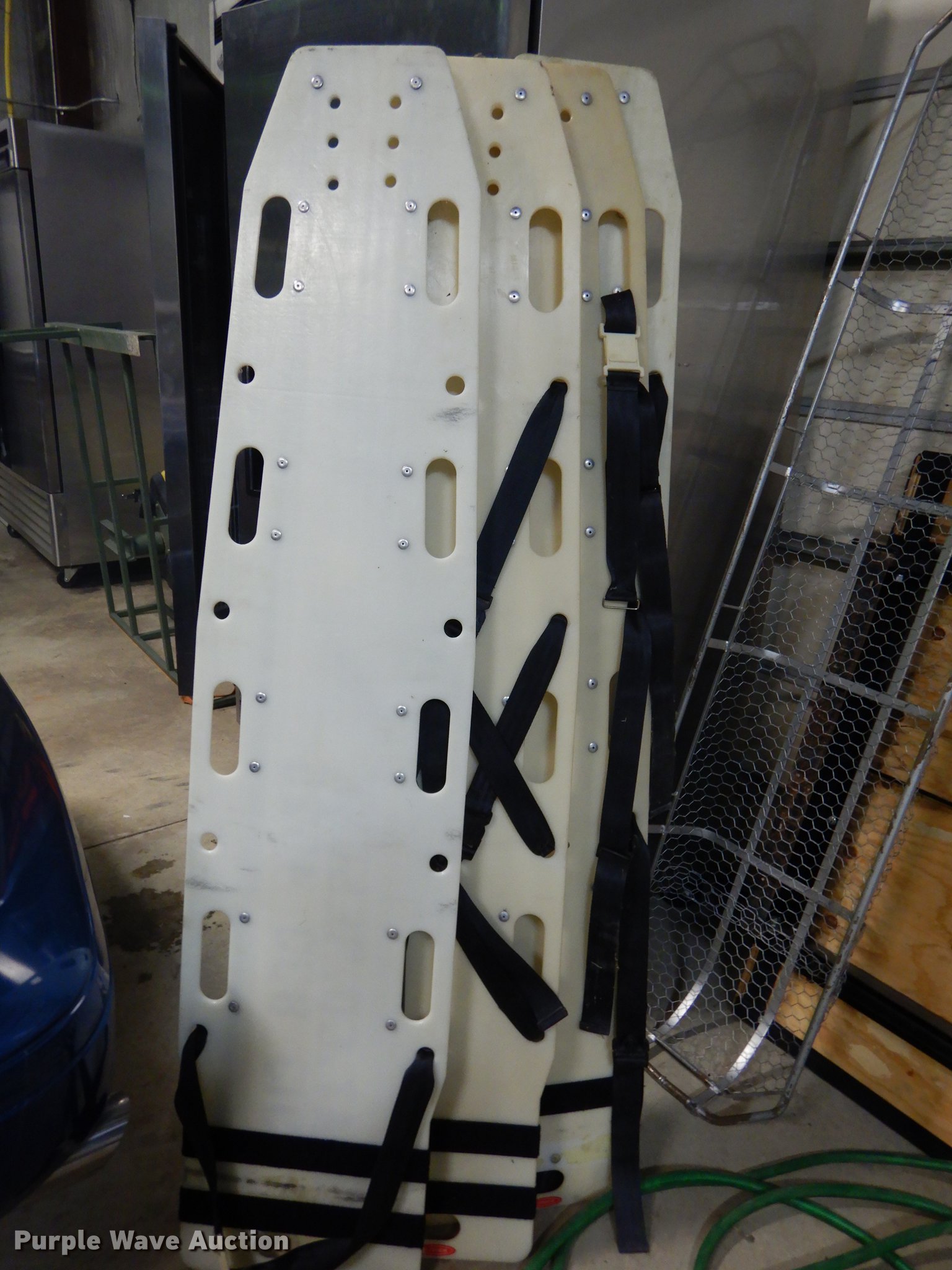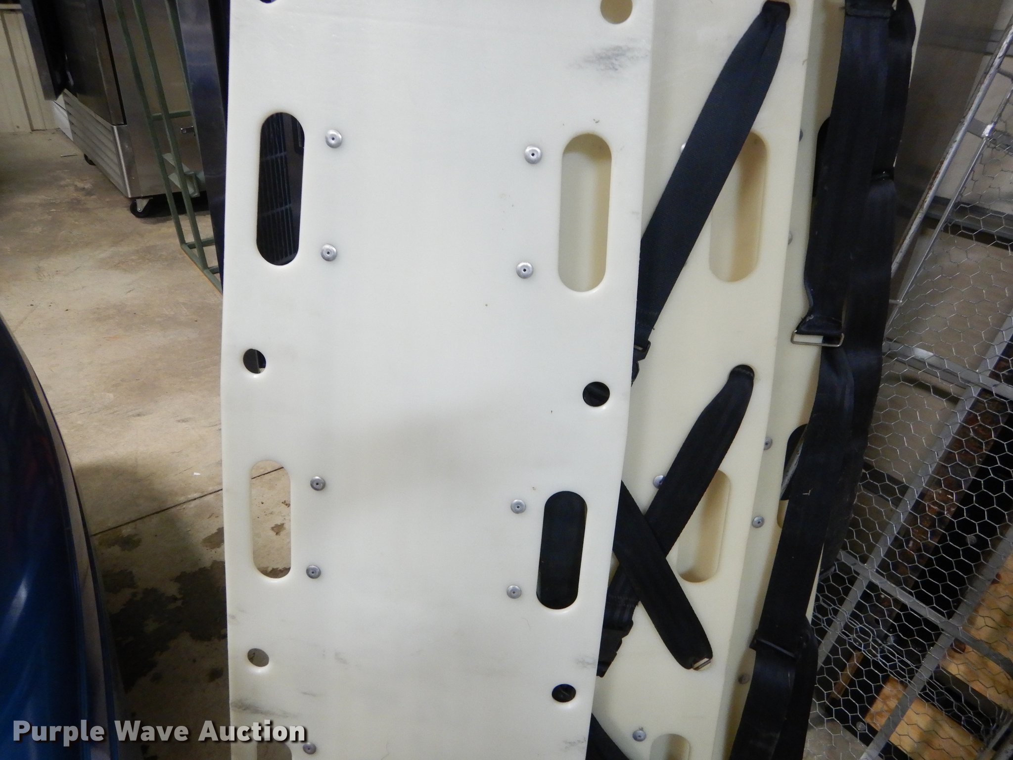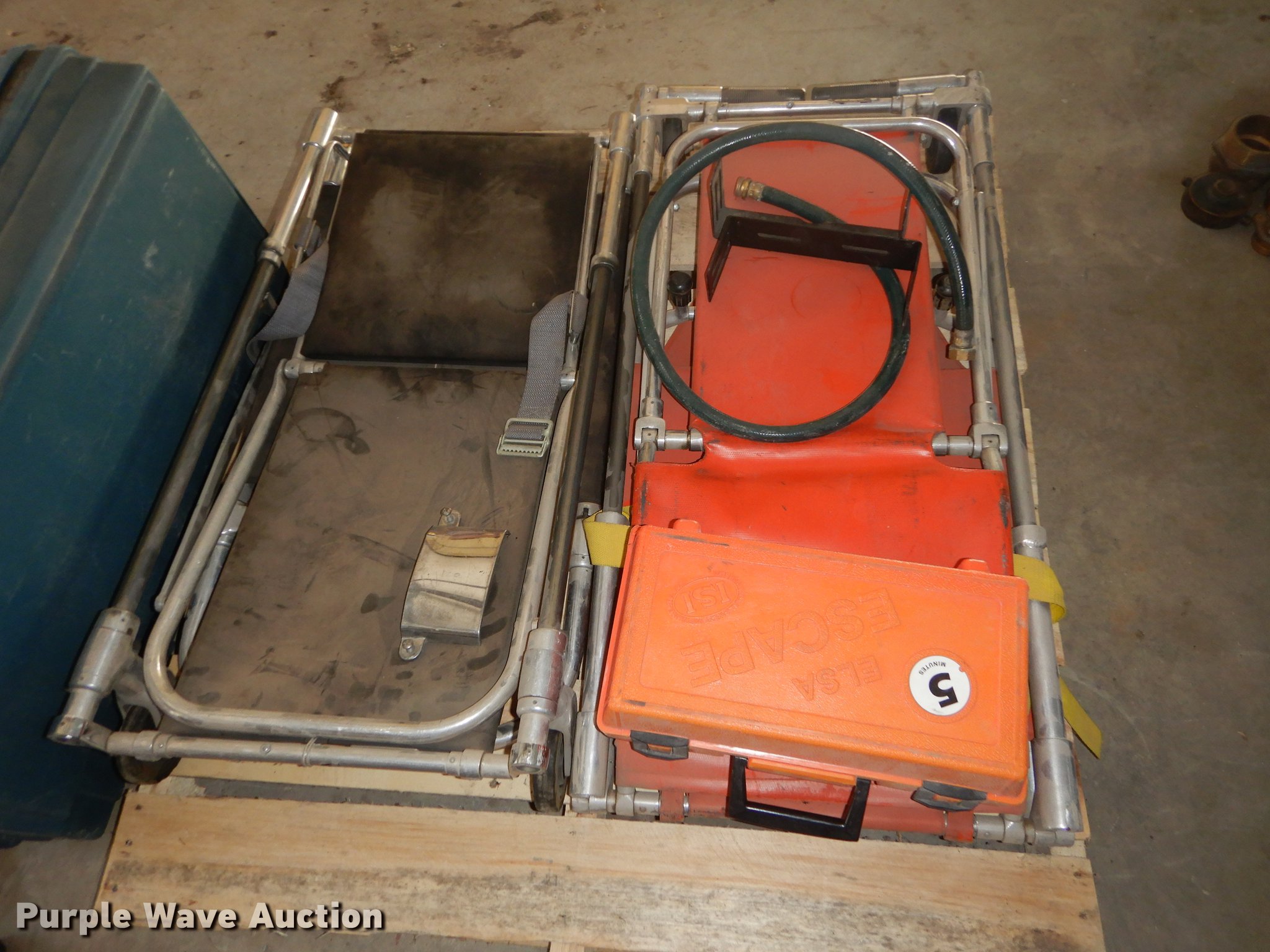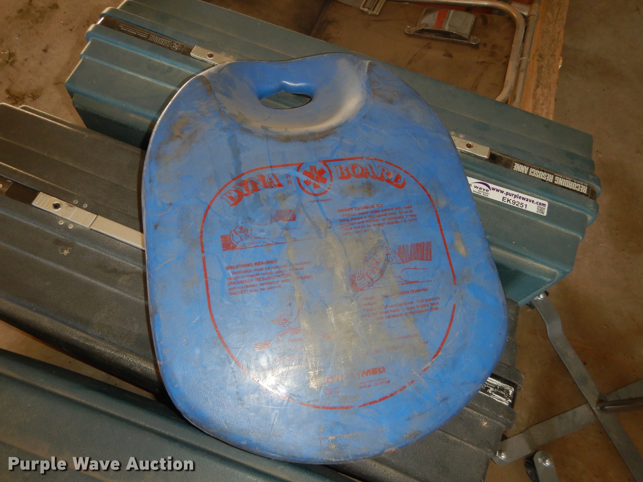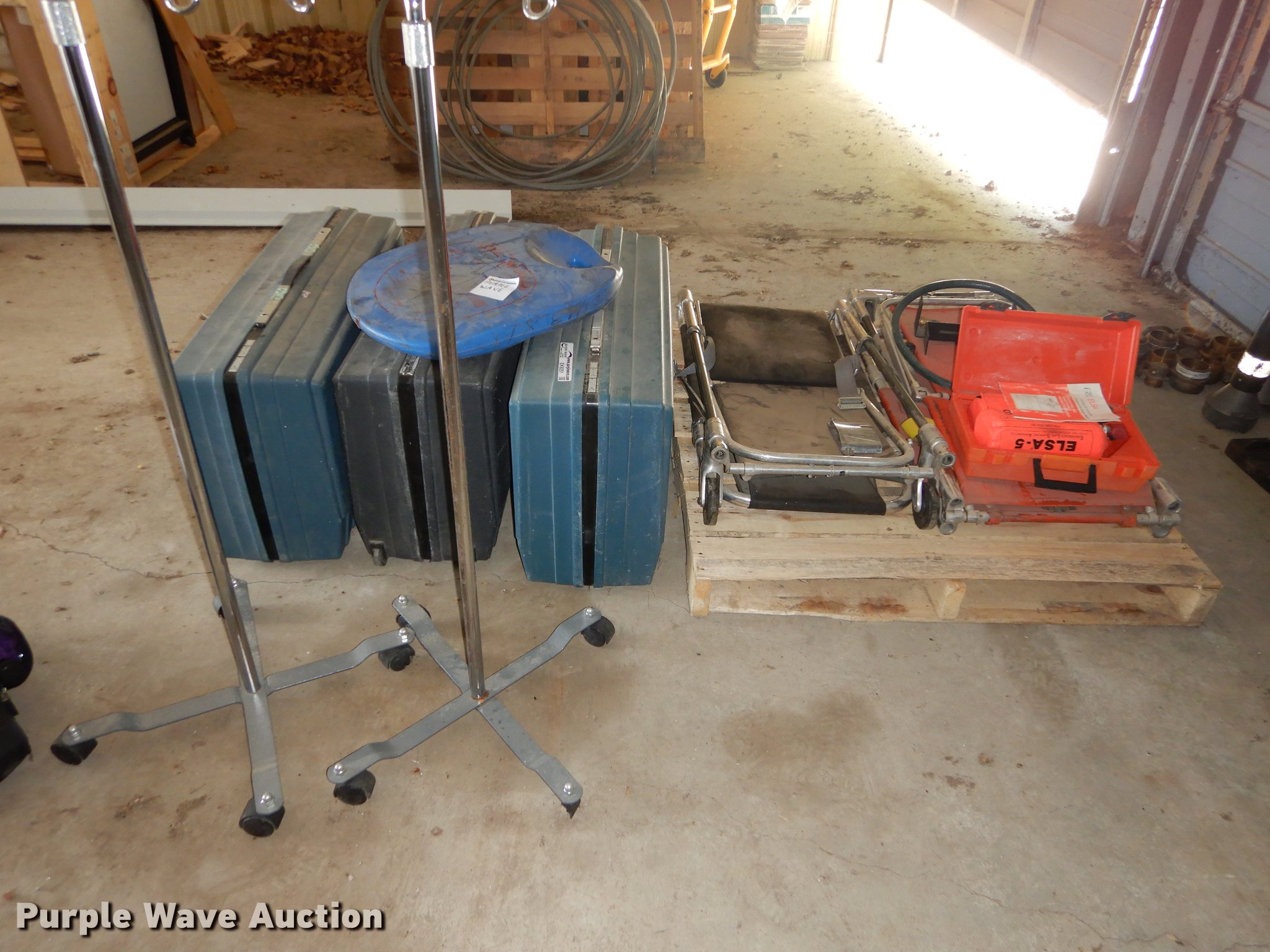 Purple Wave is selling a used Medical Equip. in Kansas. This item is a Medical equipment with the following: (2) fold up soft cots, CPR short board, Elsa escape apparatus, (3) CPR dummies, (4) spine boards, (2) IV stands