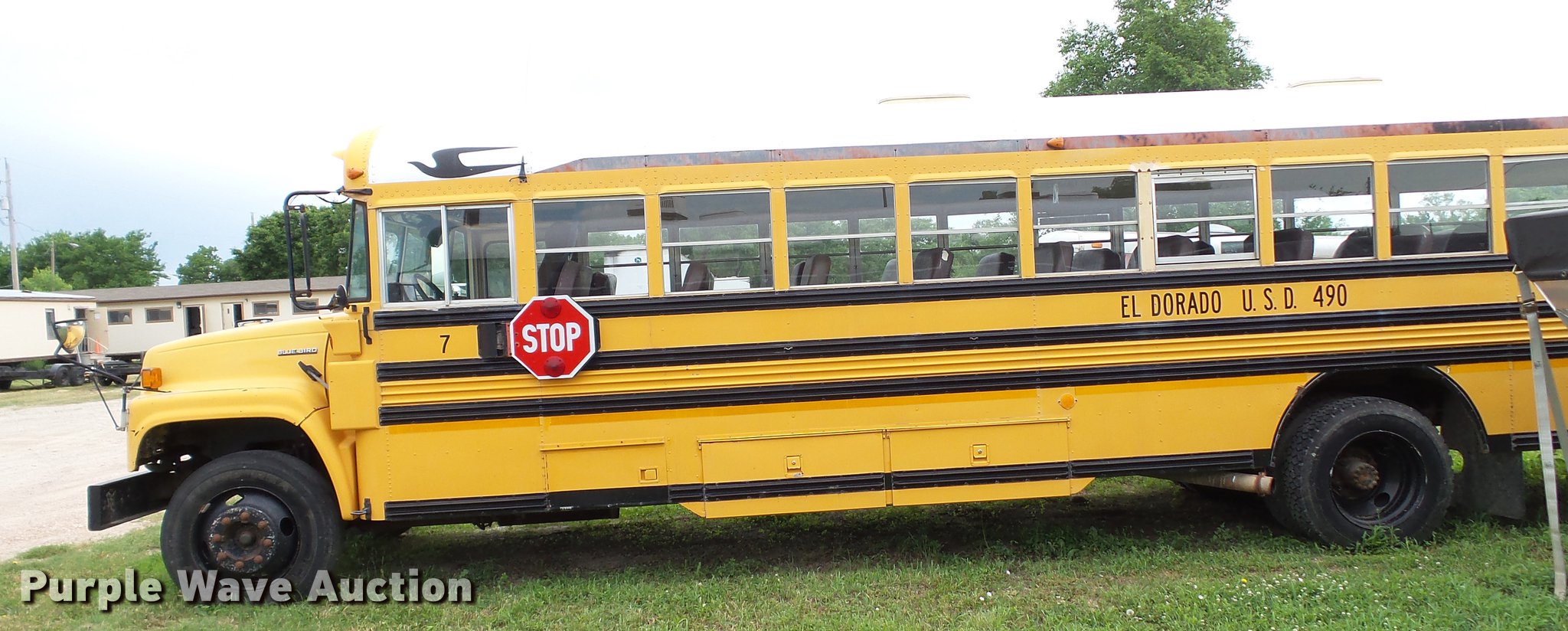 Purple Wave is selling a used Bus in Kansas. This item is a 1993 Chevrolet school bus with the following: 152,764 miles on odometer, 6.0L V8 gas engine, Automatic transmission, Single axle, Heat, Vinyl interior, 65 passenger capacity, Roof, side, and rear egress, Spring suspension, Hydraulic brakes, 265/75R22.5 tires, Weak battery, Radio and video system not included
