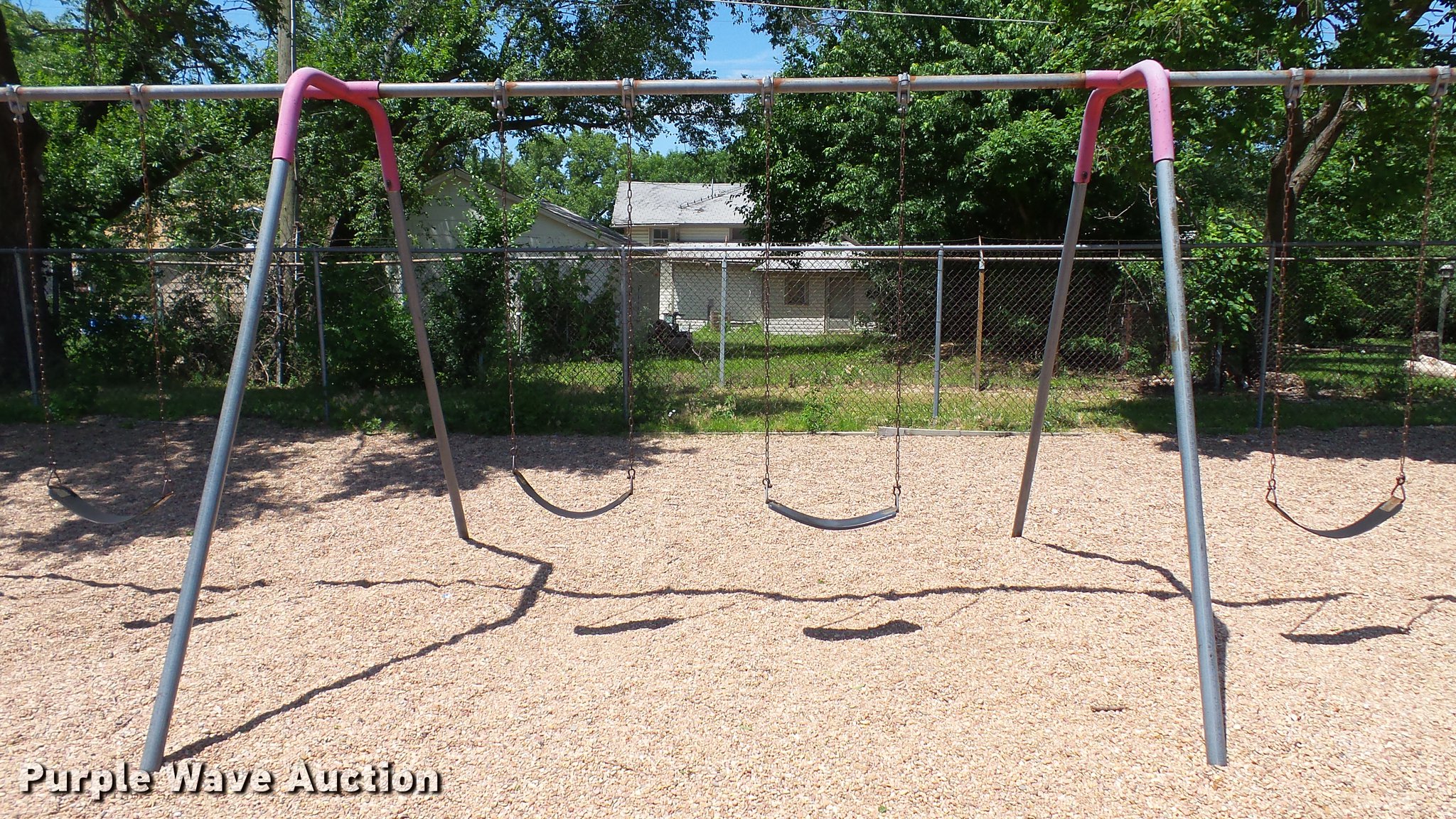 Purple Wave is selling a used Sporting Goods in Kansas. This item is a Metal swing set with the following: Approx. 65' x 10' x 8'H, (8) chain swings, Set in concrete footing