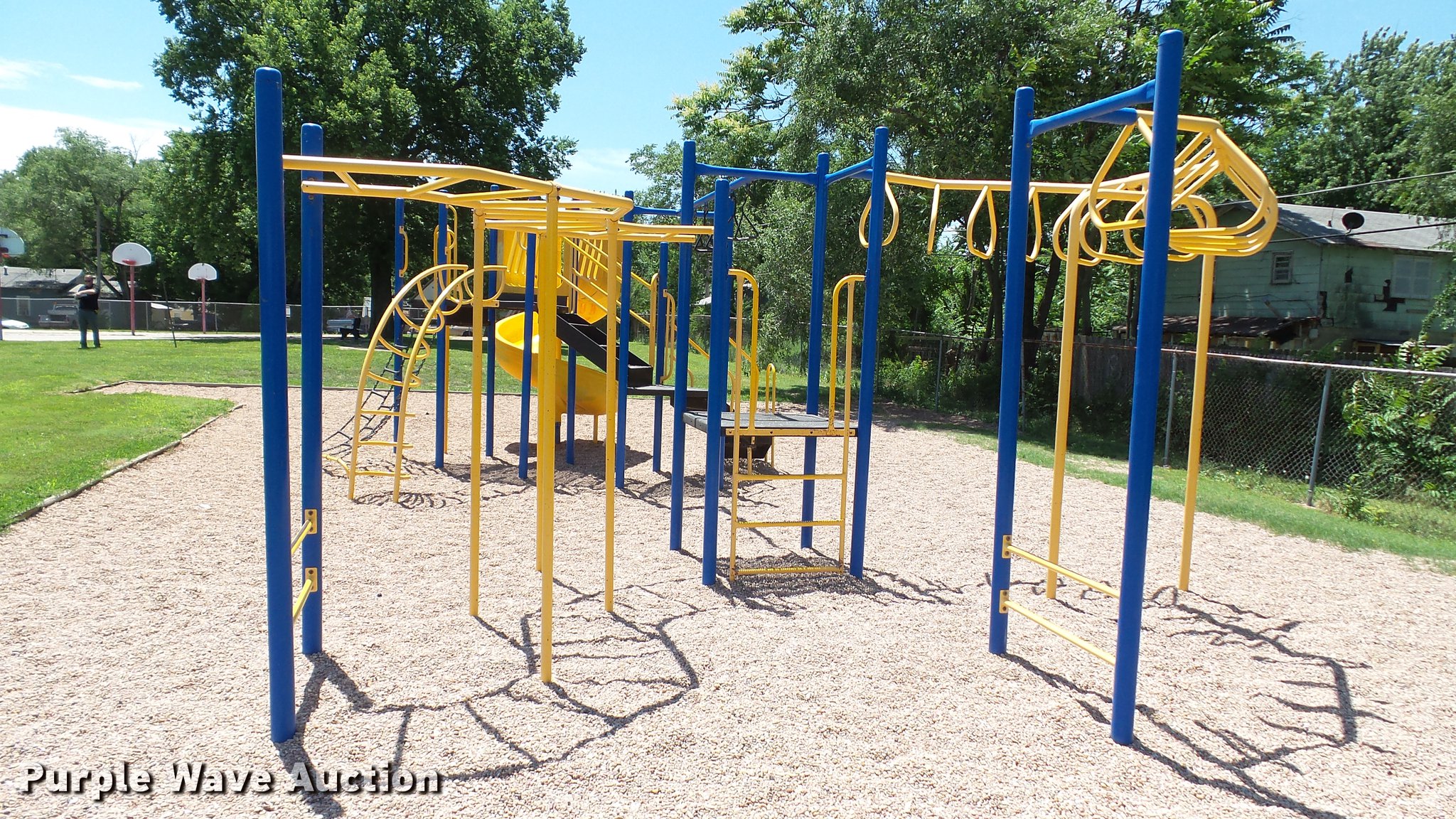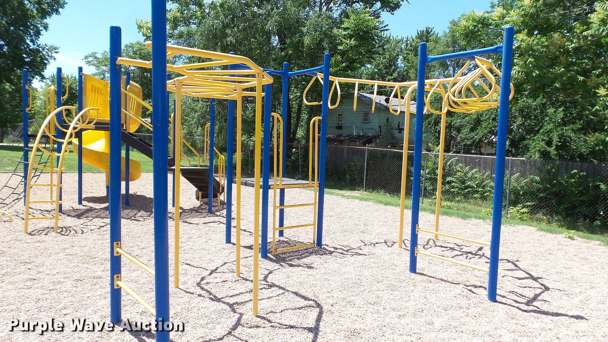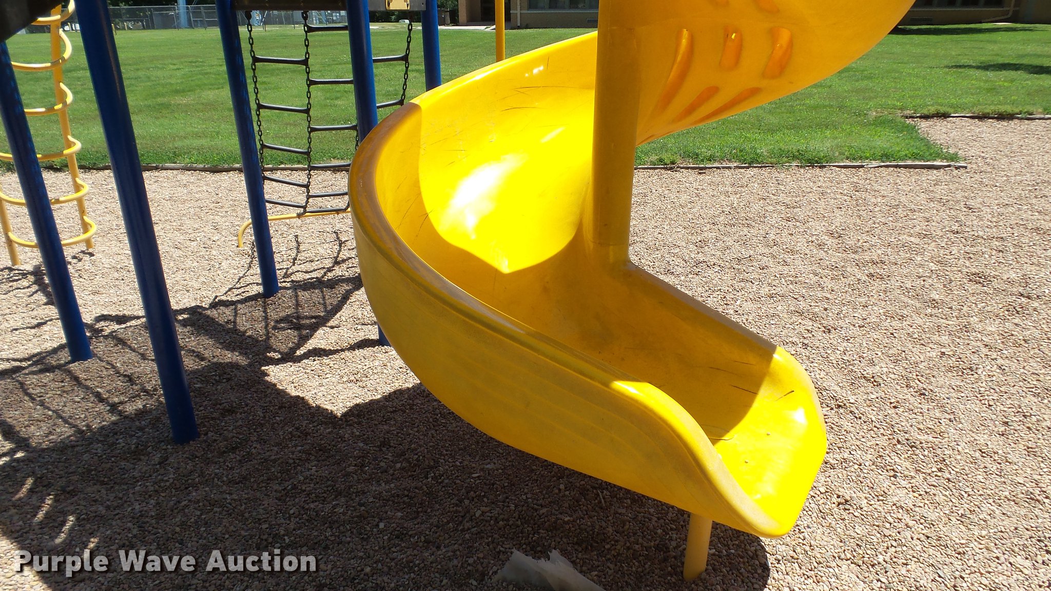Purple Wave is selling a used Sporting Goods in Kansas. This item is a Playground equipment with the following: Metal and plastic construction, Unit set in concrete footing