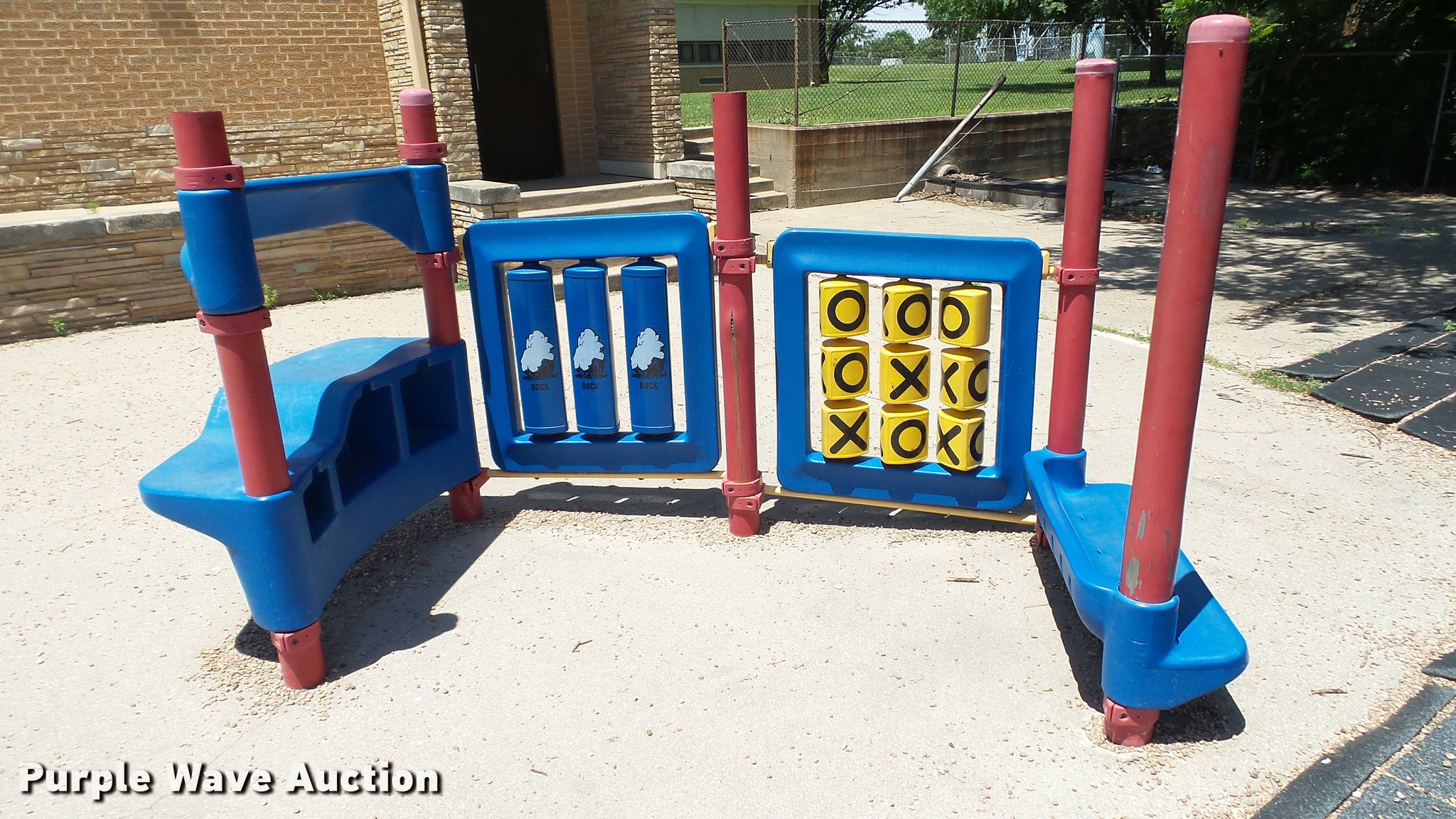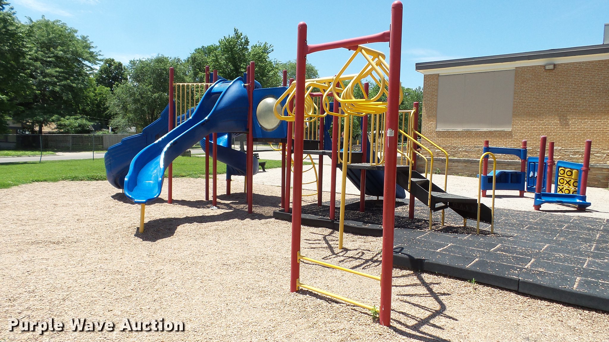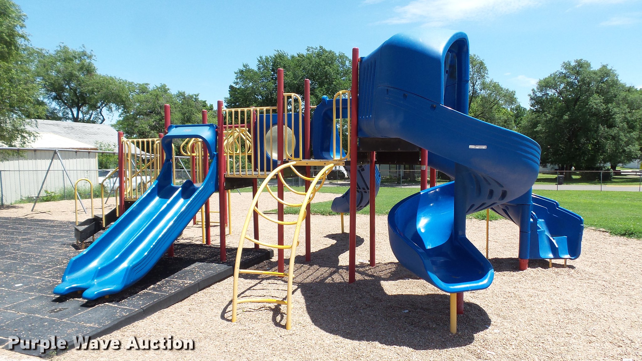 Purple Wave is selling a used Sporting Goods in Kansas. This item is a Playground equipment with the following: Metal and plastic construction, Unit set in concrete footing