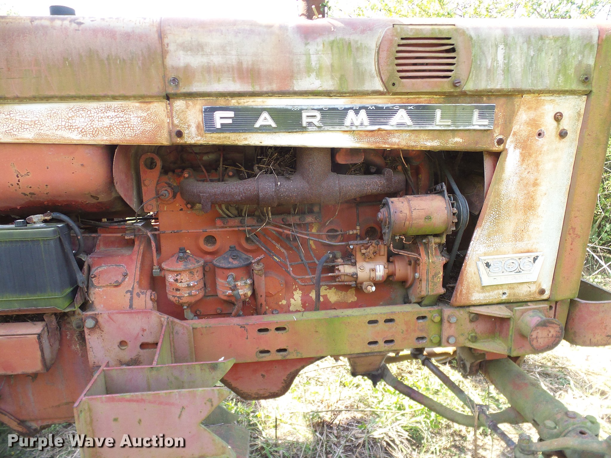 Purple Wave is selling a used Tractor in Oklahoma. This item is a 1967 International Farmall 806 tractor with the following: 4,379 hours on meter, 5.9L six cylinder diesel engine, Manual transmission, 8F-4R gears, OROPS canopy, Suspension seat, Loader mounts, Three point, 540/1000 PTO, Rear hydraulic remote set, (2) rear wheel weights, 7.50-16 front tires, 18.4-34 rear tires, Front tires flat, Right rear tire flat, Non-operational unit, Serial 30697