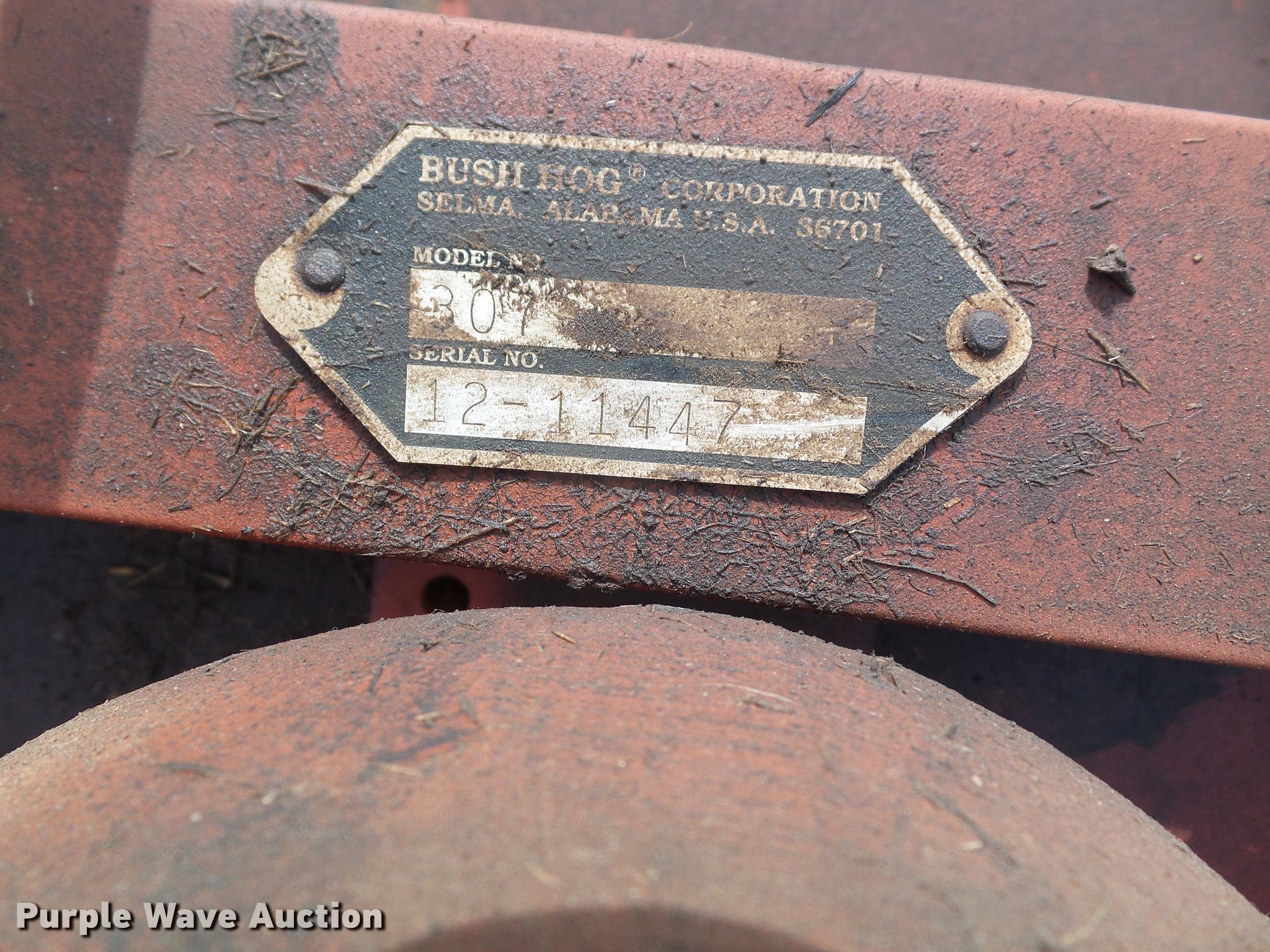 Purple Wave is selling a used Mower, Cutter, Shredder in Oklahoma. This item is a Bush Hog 307 rotary mower with the following: 87"W, 540 PTO, Pin hitch, Solid rubber wheels, Hydraulic cylinder missing, Gearbox leaks oil, Serial 1211447