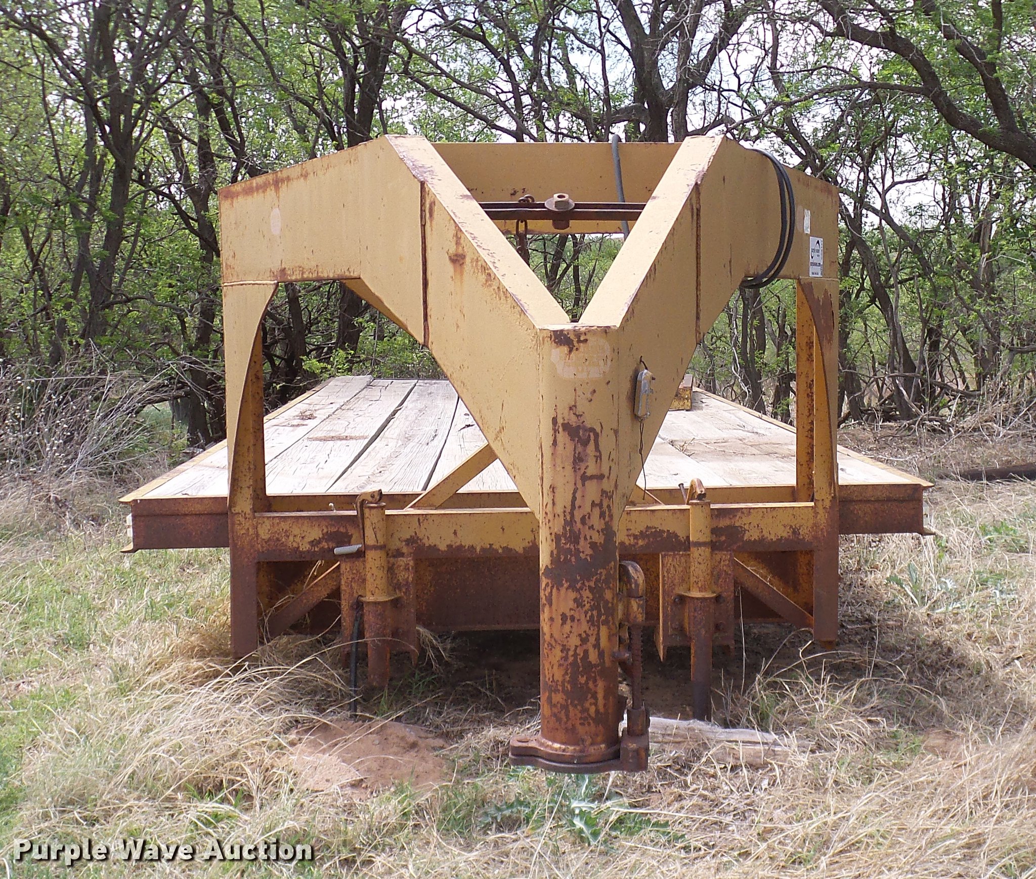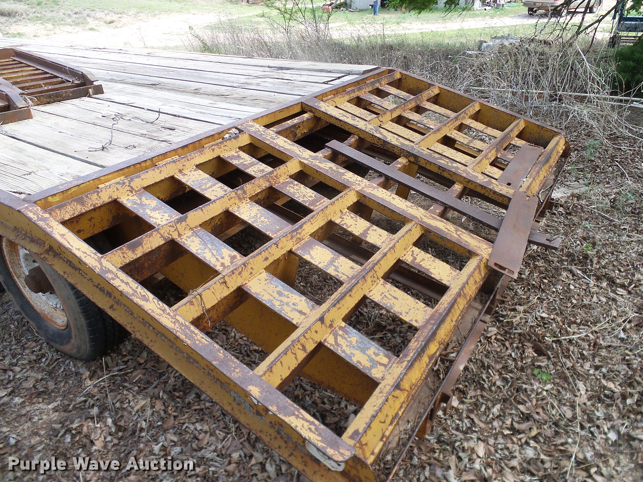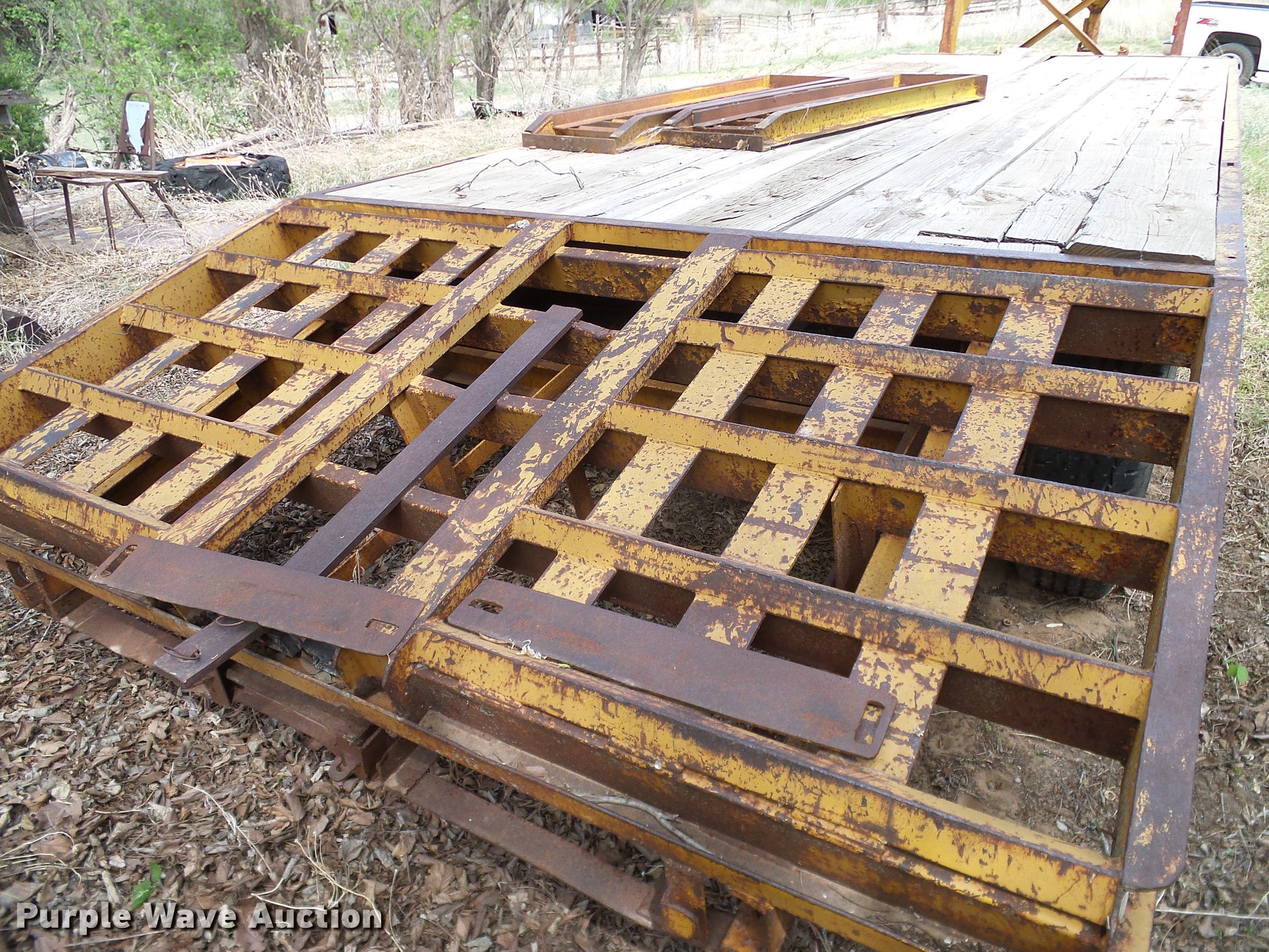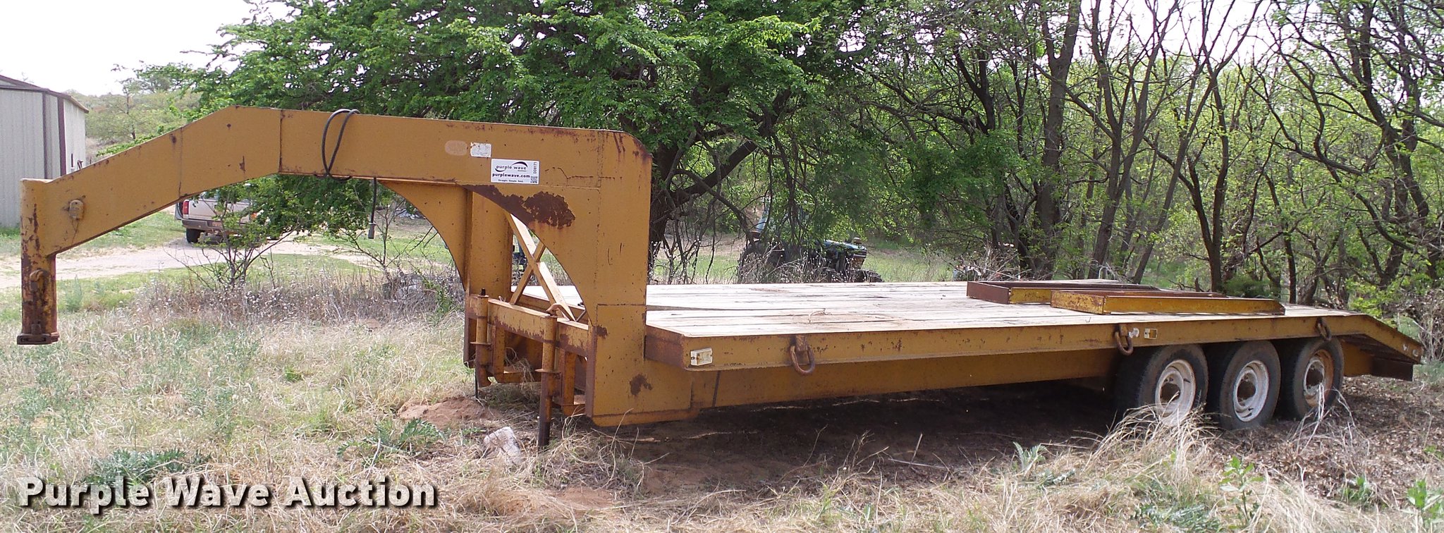 Purple Wave is selling a used Equip. Trailer in Oklahoma. This item is a Belshe equipment trailer with the following: 32'L x 95"W, 20'L wood deck, 4'L dovetail, 6'L ramps, 30" floor height, D-ring tie downs, Gooseneck hitch, Dual leg landing gear, Spring suspension, Electric brakes, Triple axle, Steel wheels, 235/80R16 tires, Some bearings may need to be replaced, Possible axle issues