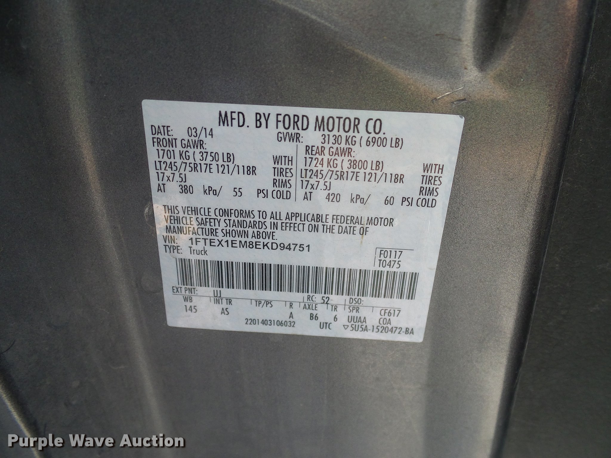 Purple Wave is selling a used 1/2 Ton Pickup or Van in Oklahoma. This item is a 2014 Ford F150 SuperCab pickup truck with the following: 58,414 miles on odometer, 3.7L V6 DOHC 24V CNG engine, Automatic transmission, Four wheel drive, AC and heat, Tilt, Cruise, AM/FM, Power windows, locks, and mirrors, Vinyl interior, Spotlight, Front tow hooks, Ranch Hand grill guard, Receiver hitch, Trailer wiring, Firestone 245/75R17 tires, Collision damage, Possible frame issues