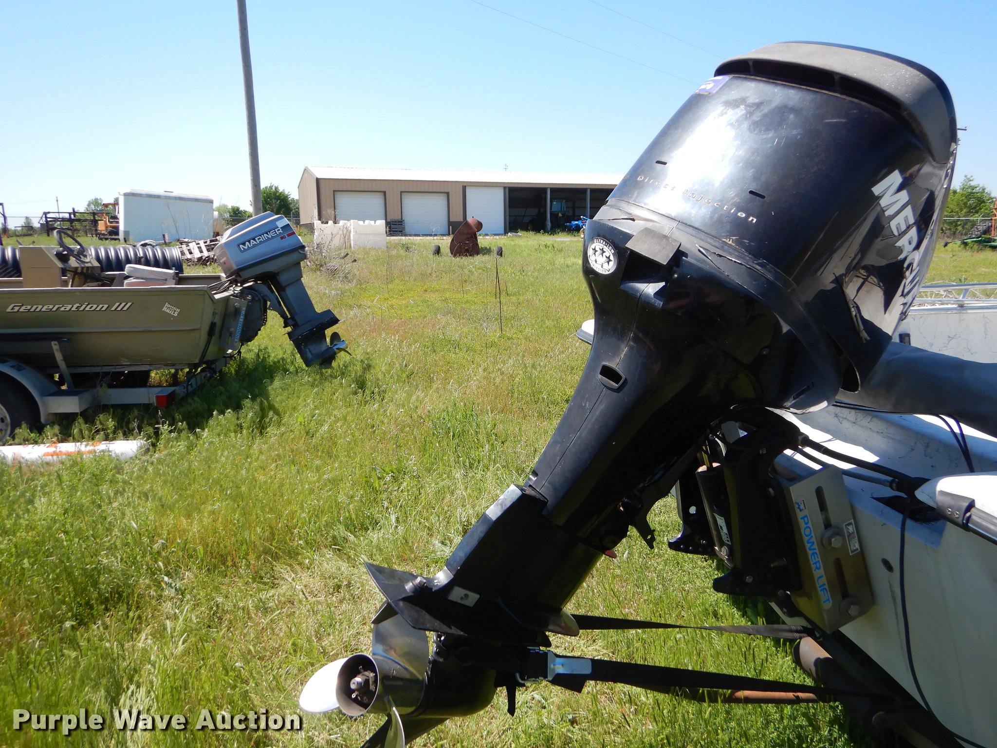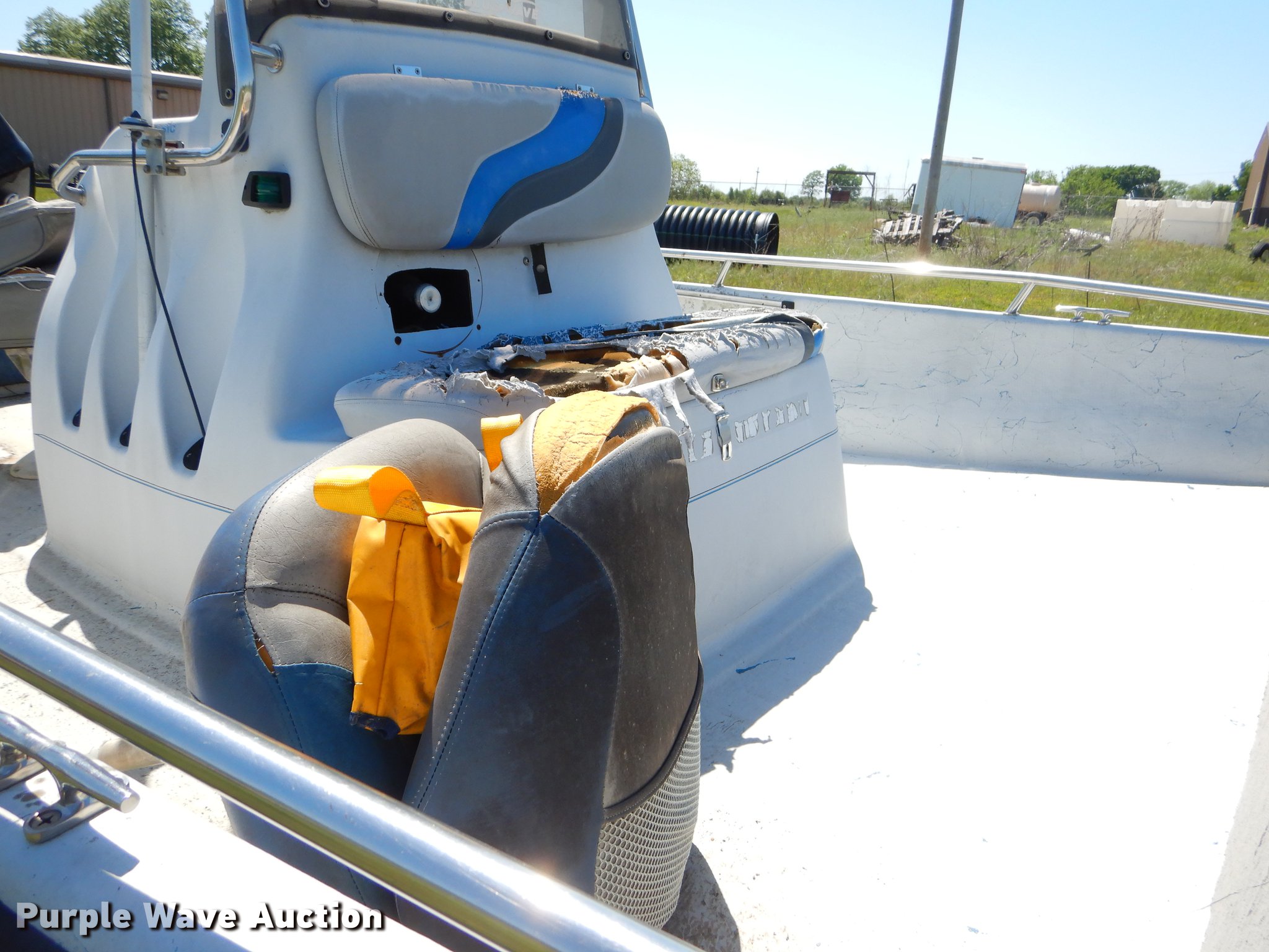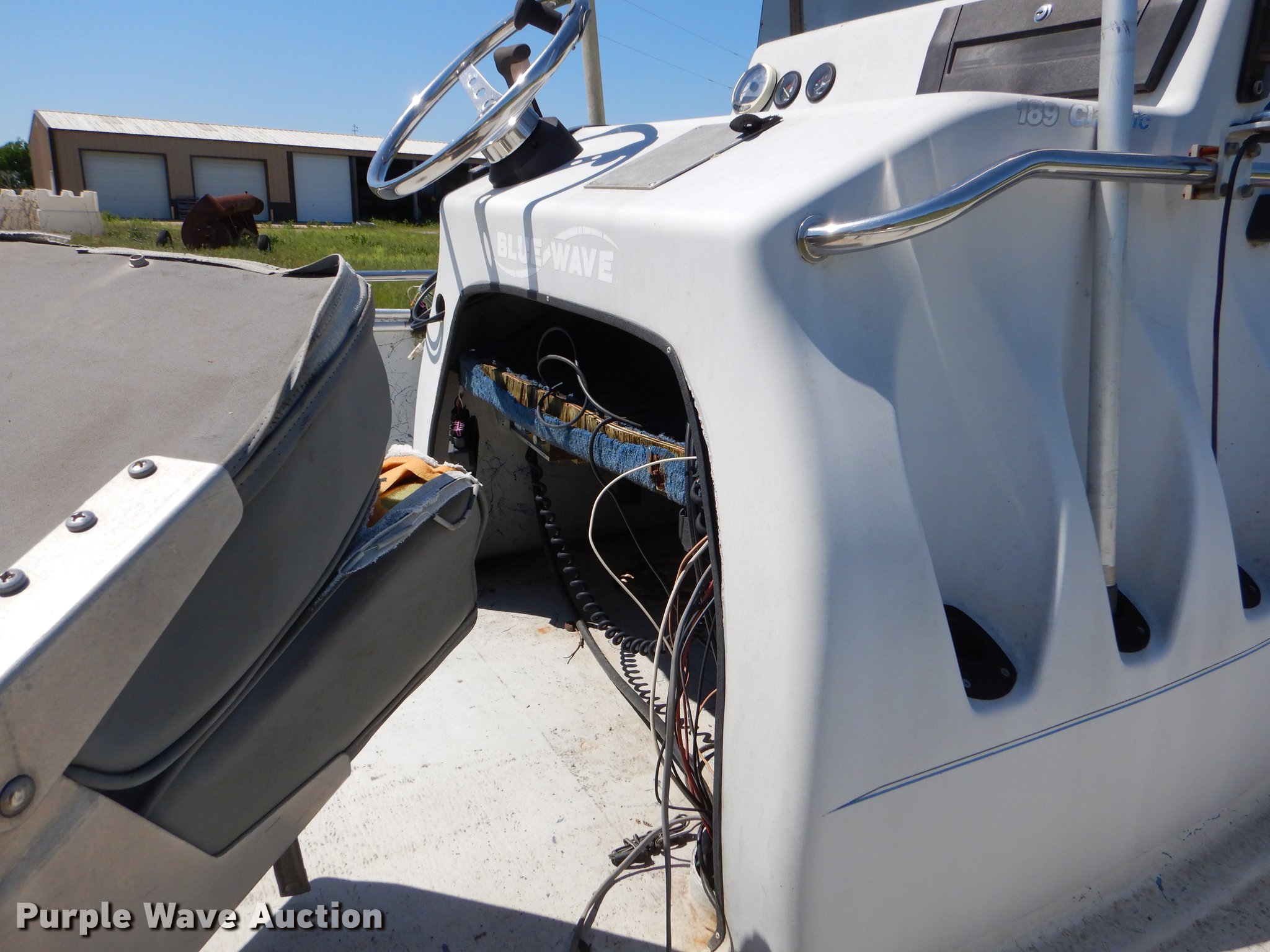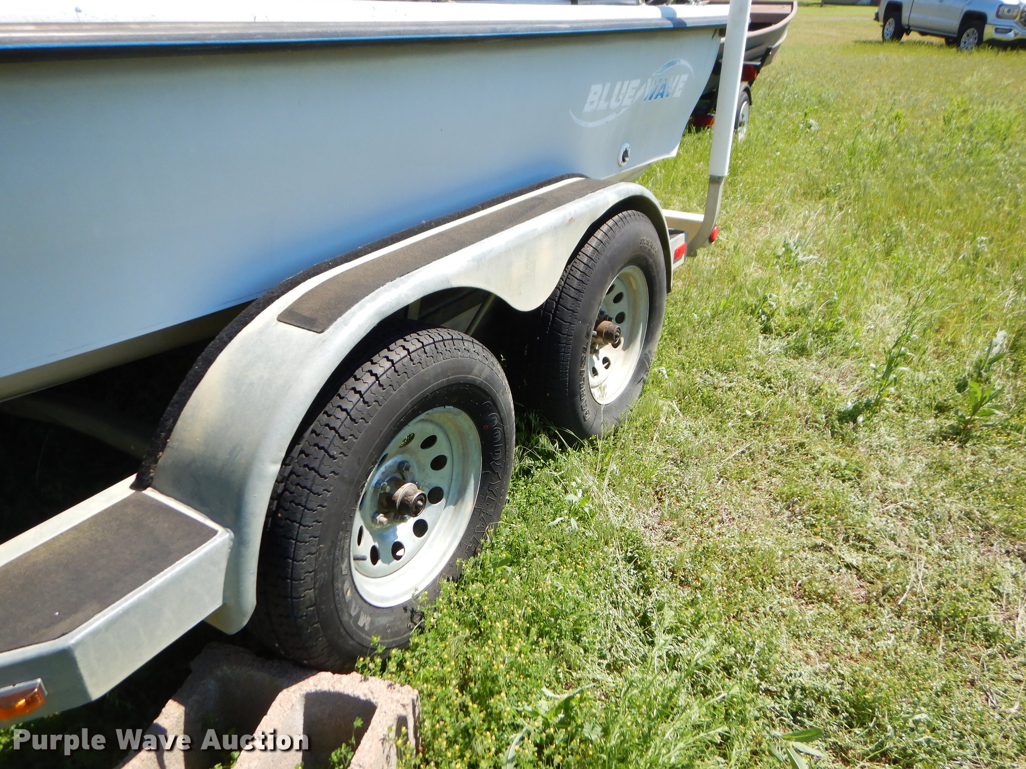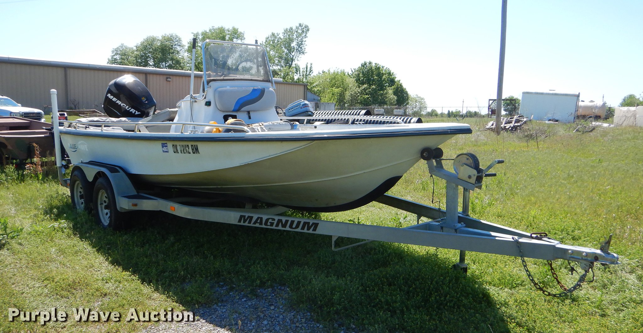 Purple Wave is selling a used Boat in Oklahoma. This item is a 1997 Blue Wave Bowrider boat with the following: 19'L, Mercury 115 HP gas engine, Center console, Unknown operating condition, Hull ID PWV01932J697, 2009 Magnum trailer, 21'L, 2" ball hitch, Jack stand, Spring suspension, Electric brakes, Tandem axle, 215/75R14 tires