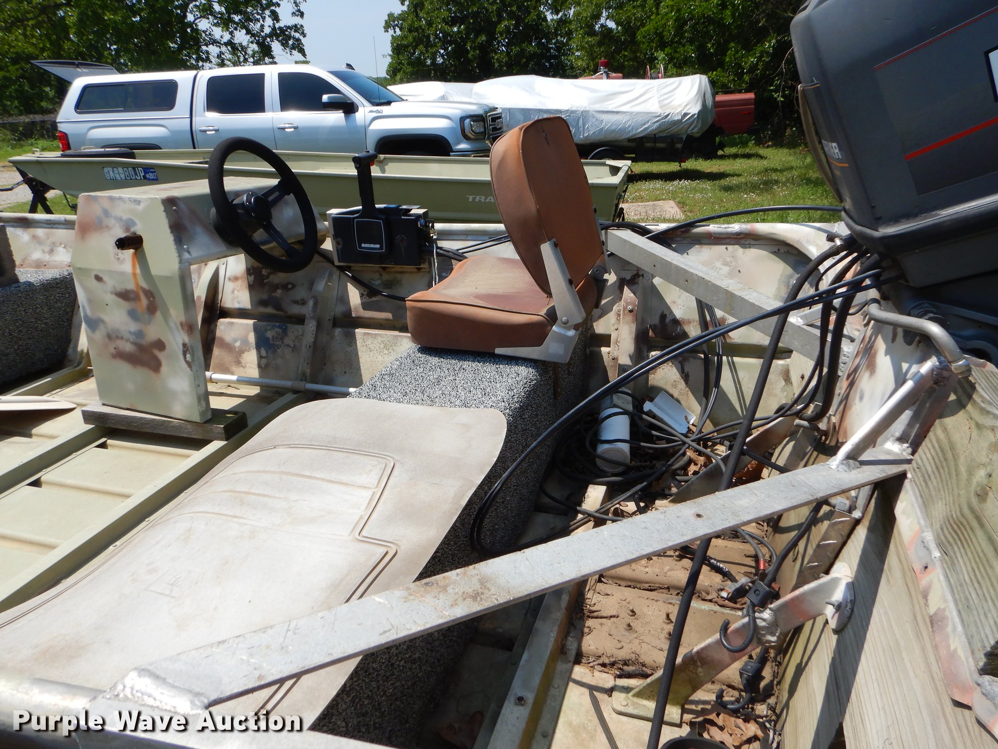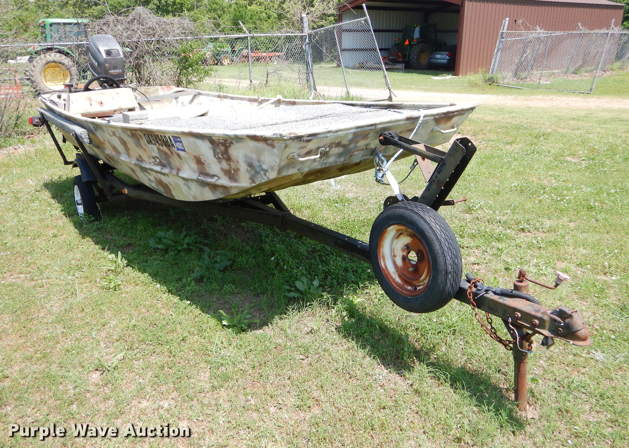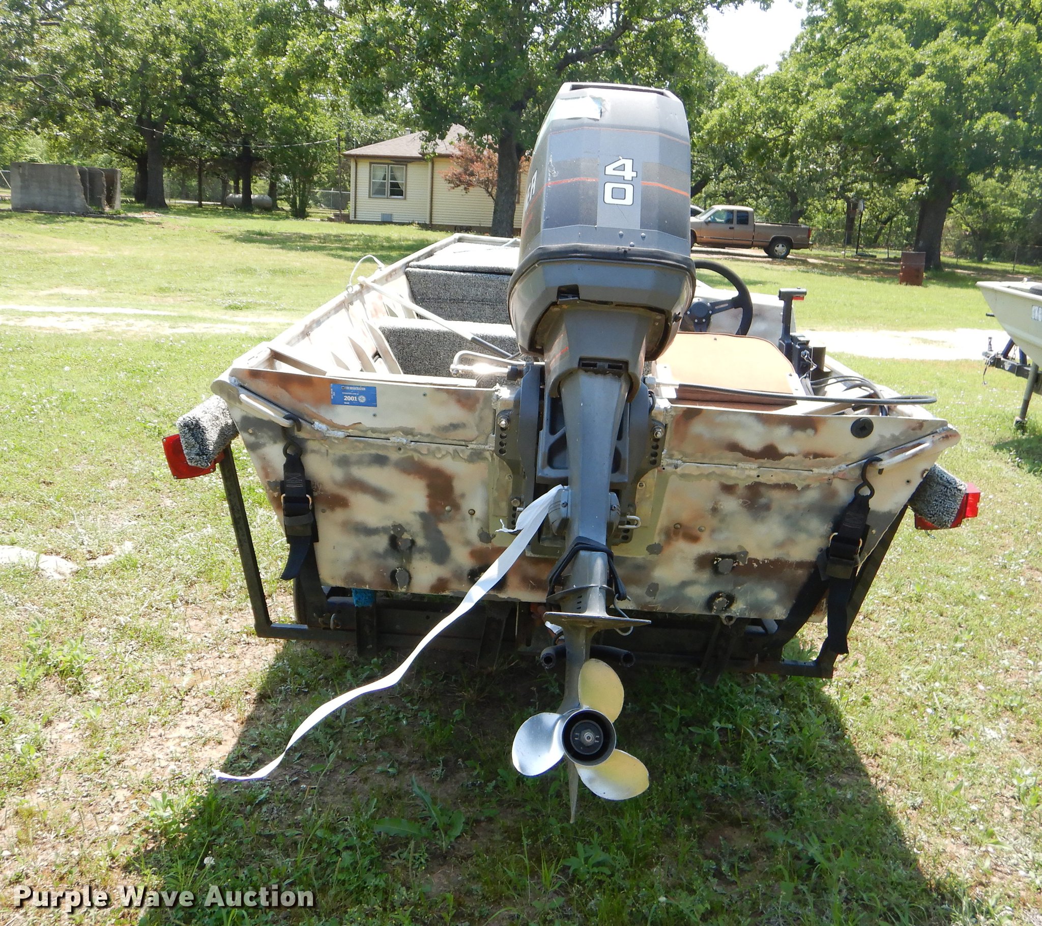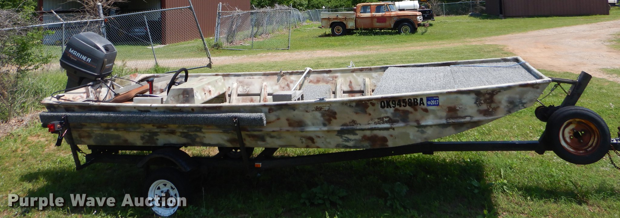 Purple Wave is selling a used Boat in Oklahoma. This item is a 1982 Loweline aluminum flat bottom boat with the following: 16'L x 69"W, 1991 Mercury 40 HP gas engine, Serial 0D012407, Non-operational, Single operator station, 19'L trailer, Approx. 2" ball hitch, Jack stand, Biat manual winch, Spring suspension, Electric brakes, Single axle, 4.80-12 tires