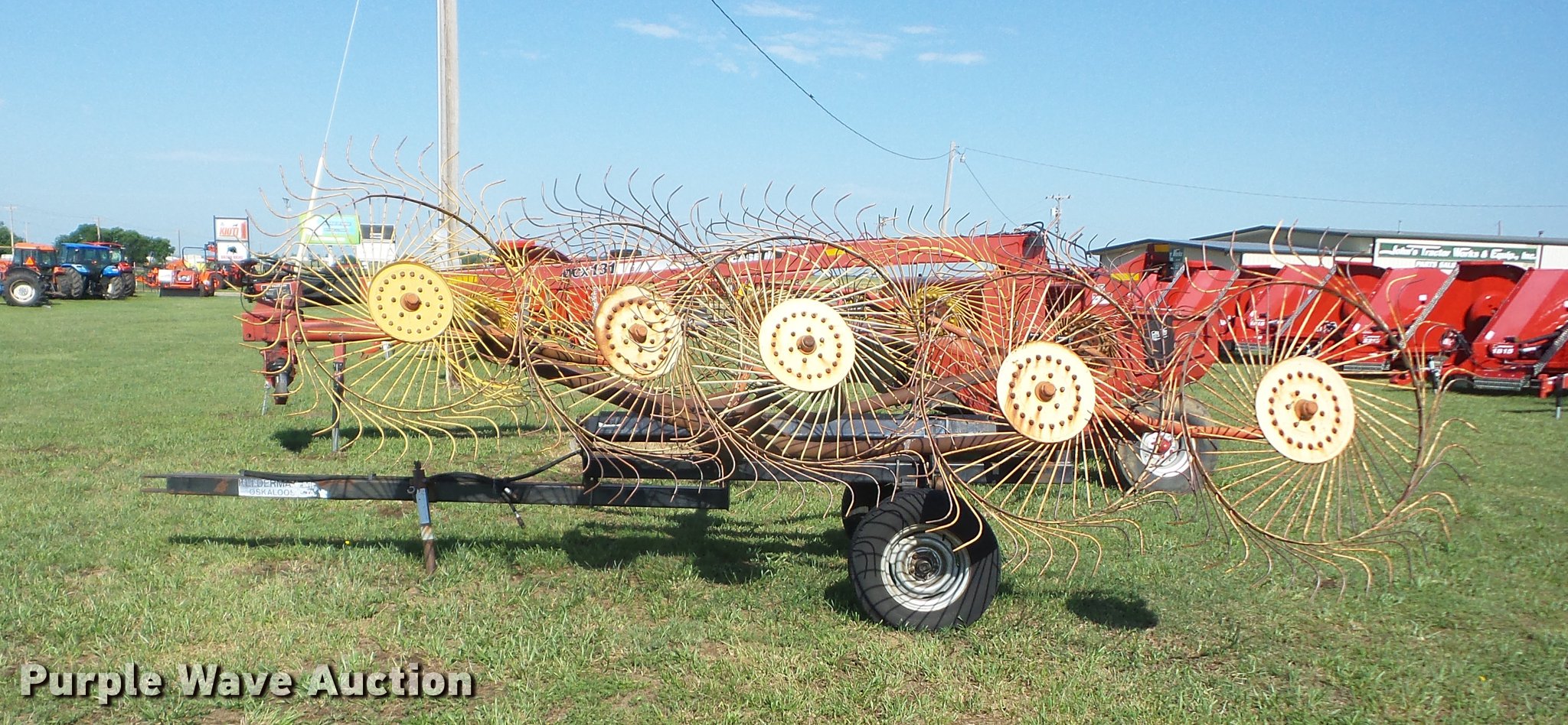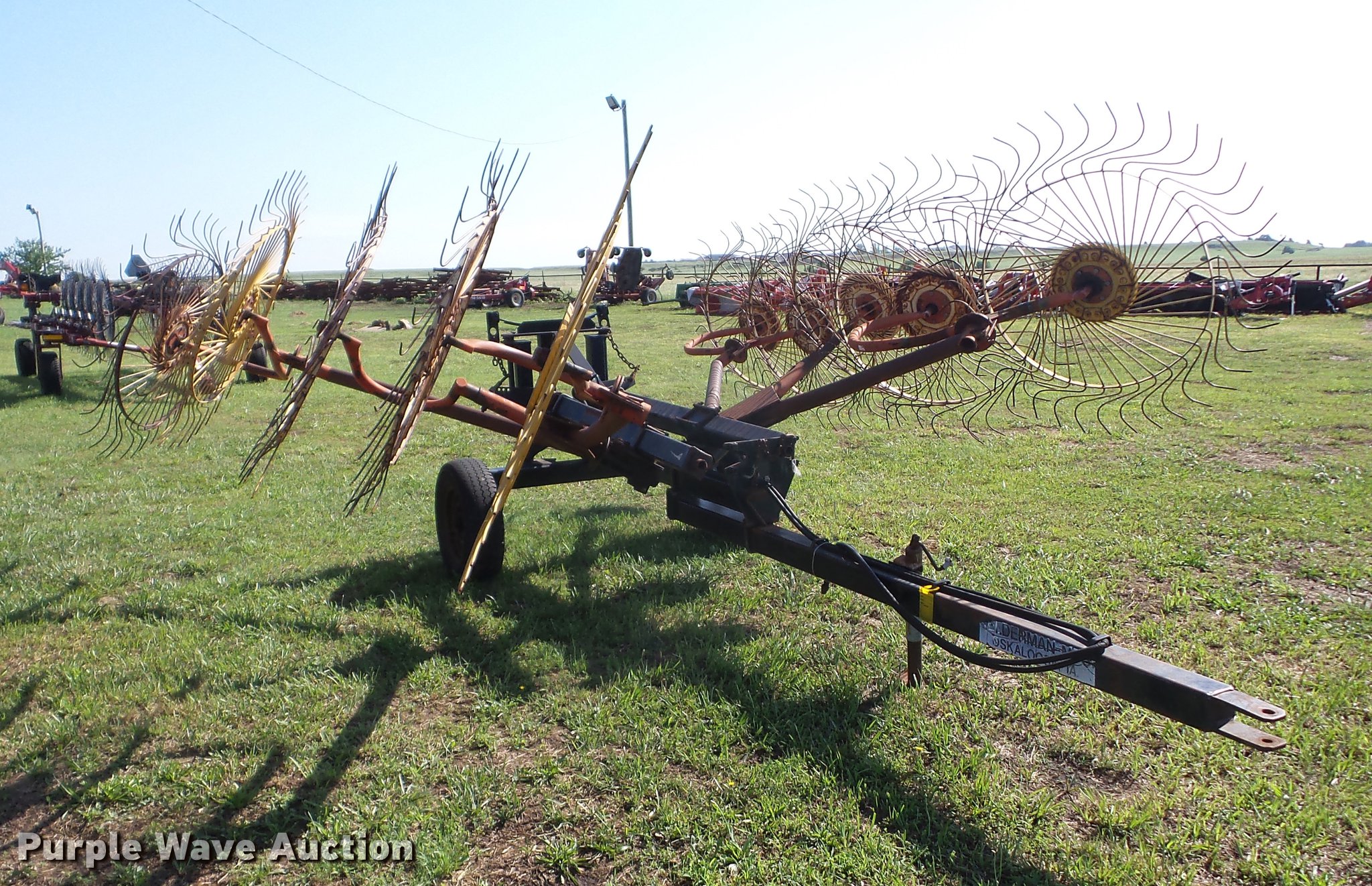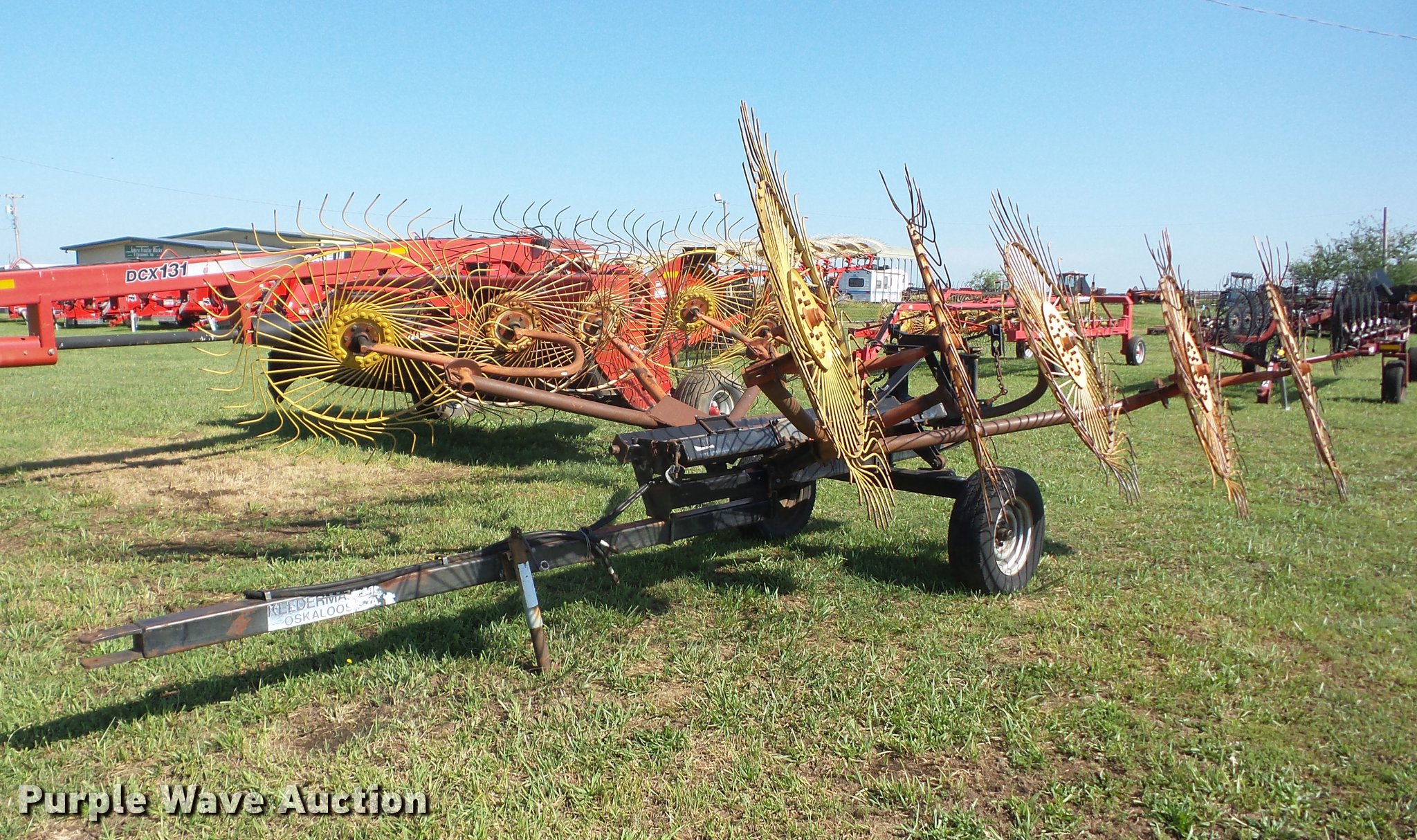 Purple Wave is selling a used Hay Rake in Oklahoma. This item is a Kelderman KRC III D 3393 hay rake with the following: (10) 5' diameter wheels, Hydraulic fold, Pin hitch