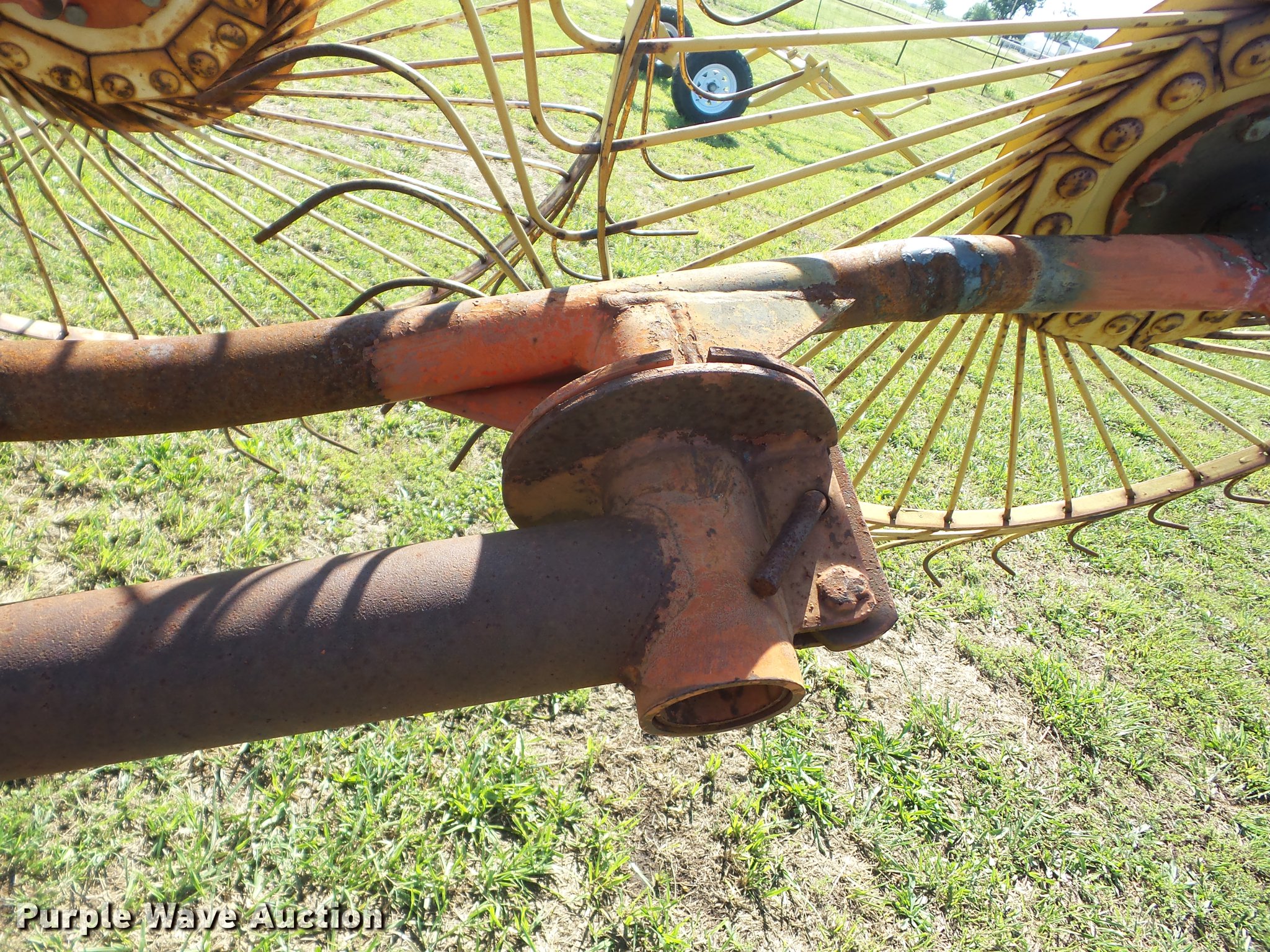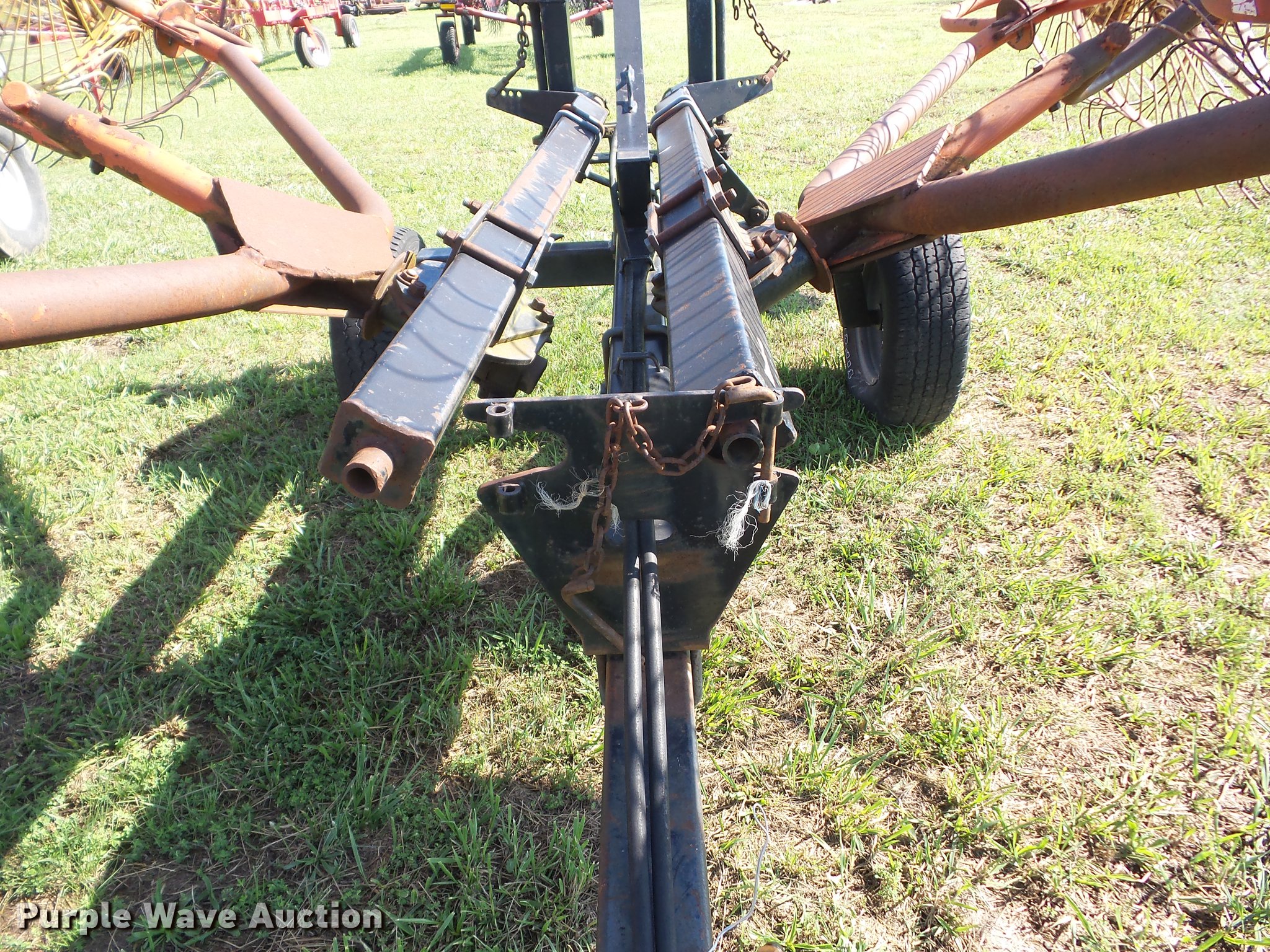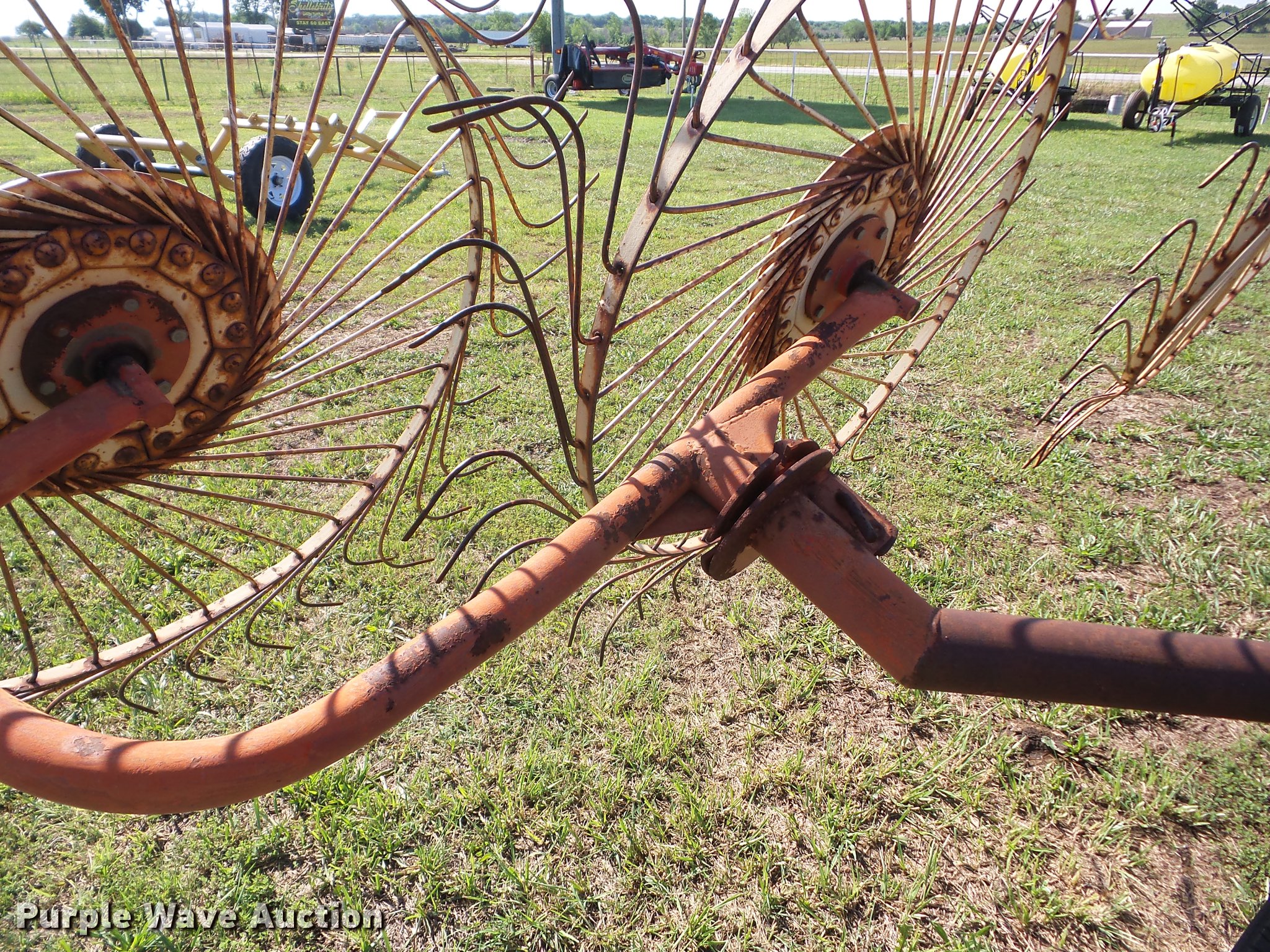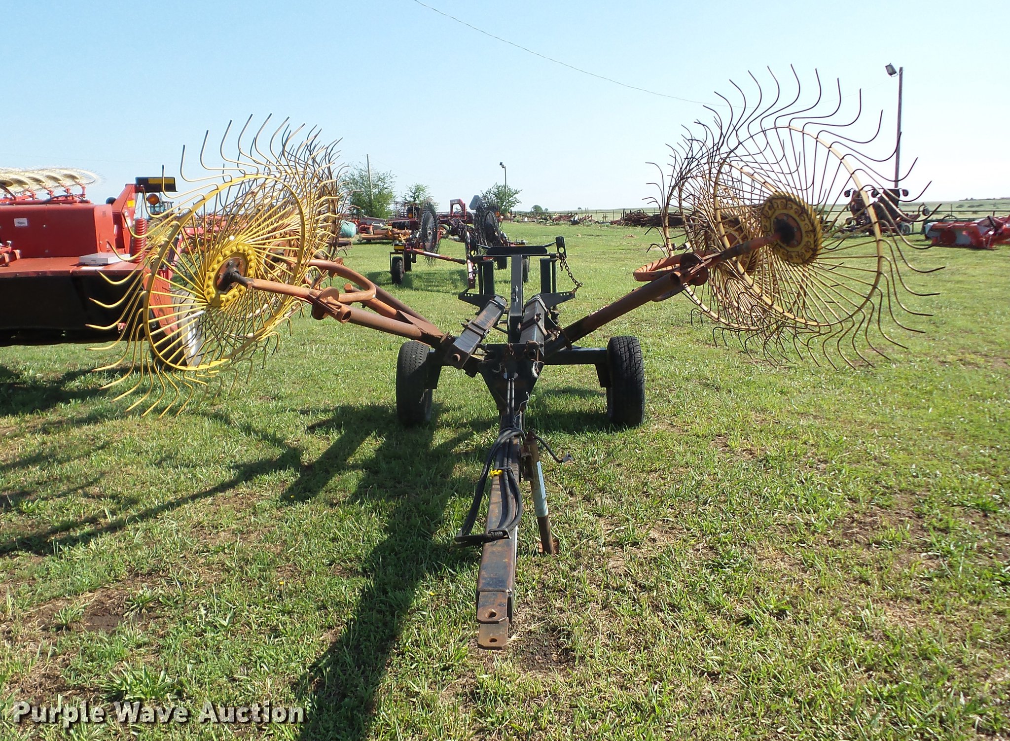 Purple Wave is selling a used Hay Rake in Oklahoma. This item is a Kelderman KRC III D 3393 hay rake with the following: (10) 5' diameter wheels, Hydraulic fold, Pin hitch