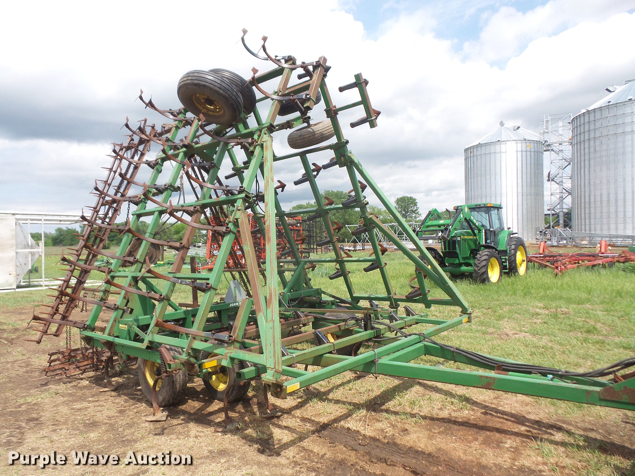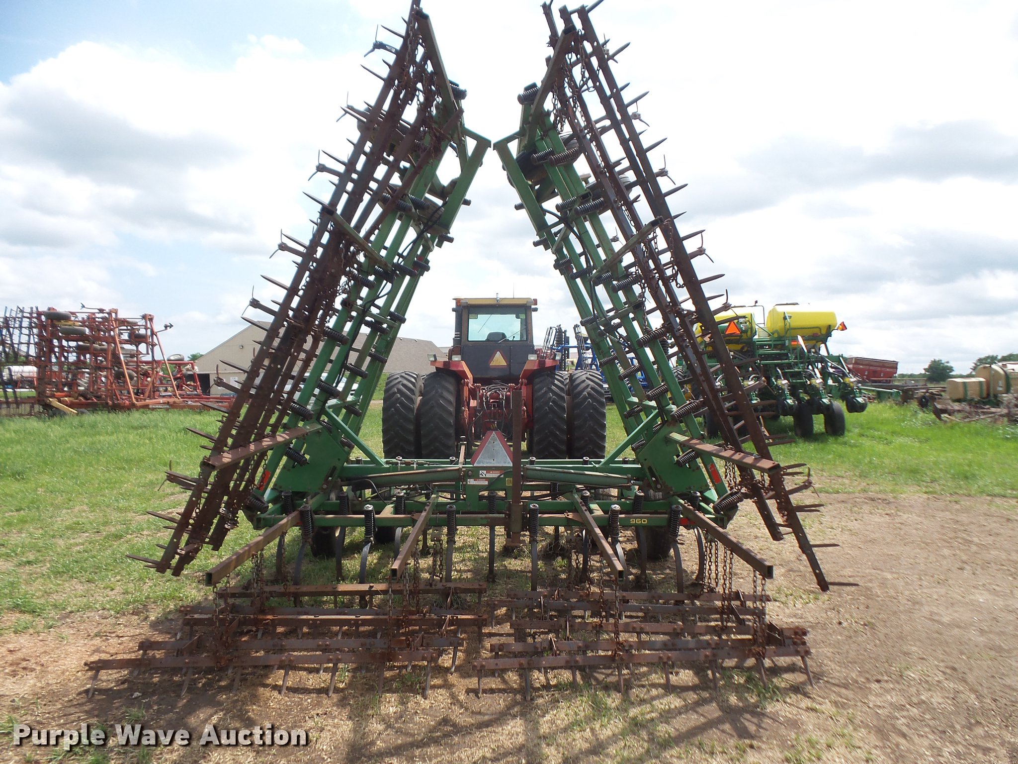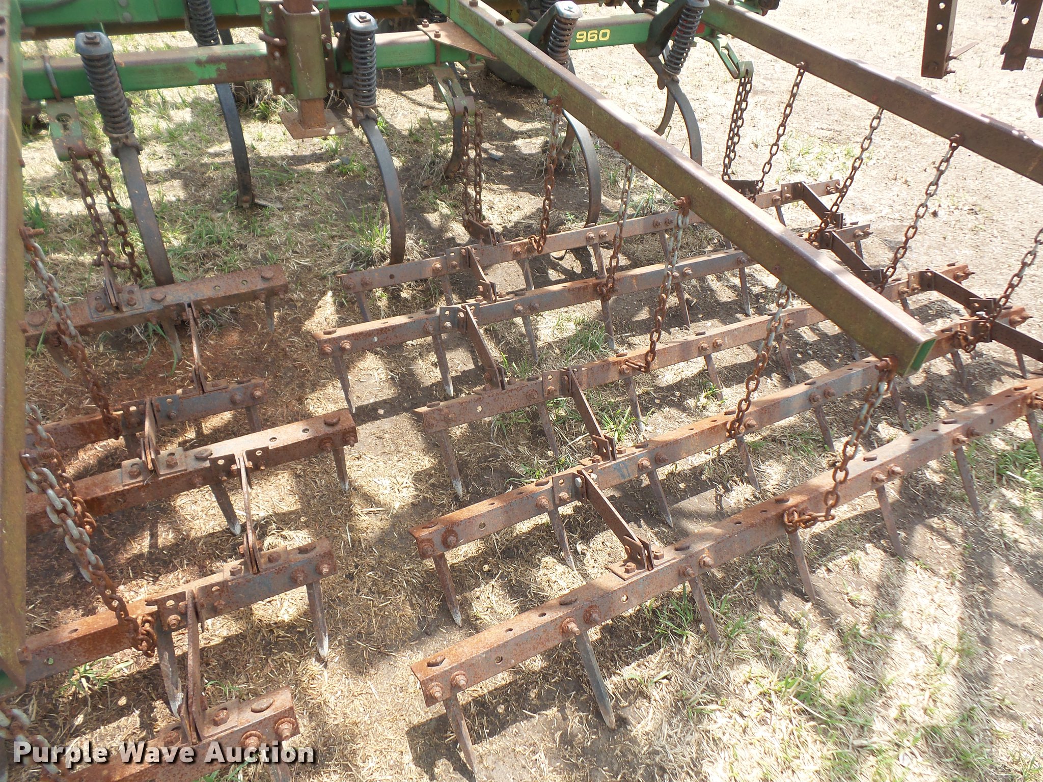 Purple Wave is selling a used Field Cultivator or Sweep Plow in Kansas. This item is a John Deere 960 field cultivator with the following: 36'W, 9" sweep width, Five bar spike tooth harrow, Hydraulic lift and fold, Slab hitch, 9.5L-15 tires, One harrow section is missing a bar, Serial N00960X011107