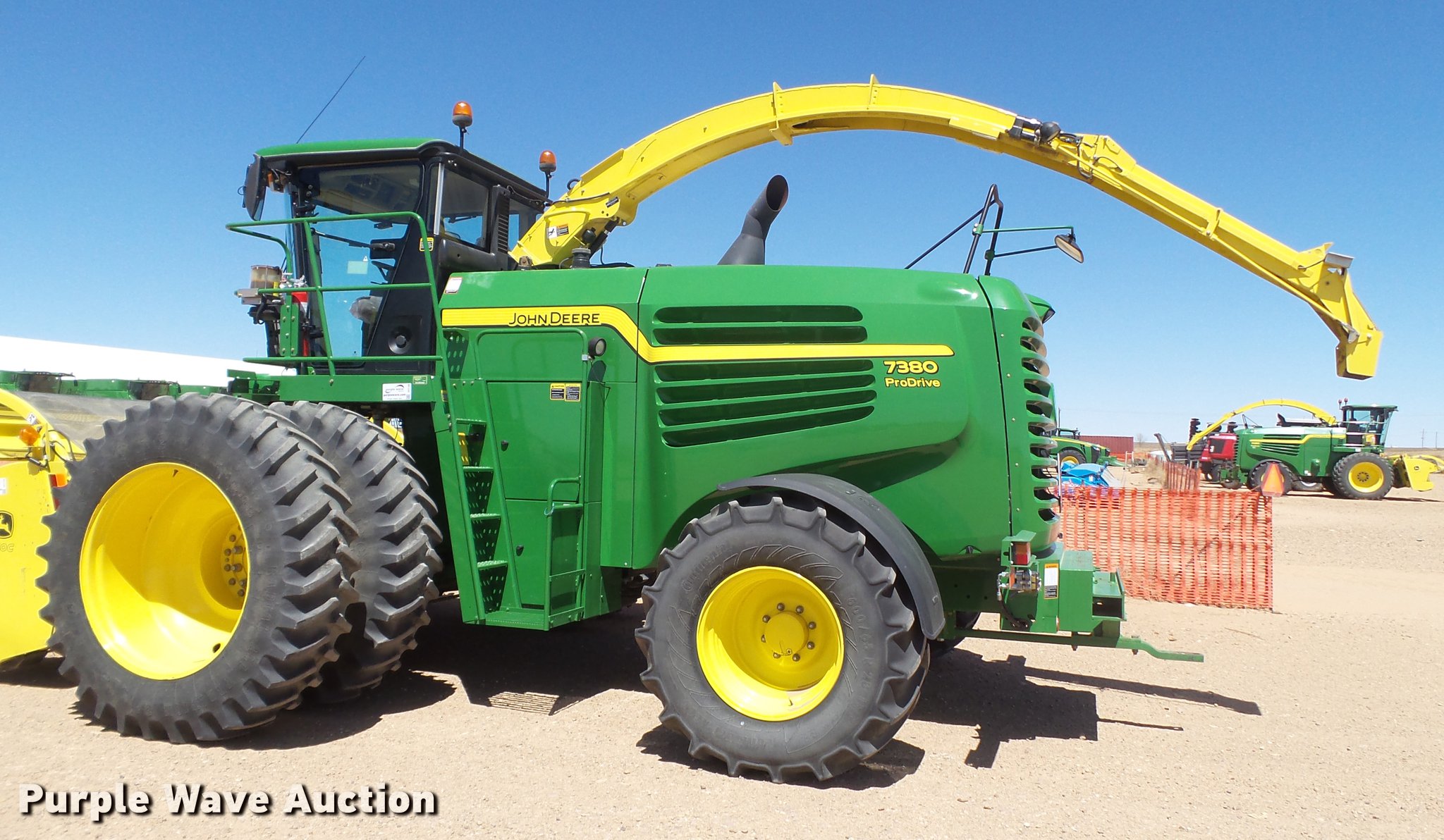 2015 John Deere 7380 forage harvester. 411 engine hours on meter, 242 cutter hours on meter, John Deere 6135H2011 13.5L six cylinder turbo diesel engine 485 HP, Serial RG6135R022205, ProDrive transmission, AC and heat, Tilt steering wheel, AM/FM, Air suspension seat, Instructor's seat, On-board air, GreenStar ready, Silage additive spray system, High arch spout Hydraulic adjust, Rear hitch, 480/80R42 dual front tires, 600/65R28 rear tires, Head not included, Serial 1Z07380YVEM514039. Larsen Farms. 12295 CR 11. Dalhart, TX 79022