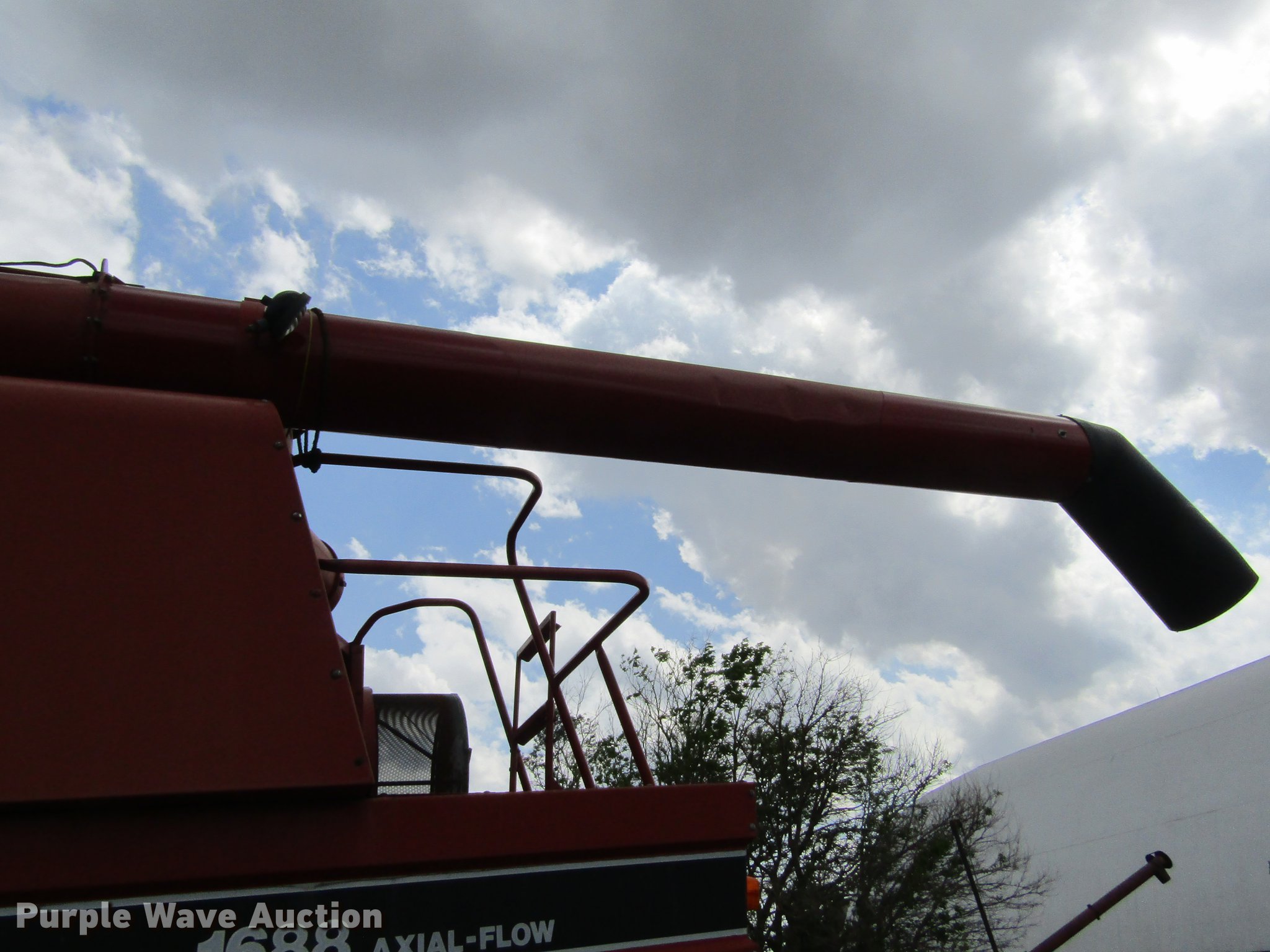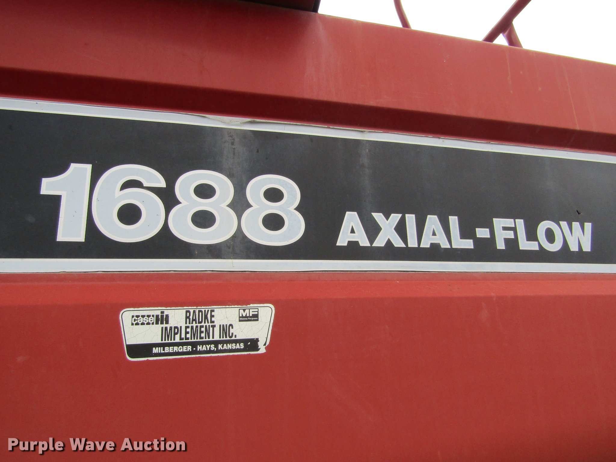 1994 Case IH 1688 Axial-Flow combine. 4,478 engine hours on meter, Six cylinder turbo diesel engine Model 6TA830, Serial 44976039, Hydrostatic transmission 3F-3R gears, Feederhouse Variable speed, Reverser, AC and heat, Tilt steering wheel, AM/FM, Suspension seat, Instructors seat, Round and small wire concaves, Bin extensions, Work lights, 30.5L-32 front tires, 14.9x24 rear tires, Non-operational unloading auger Gearbox needs to be replaced, Serial JJC0121038. Ransom, KS 67572
