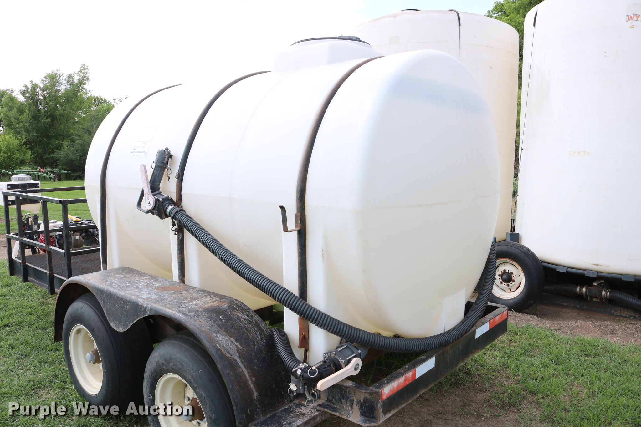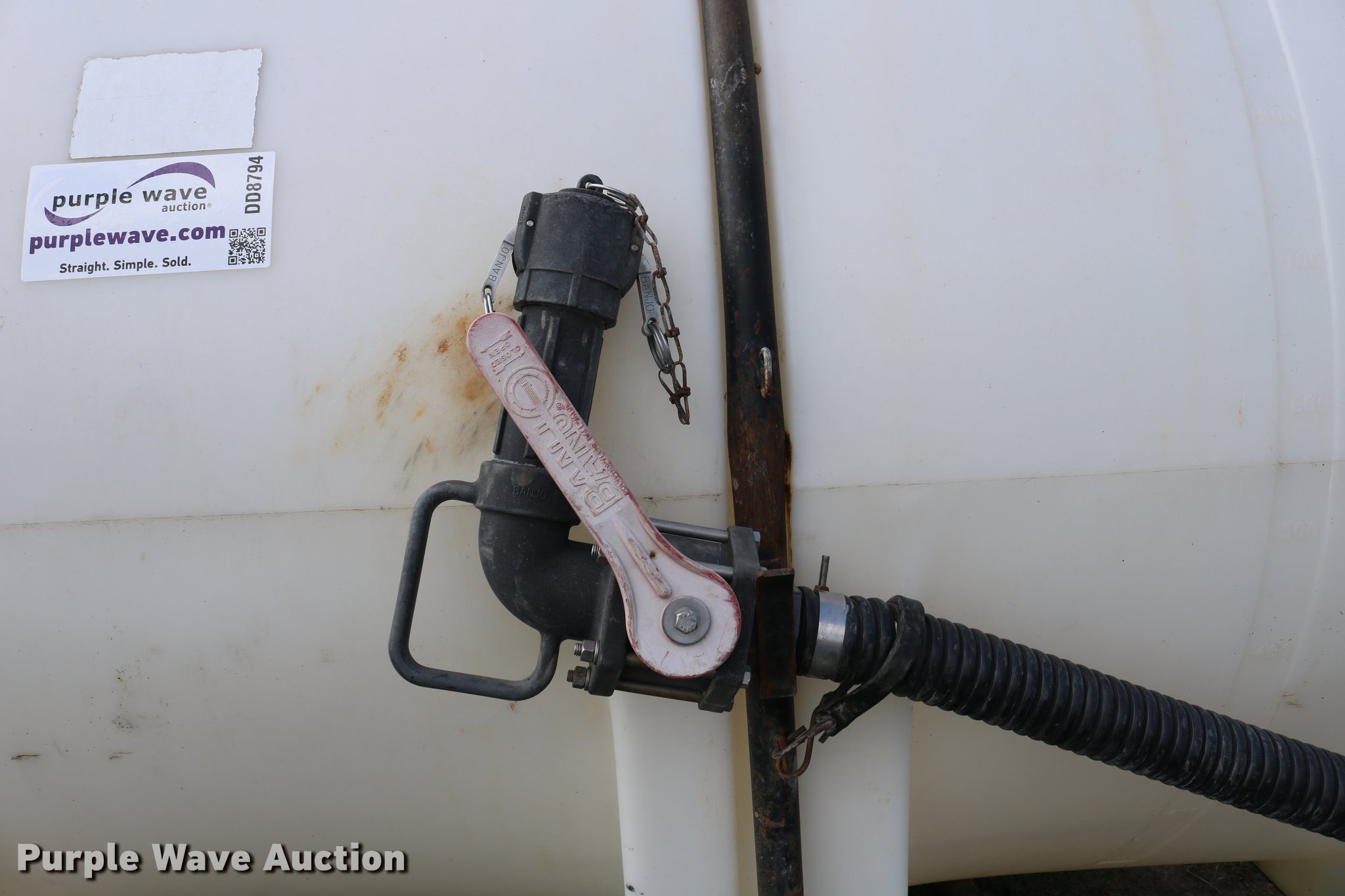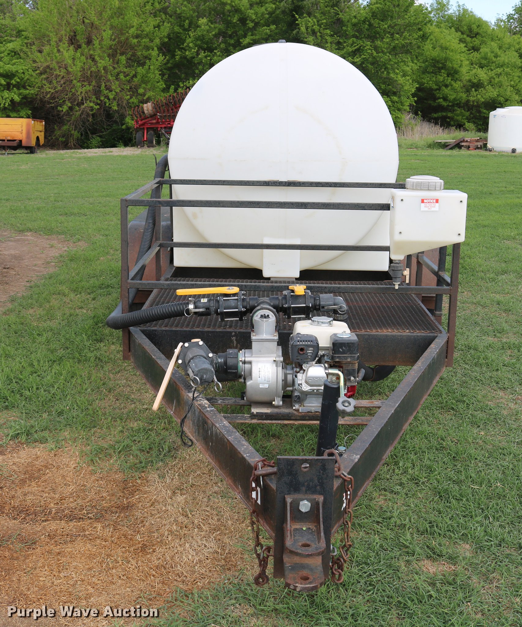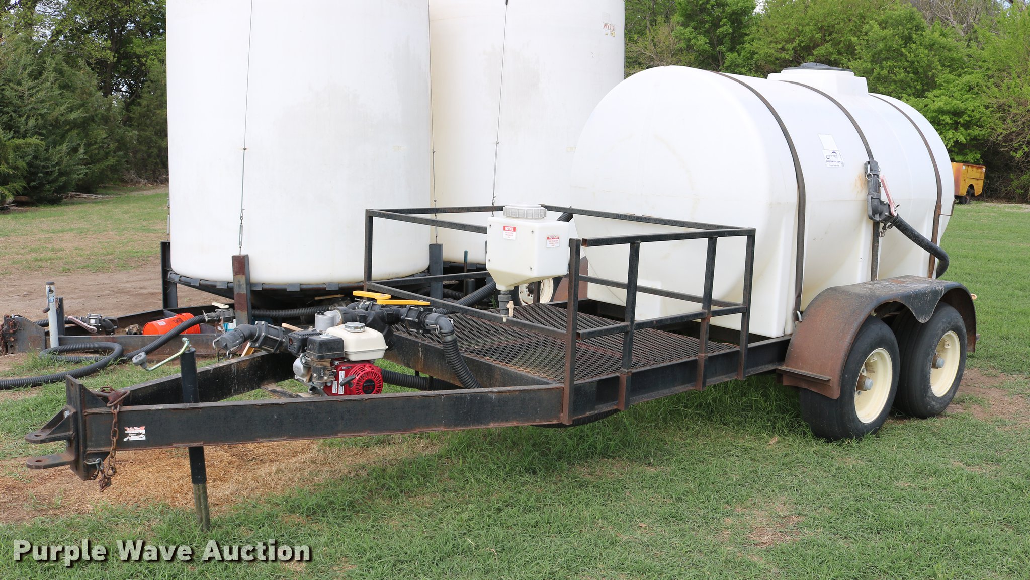 Purple Wave is selling a used Tank Trailer in Kansas. This item is a Nurse tank trailer with the following: 19'L overall, 13'L x 85"W deck, 59" x 47" front storage platform, 1,000 gallon poly nurse tank, Approx. two gallon fresh water tank, Honda GX160 163 C.I.D. one cylinder gas engine, Recoil start, Hypro 1573-SPX pump, 280 gpm capacity, 3" x 3" NPT port, Pin hitch, Single leg landing gear, Spring suspension, Tandem axle, 11L-15 tires