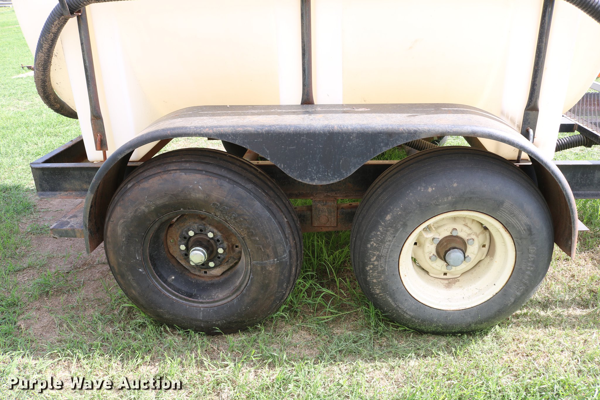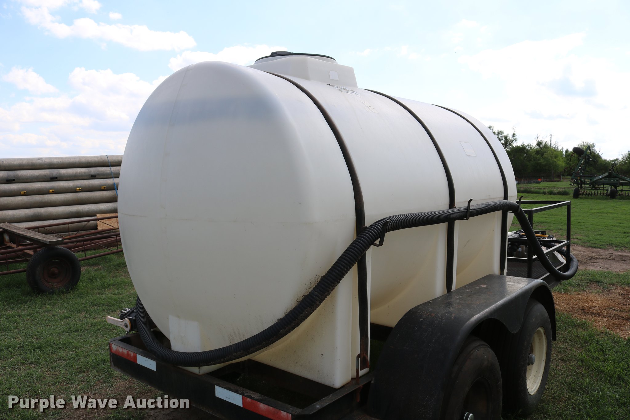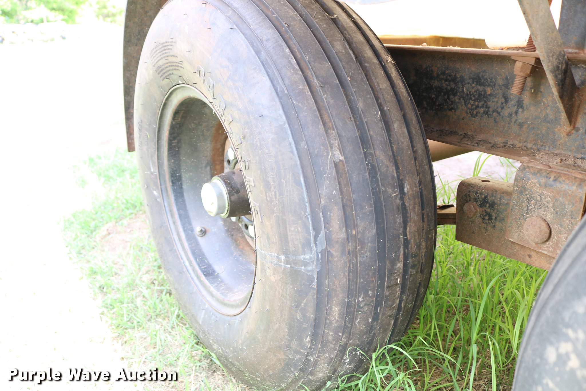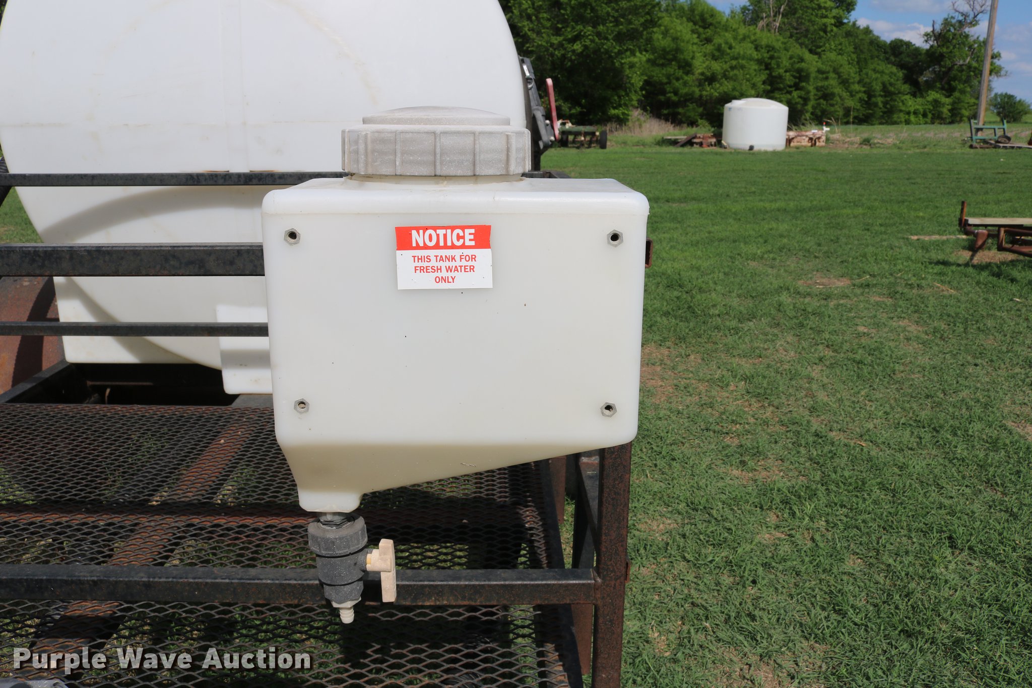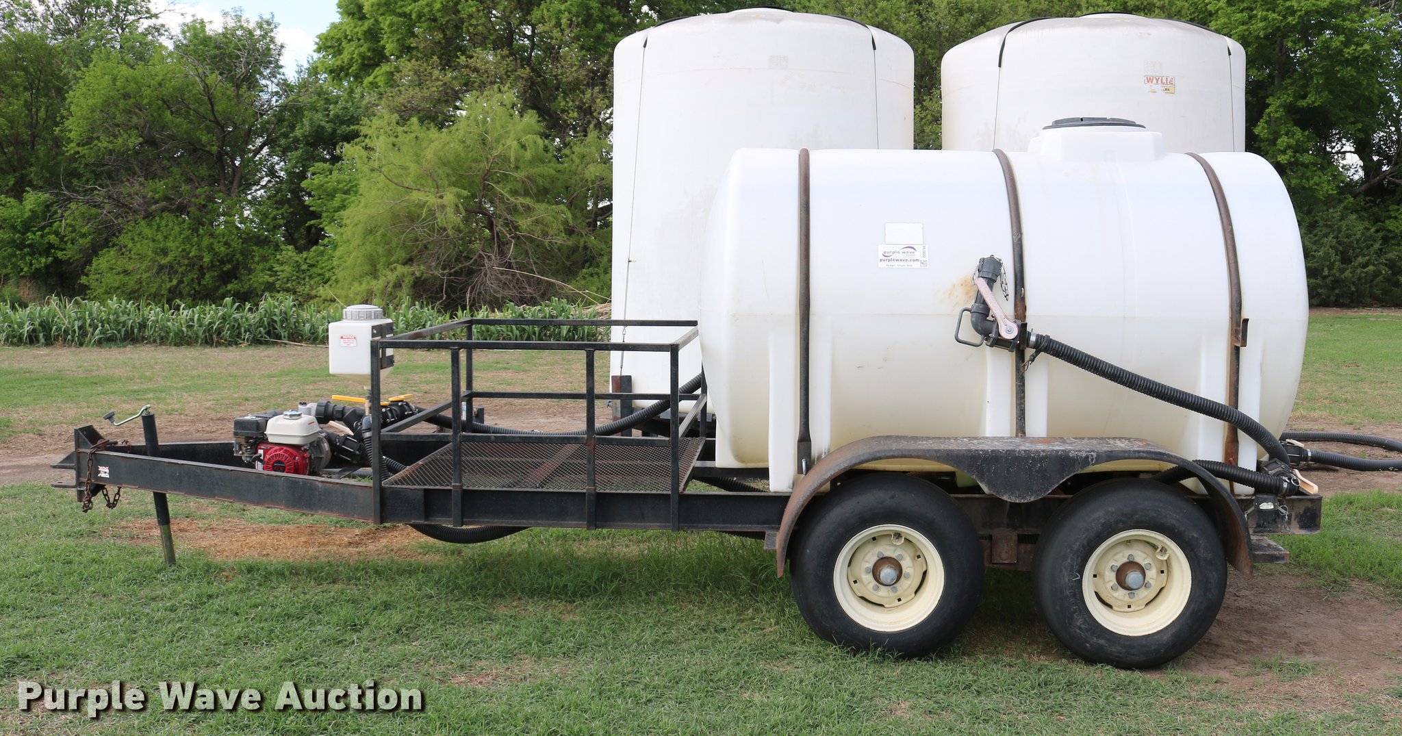 Purple Wave is selling a used Tank Trailer in Kansas. This item is a Nurse tank trailer with the following: 19'L overall, 13'L x 85"W deck, 59" x 47" front storage platform, 1,000 gallon poly nurse tank, Approx. two gallon fresh water tank, Honda GX160 163 C.I.D. one cylinder gas engine, Recoil start, Hypro 1573-SPX pump, 280 gpm capacity, 3" x 3" NPT port, Pin hitch, Single leg landing gear, Spring suspension, Tandem axle, 11L-15 tires