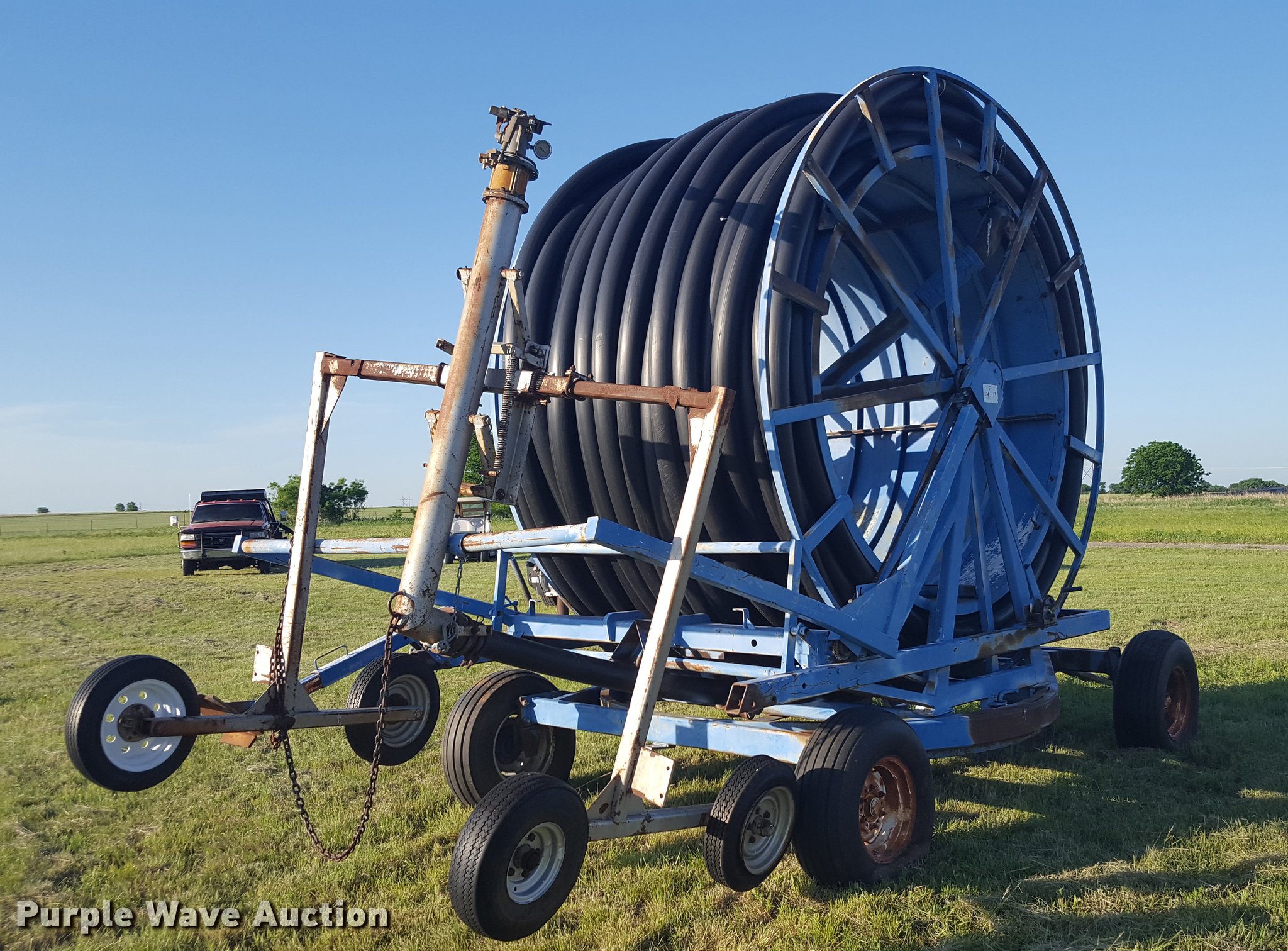 Purple Wave is selling a used Hose Reel in Oklahoma. This item is a Long irrigation gun reel with the following: Quarter mile reel, 4" pipe, 212cc gas engine, Clevis hitch, 4.80-12 gun cart tires, 11L-15 reel cart tires, Serial 1023