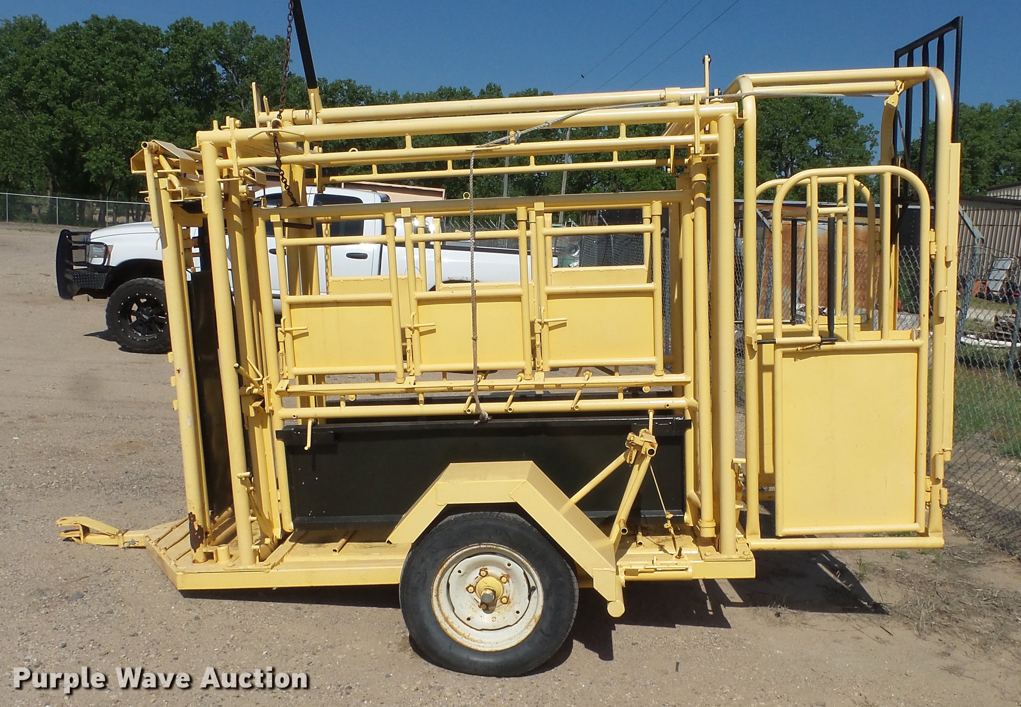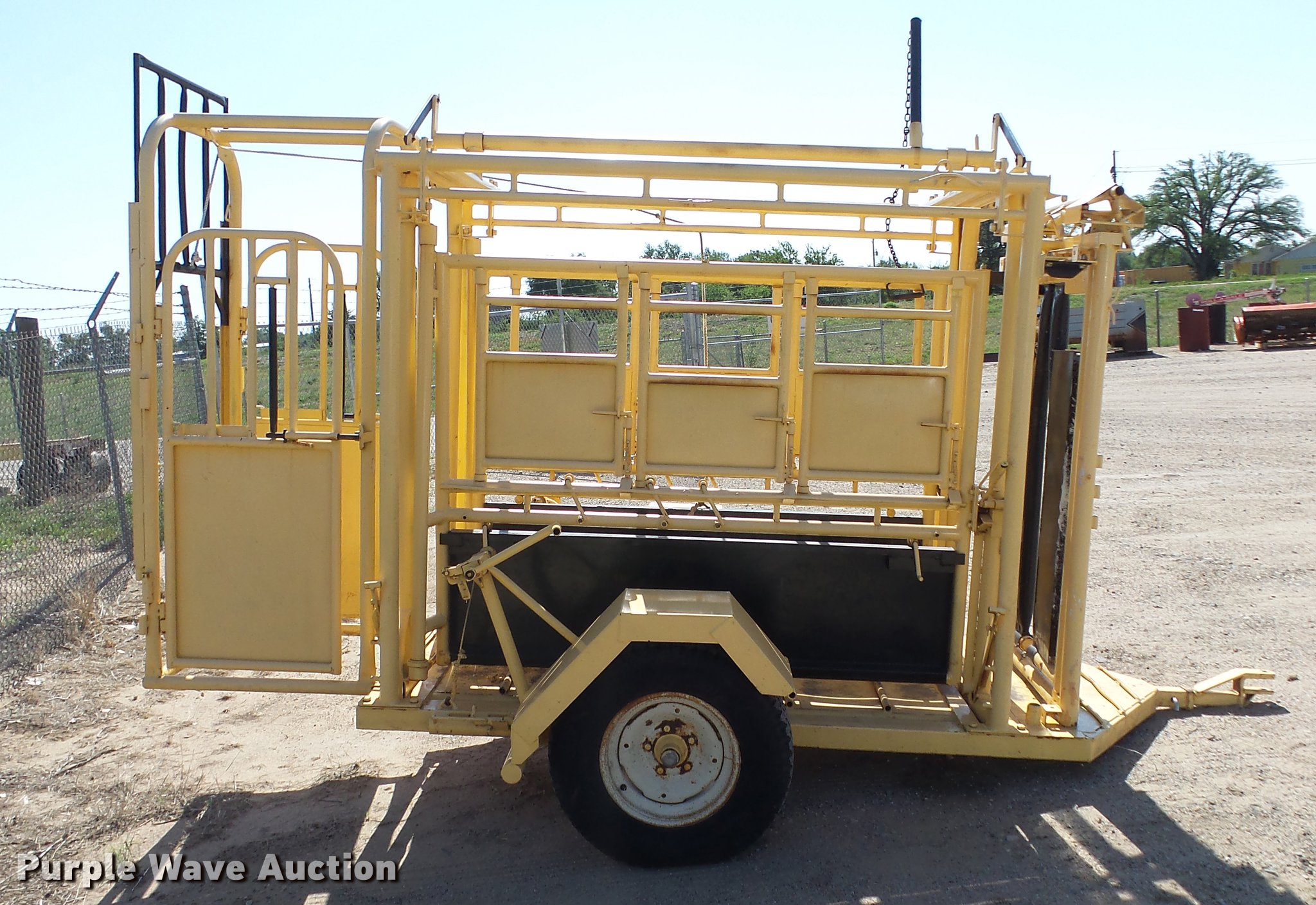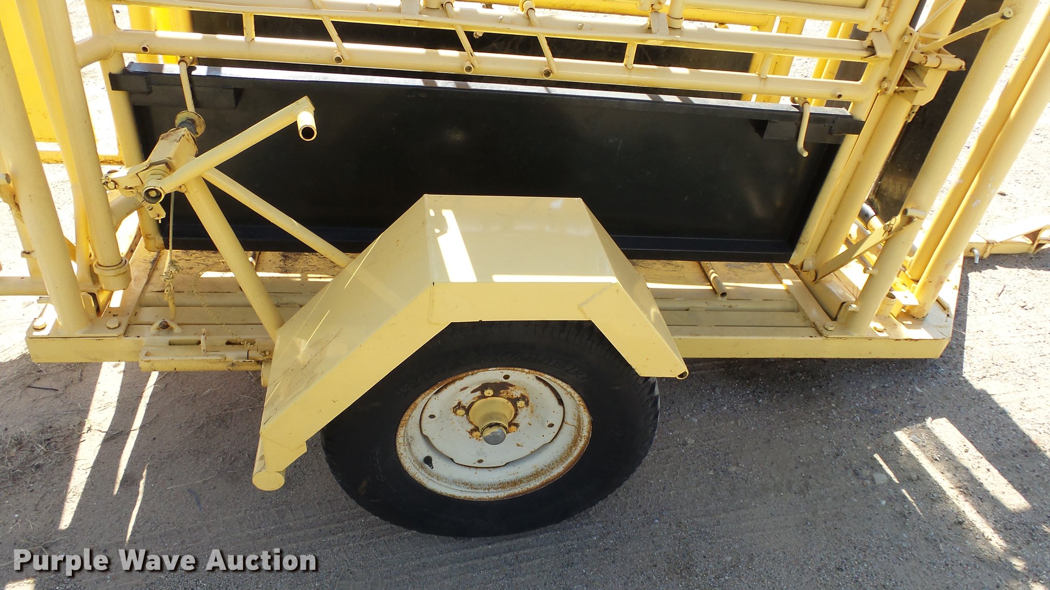 Purple Wave is selling a used Livestock Equip. in Kansas. This item is a Squeeze chute with the following: Approx. 10.5'L x 50"W, Steel floor, Manual squeeze, Full fenders, Pin hitch, 235/75R15 tires