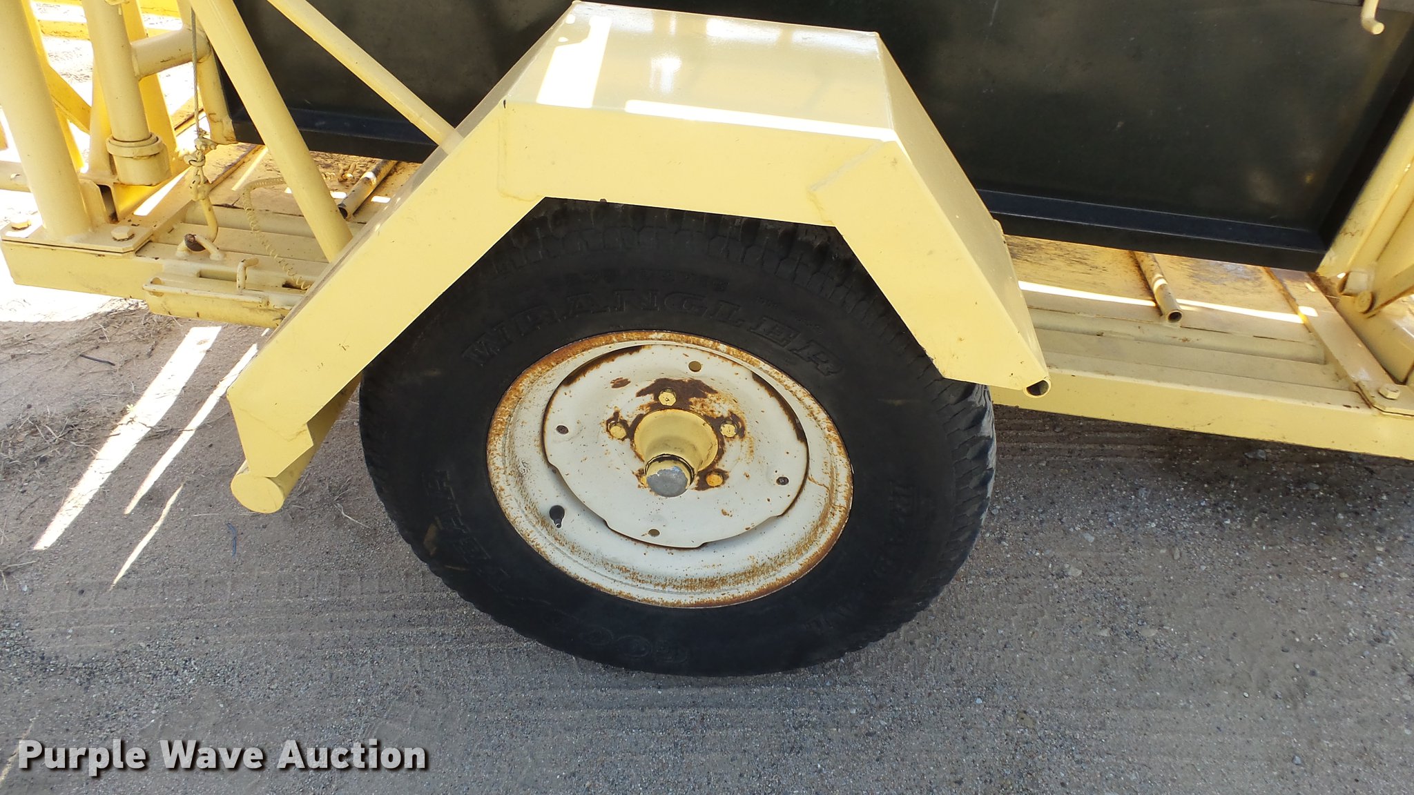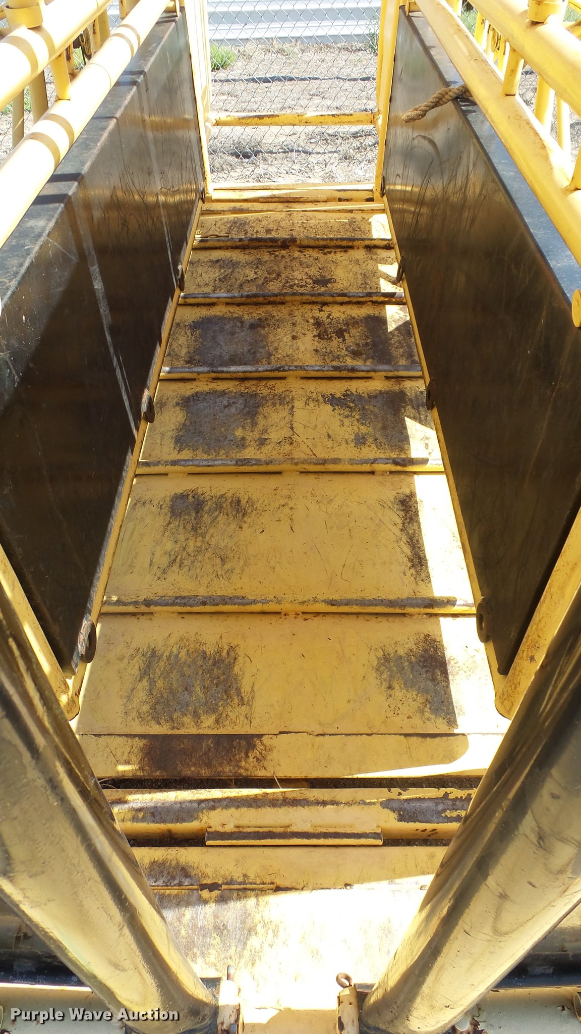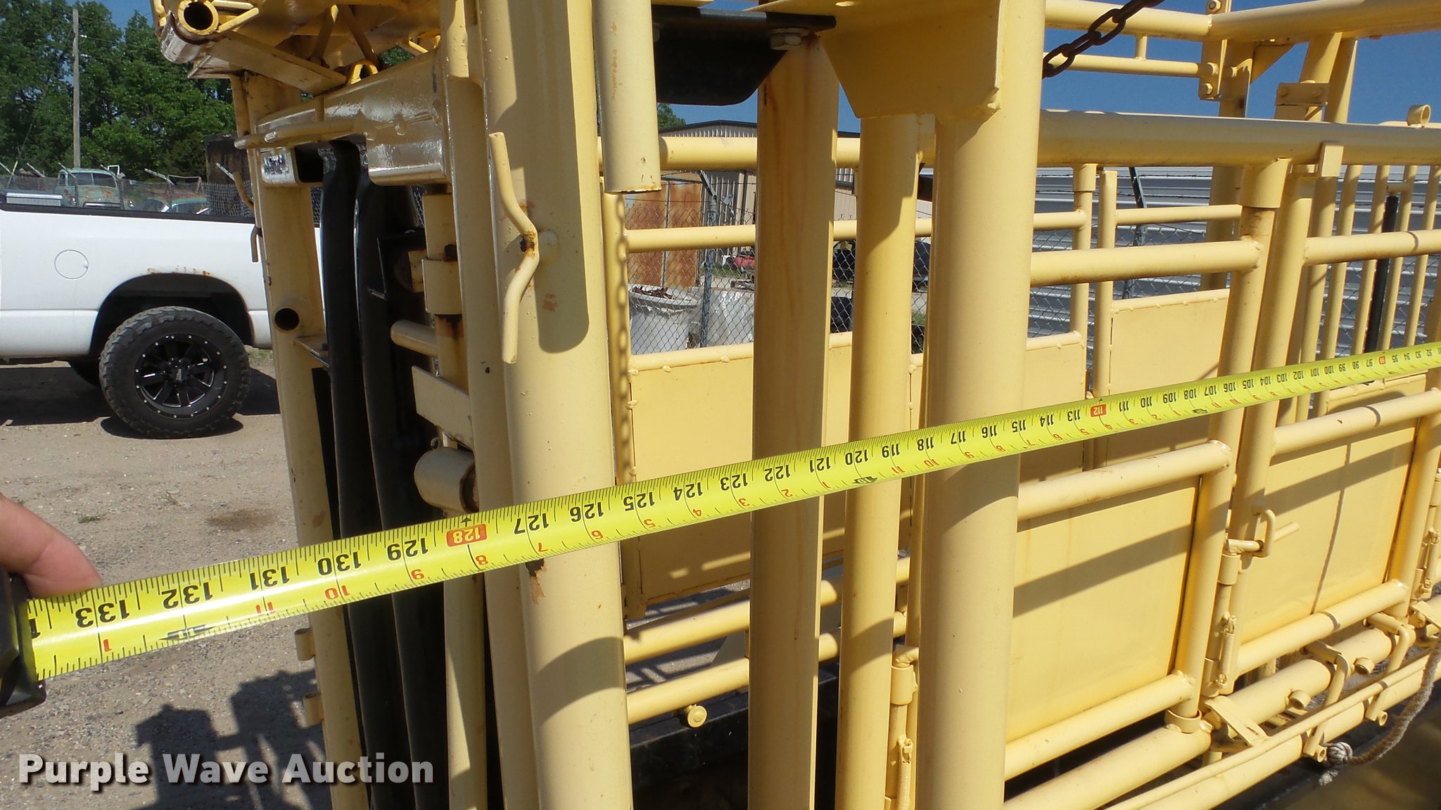 Purple Wave is selling a used Livestock Equip. in Kansas. This item is a Squeeze chute with the following: Approx. 10.5'L x 50"W, Steel floor, Manual squeeze, Full fenders, Pin hitch, 235/75R15 tires