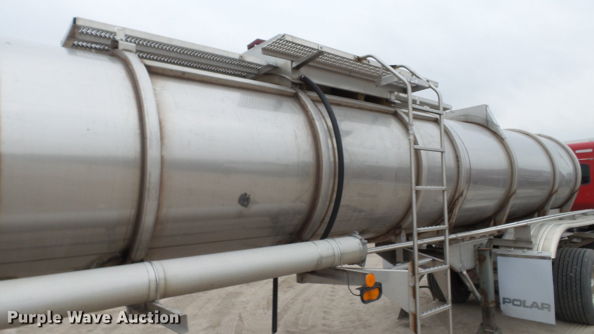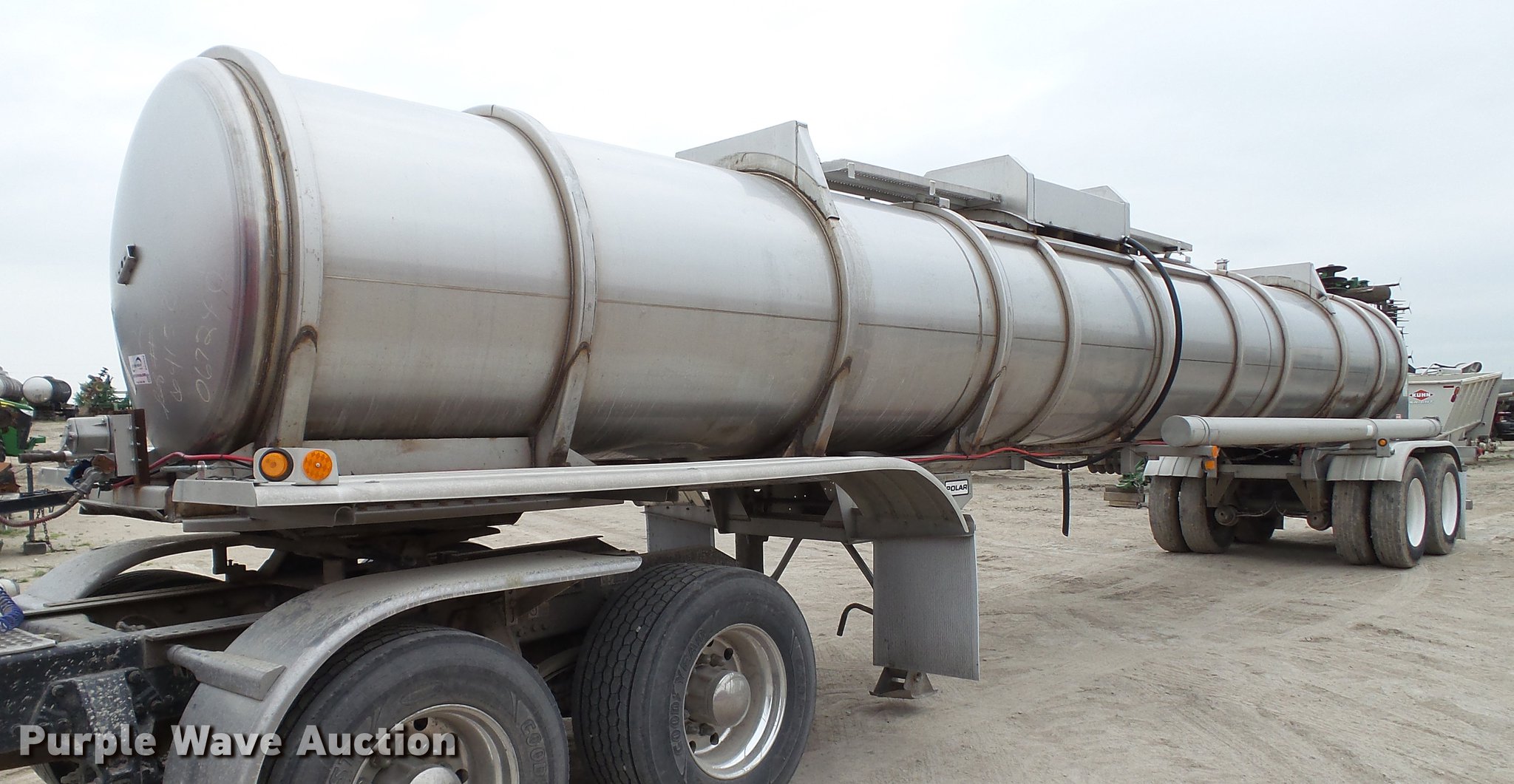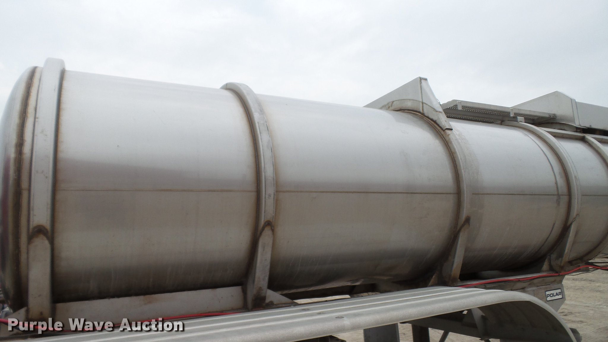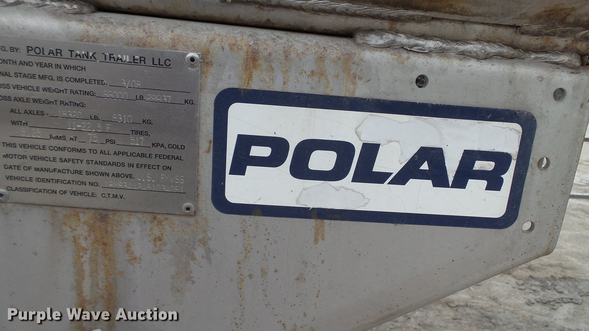 Purple Wave is selling a used Tank Trailer in Illinois. This item is a 2008 Polar tank trailer with the following: 43.5'L x 95"W, 5,000 gallon stainless steel tank, Manway/manhole, Pump, 3" outlet, Fifth wheel plate, Dual leg two speed landing gear, Air suspension, Air brakes, Tandem axle, Steel wheels, 285/75R24.5 tires, GVWR 66,000 lbs, GAWR 18,320 lbs